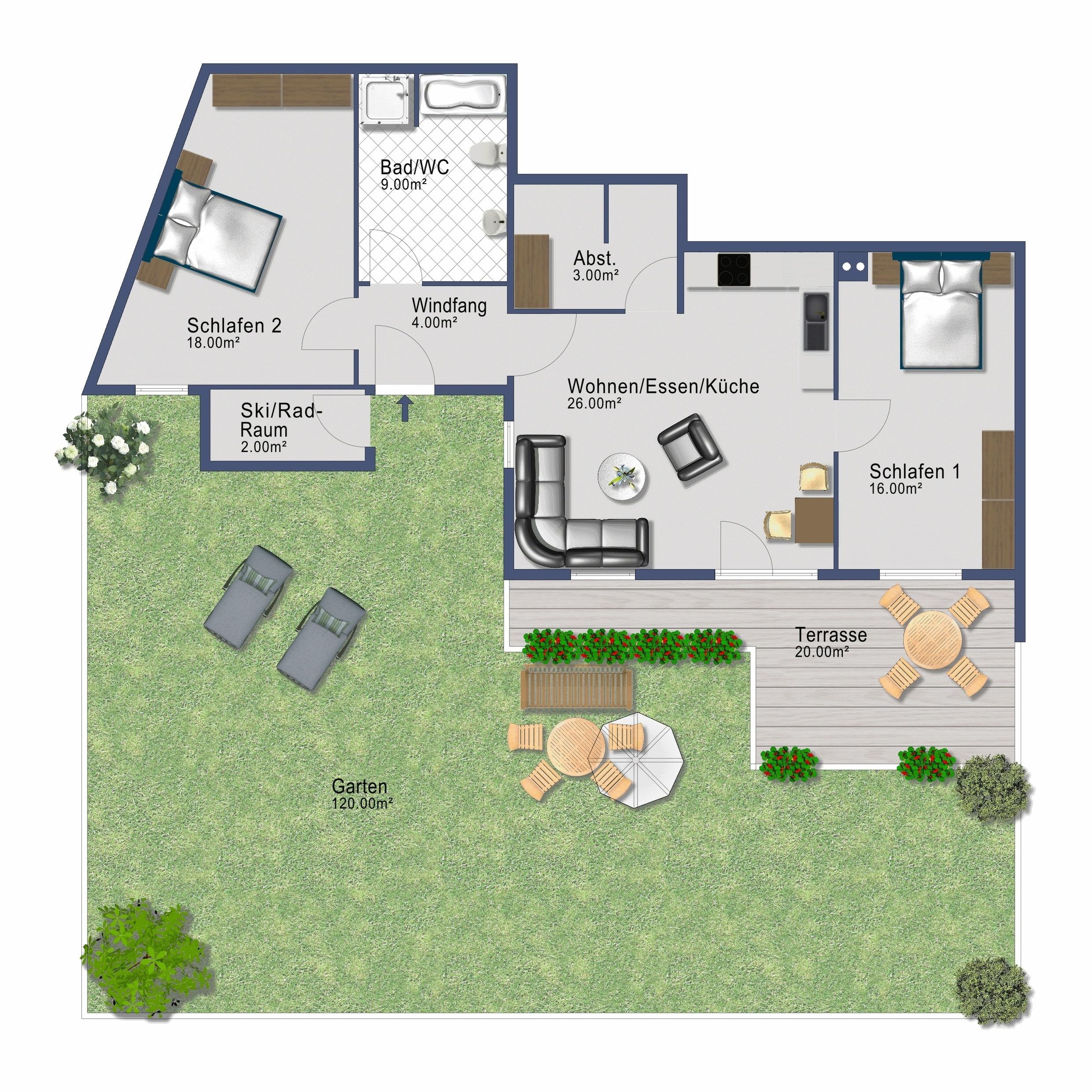 Garten-Terrasse mit Gartenmöbeln, Sonnenschirm und Relax-Liegen
