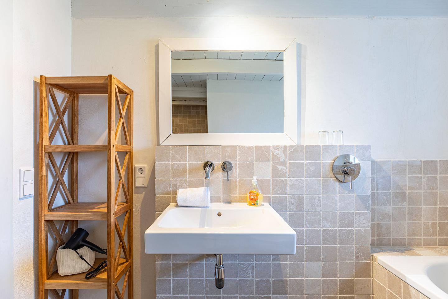 Das Badezimmer überzeugt mit bodengleicher Dusche, Badewanne, Waschbecken, WC, Fenster, Spiegel, Kosmetikspiegel und Haartrockner. Für besondere Entspannung sorgt die private Sauna. Fußbodenheizung, Gasheizung und ein Kaminofen gewährleisten zu jeder Jahreszeit ein angenehmes Wohnklima.