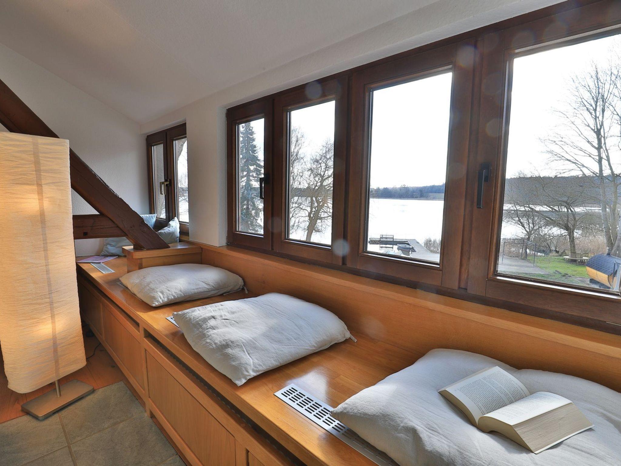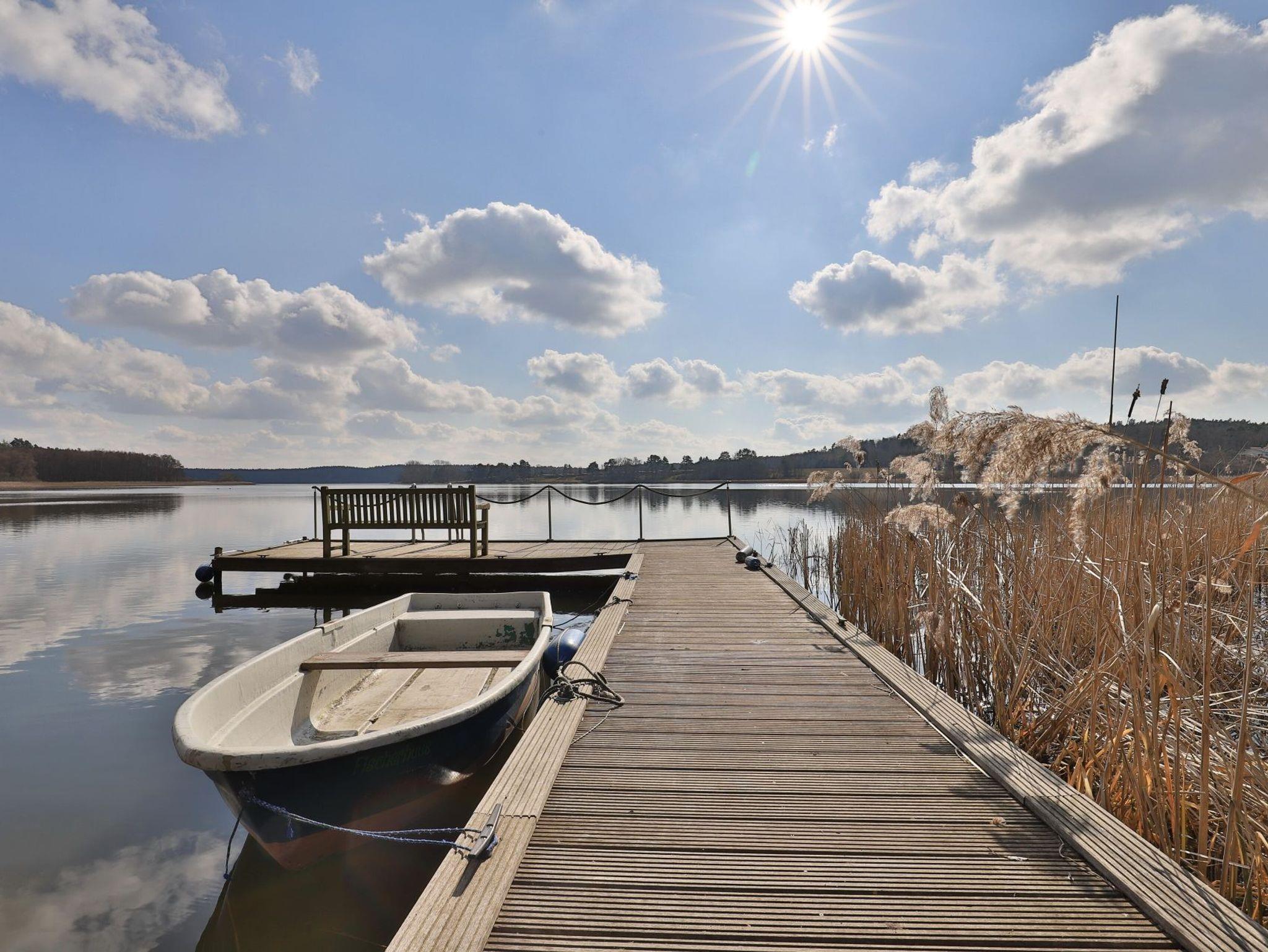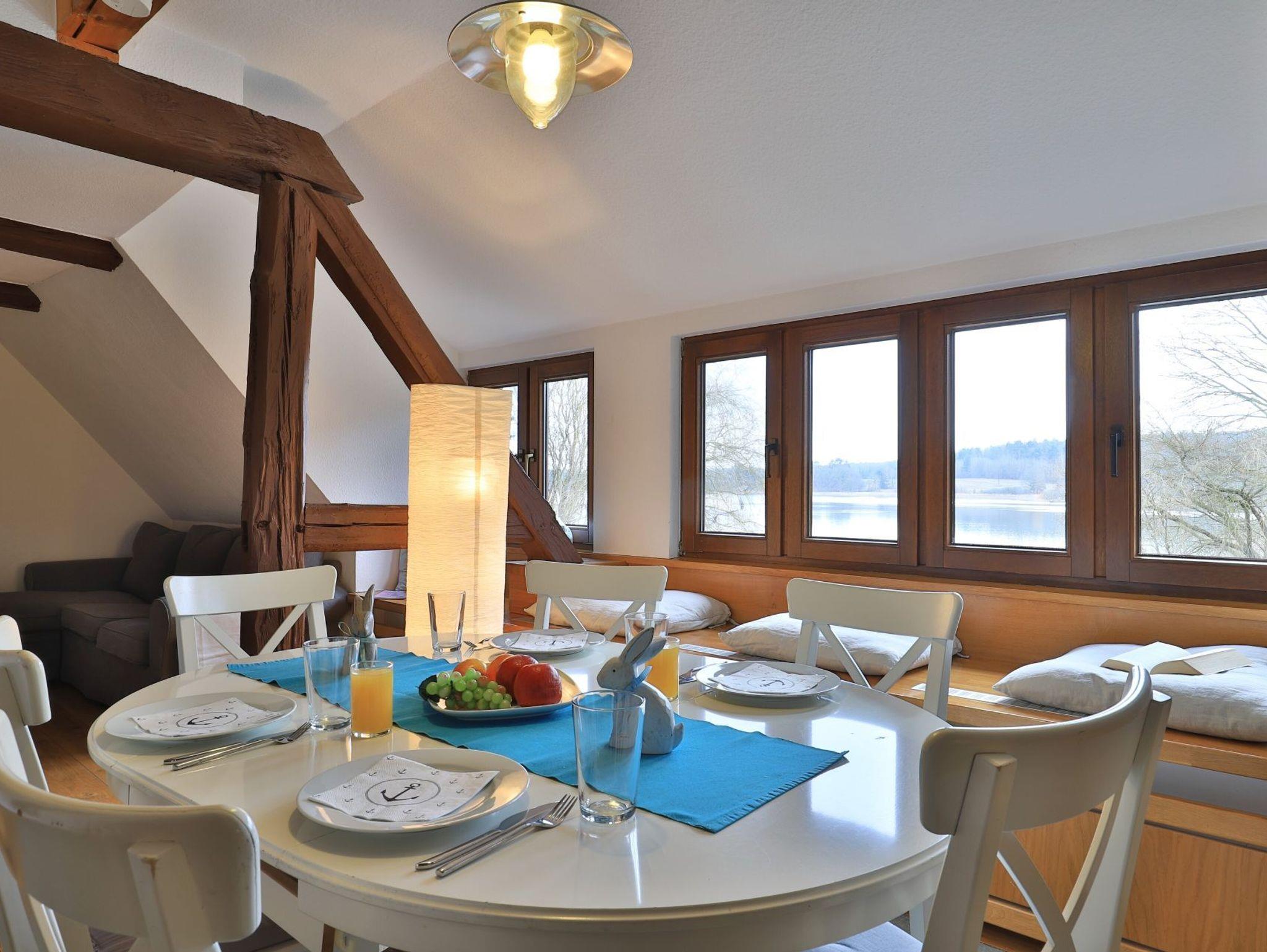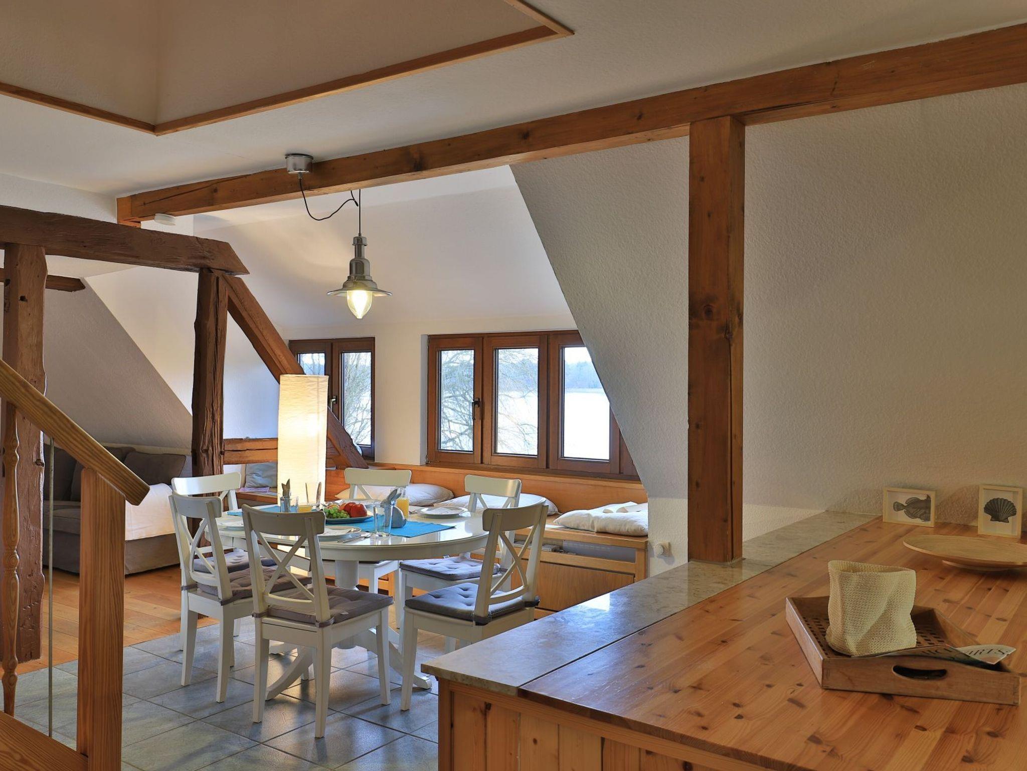 Erholung pur bietet die behagliche 3- Zimmer Ferienwohnung Sonnenaufgang, die sich als Maisonettenwohnung mit einer Wohnfläche von 74qm über zwei Ebenen erstreckt. Für bis zu 4 Personen bietet das attraktive Feriendomizil mit Seeblick beste Wohnqualität. Entspannte Stunden verbringen Sie im freundlichen Wohn-Essbereich mit Kaminofen, Sofa, Esstisch, 2. Sitzbereich zudem Fensterbank Sitzmöglichkeit mit Blick auf den See. Auch ein Fernseher und eine Musikanlage sind vorhanden. Des Weiteren bietet die voll ausgestattete, integrierte Küchenzeile alle technischen Voraussetzungen zur Zubereitung Ihrer Mahlzeiten. Herd, Backofen, Mikrowelle sowie Geschirrspüler, Kaffeemaschine, Wasserkocher und Toaster. Das großzügige Tageslichtbad empfängt Sie mit einer Dusche und einer Eckbadewanne zudem sorgt ein Handtuchheizkörper für wohlige Wärme. Über eine Treppe gelangen Sie in den Schlafbereich, wo sich ein separates Schlafzimmer mit Doppelbett und Kleiderschrank sowie ein Galerieschlafzimmer mit Doppelbett befinden. Die Nutzung von Waschmaschine und Wäschetrockner ist im Haus möglich. Für Ihren PKW ist ein kostenfreier Stellplatz vorhanden. Das große Gartengelände sowie der hauseigene Bade Steg steht allen Gästen zur Verfügung. Bitte beachten Sie, dass es sich hier um eine Nichtraucher Wohnung handelt, in der Haustiere nicht gestattet sind.