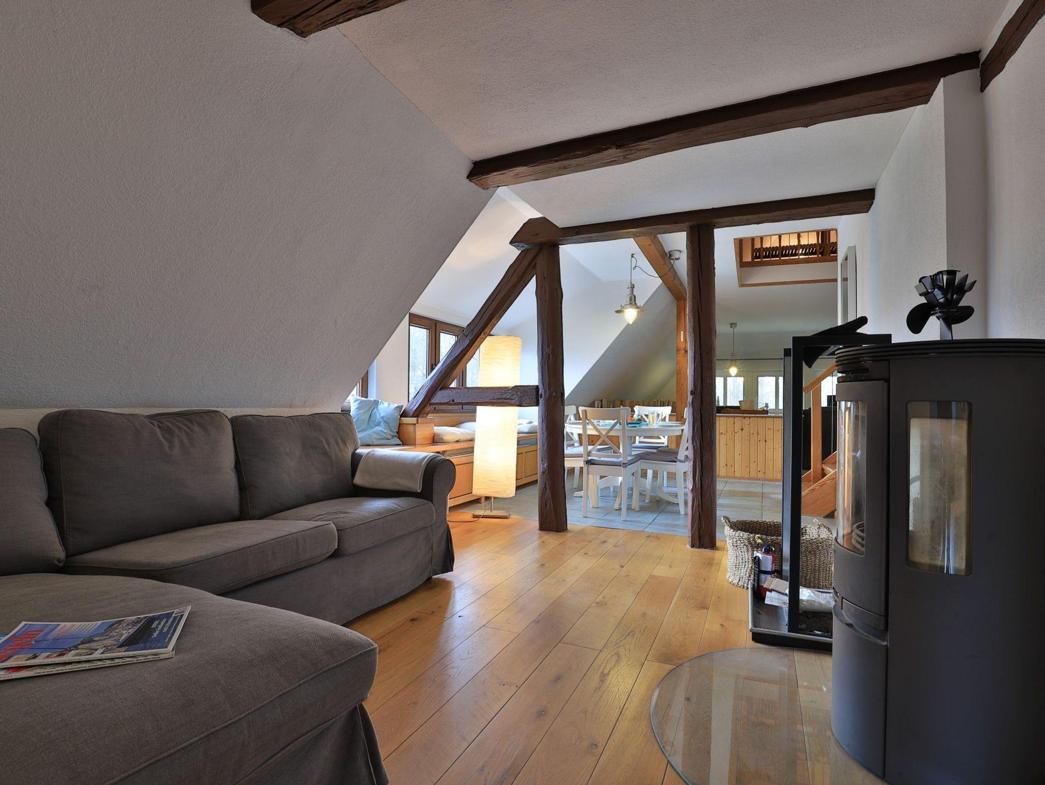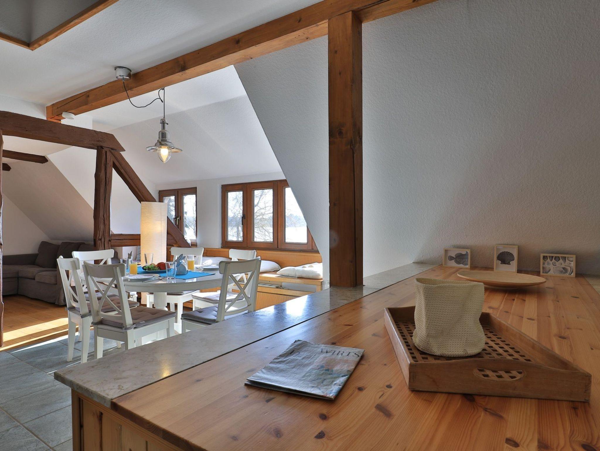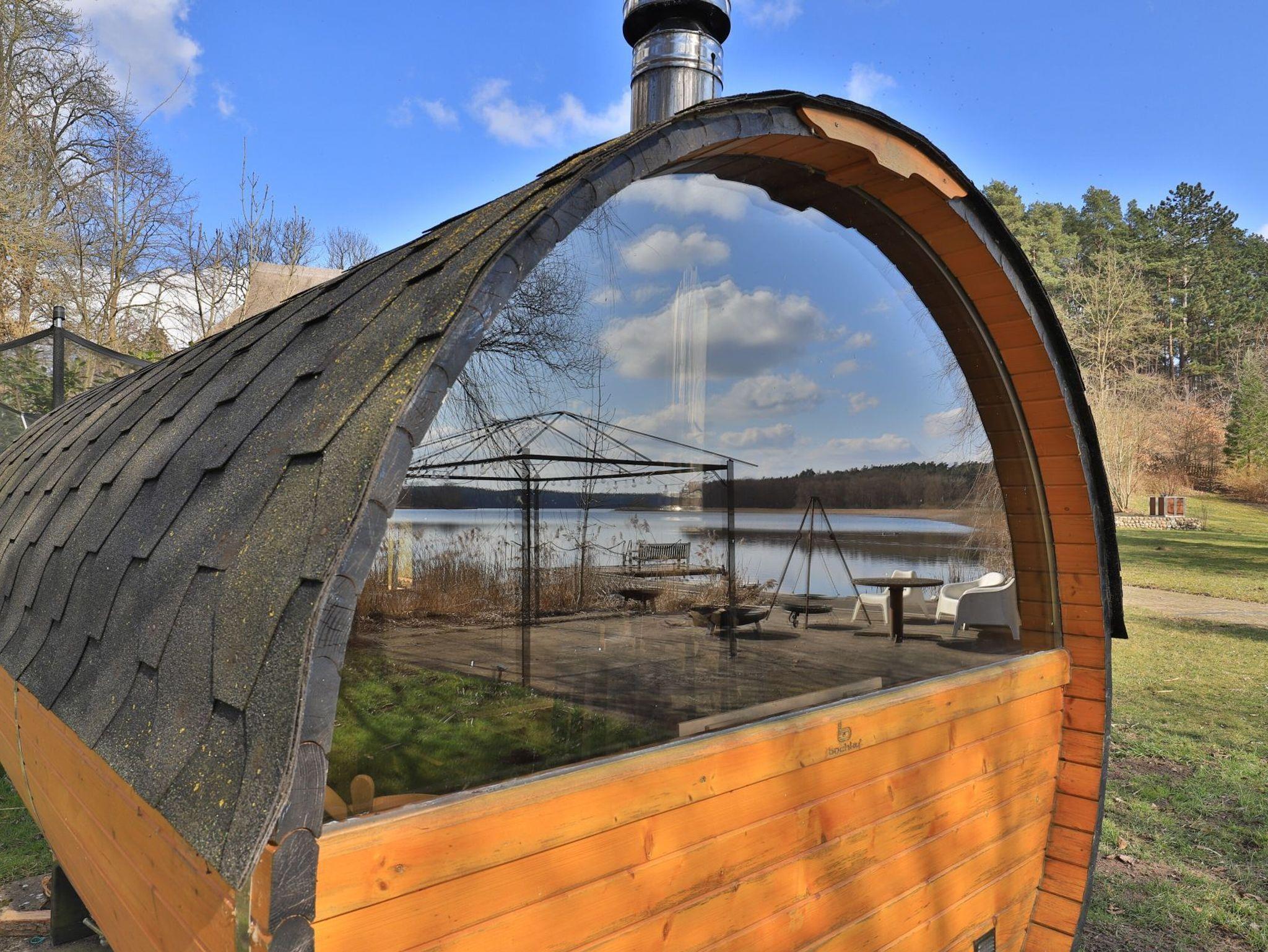 Erholung pur bietet die behagliche 3- Zimmer Ferienwohnung Sonnenaufgang, die sich als Maisonettenwohnung mit einer Wohnfläche von 74qm über zwei Ebenen erstreckt. Für bis zu 4 Personen bietet das attraktive Feriendomizil mit Seeblick beste Wohnqualität. Entspannte Stunden verbringen Sie im freundlichen Wohn-Essbereich mit Kaminofen, Sofa, Esstisch, 2. Sitzbereich zudem Fensterbank Sitzmöglichkeit mit Blick auf den See. Auch ein Fernseher und eine Musikanlage sind vorhanden. Des Weiteren bietet die voll ausgestattete, integrierte Küchenzeile alle technischen Voraussetzungen zur Zubereitung Ihrer Mahlzeiten. Herd, Backofen, Mikrowelle sowie Geschirrspüler, Kaffeemaschine, Wasserkocher und Toaster. Das großzügige Tageslichtbad empfängt Sie mit einer Dusche und einer Eckbadewanne zudem sorgt ein Handtuchheizkörper für wohlige Wärme. Über eine Treppe gelangen Sie in den Schlafbereich, wo sich ein separates Schlafzimmer mit Doppelbett und Kleiderschrank sowie ein Galerieschlafzimmer mit Doppelbett befinden. Die Nutzung von Waschmaschine und Wäschetrockner ist im Haus möglich. Für Ihren PKW ist ein kostenfreier Stellplatz vorhanden. Das große Gartengelände sowie der hauseigene Bade Steg steht allen Gästen zur Verfügung. Bitte beachten Sie, dass es sich hier um eine Nichtraucher Wohnung handelt, in der Haustiere nicht gestattet sind.