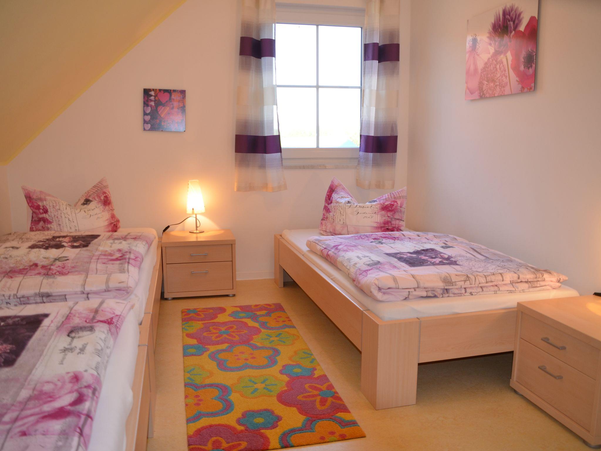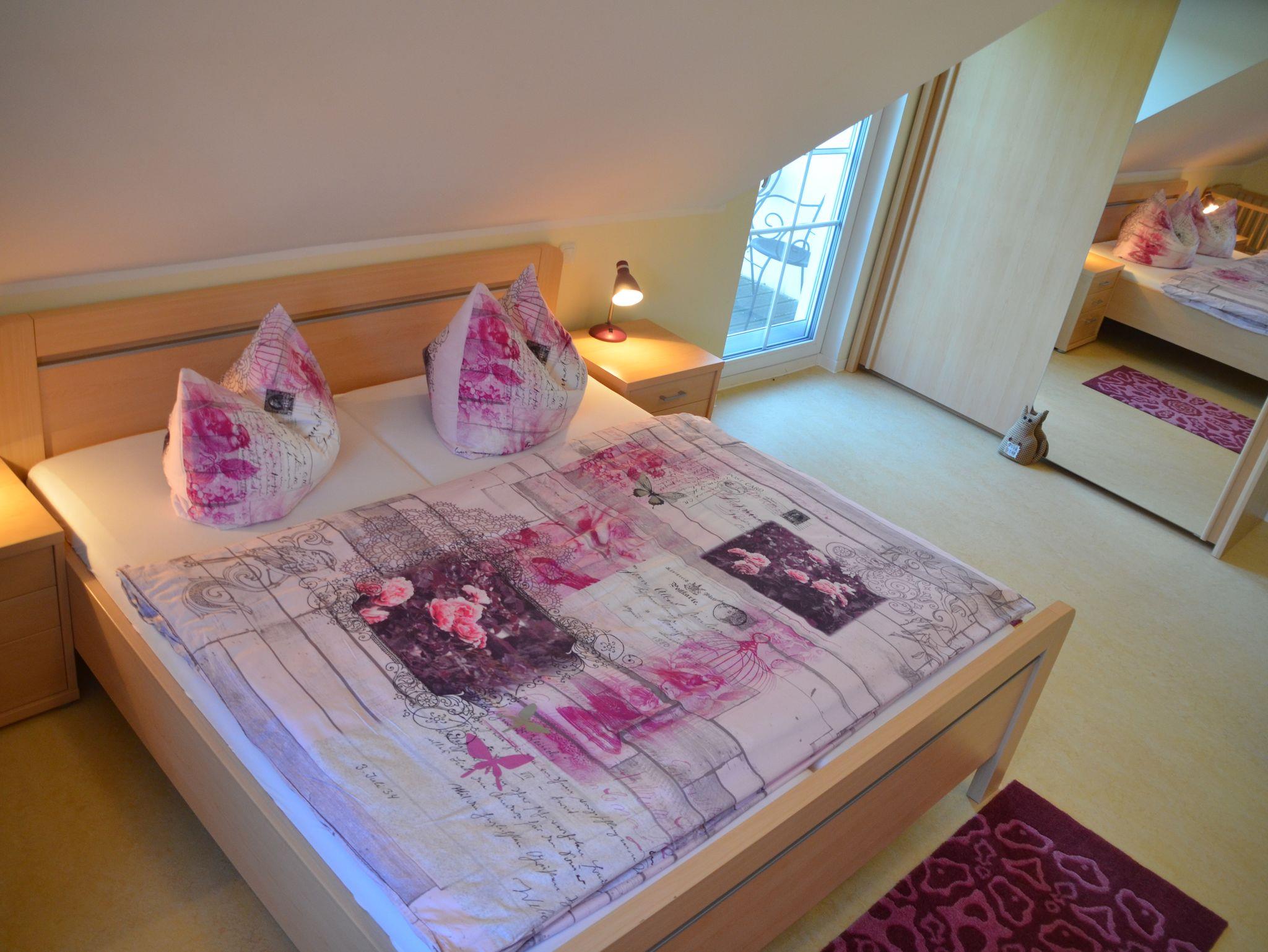Im Eingangsbereich gibt es eine große Garderobenbereich von dem ab führt eine Treppe nach oben zu zwei getrennten Schlafräumen. Der Eltern-Schlafraum hat ein Doppelbett, eine Couch und einen Balkon. Der zweite Schlafraum hat drei Einzelbetten und einen begehbaren Kleiderschrank. Im Obergeschoß befindet sich außerdem noch das Badezimmer mit Dusche und WC.
