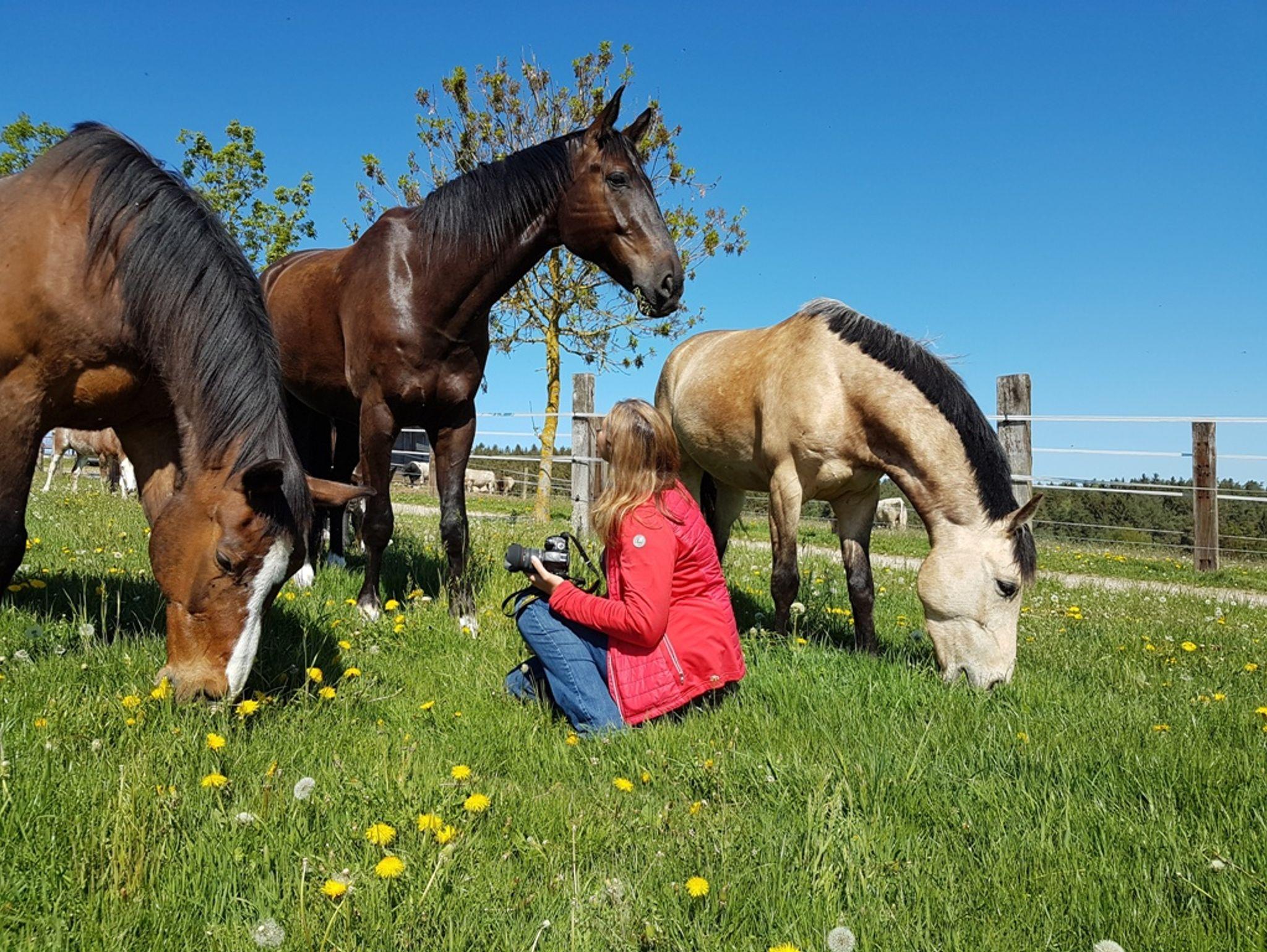 Von der eigenen Terrasse aus haben Sie Blick über Wiesen und Felder, zu Pferdekoppeln und angrenzenden Wäldern.