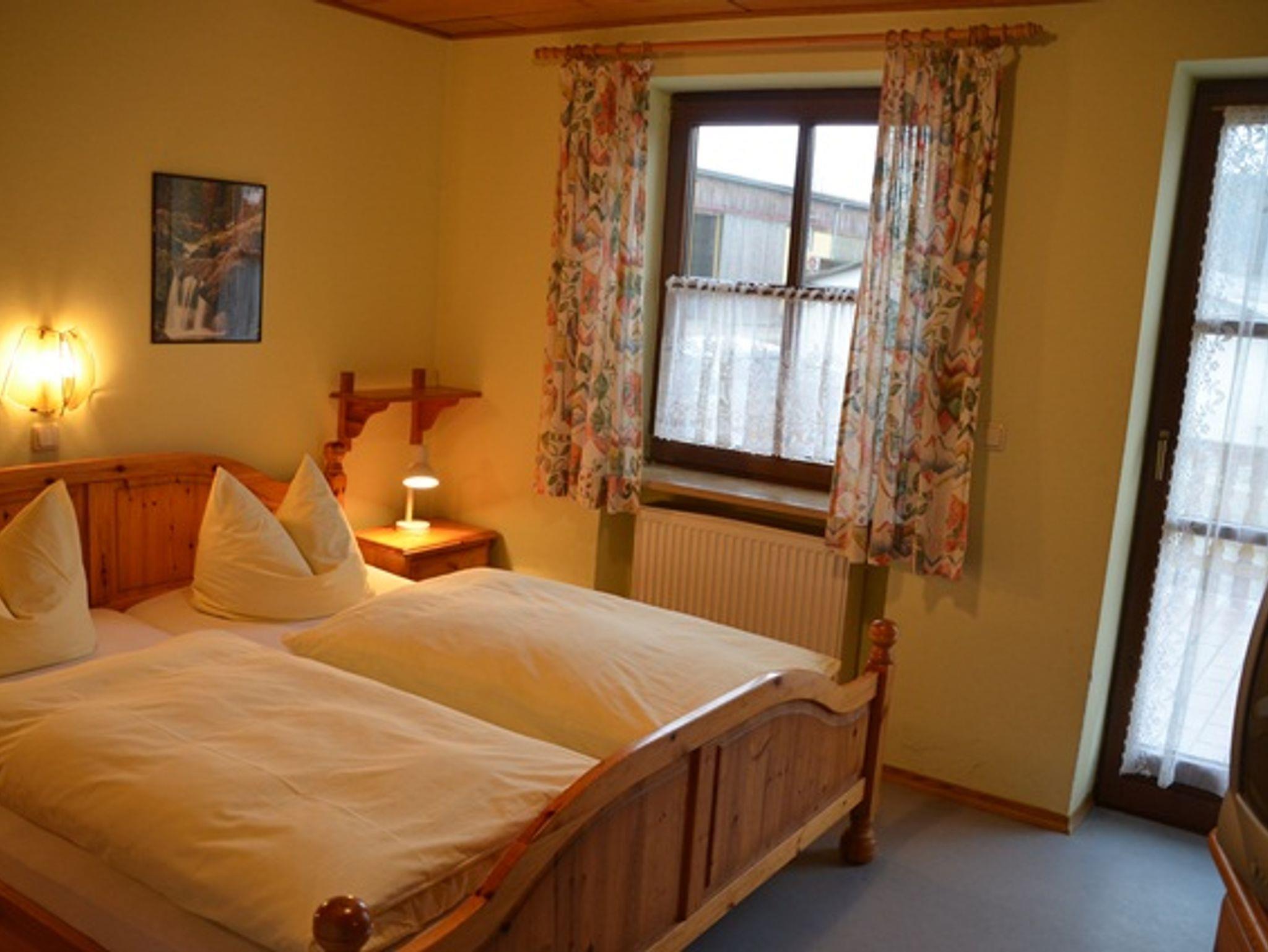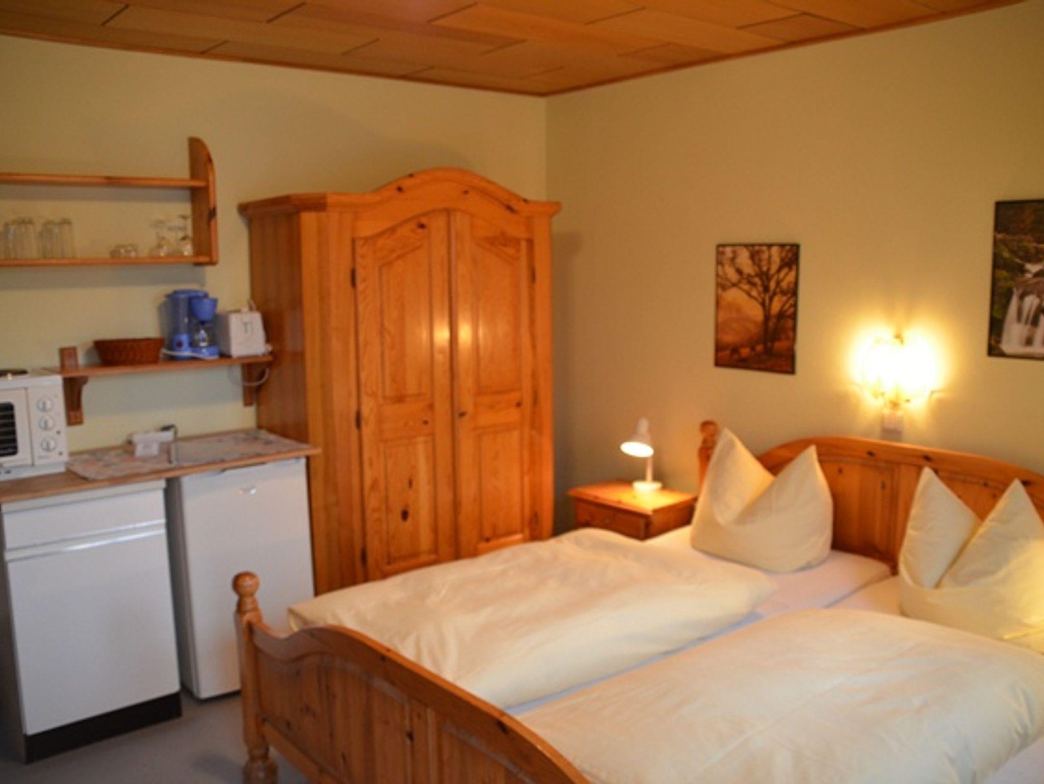 Hier wohnen Sie in einem Doppelzimmer (ca. 20 qm). Sie haben Zugang zu einer Gemeinschaftsterrasse. Sie haben ein gemütliches Doppelbett (keine Klappcouch!), einen TV und eine kleinen Küchenersatz (Zwei-Platten-Herd, Kühlschrank, Kaffeemaschine und einiges an Eßgeschirr). Im Badezimmer gibt es Dusche, WC und ein Waschbecken. Bettwäsche einmalig und Endreinigung ist im Preis bereits enthalten so wie noch zahlreiche weitere Extras bei uns auf dem Hof.