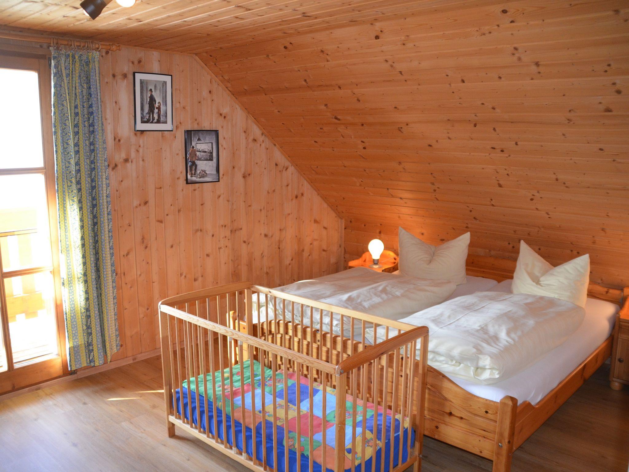 Im ersten Stock gibt es nochmals zwei getrennte Schlafräume. Ein Raum mit einem gemütlichen Doppelbett und Zugang zum Balkon. Der weitere Schlafraum hat ein Doppel- und zwei Einzelbetten. Bettwäsche einmalig und Endreinigung ist im Preis bereits enthalten so wie noch zahlreiche weitere Extras bei uns auf dem Hof. Falls benötigt, stellen wir gern ein Kindergitterbett und Kinderhochstuhl bereit.