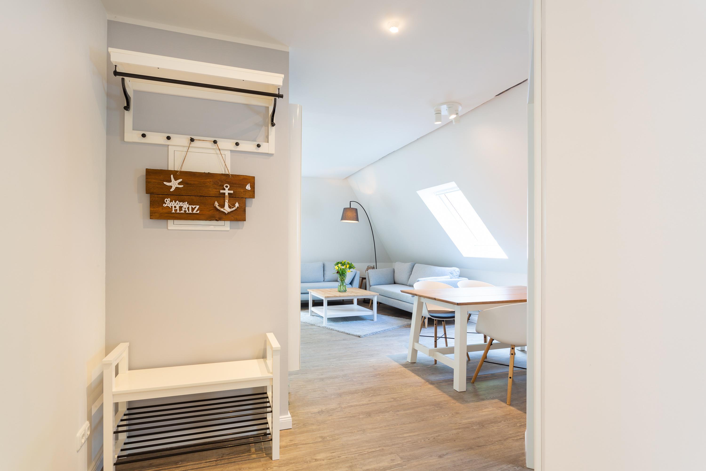 Das Apartment Süd-West ist die ideale Unterbringung für Euch als Familie. Mittelpunkt der ca. 60 Quadratmeter großen Wohnung ist der helle Wohn- & Essbereich mit einer großen Sofalounge, Satelliten-TV und einem Esstisch für 4 Personen.