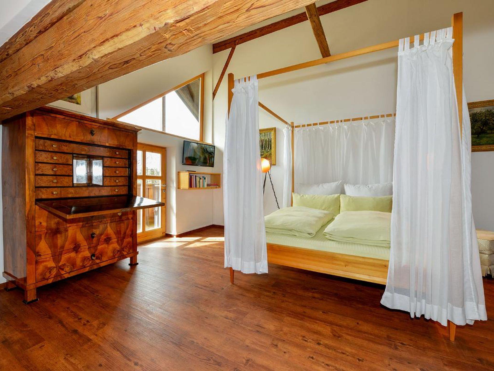 Auf dem Hof befinden sich 4 Ferienwohnungen, die mit viel Liebe zum Detail mit restaurierten Museumsstücken und modernen Elementen eingerichtet wurden. Die Appartemens sind mit SAT-TV, CD-Radio und kostenlosem WLAN ausgestattet. Jede Ferienwohnung hat einen eigenen Namen, eine eigene kulturhistorische Bedeutung. Kunst, Tradition, Geschichte und gelebte Kreativität sind wiederholt dialogisches Wechselspiel im Hofatelier Menacher, diesem einzigartigen Rückzugsort, diesem wundervollen Ort für Inspiration und tiefer Entspannung. Ganz im Zusammenspiel von Landschaft, Baudenkmal Höpflhof und guter Seele des Toni Menacher.