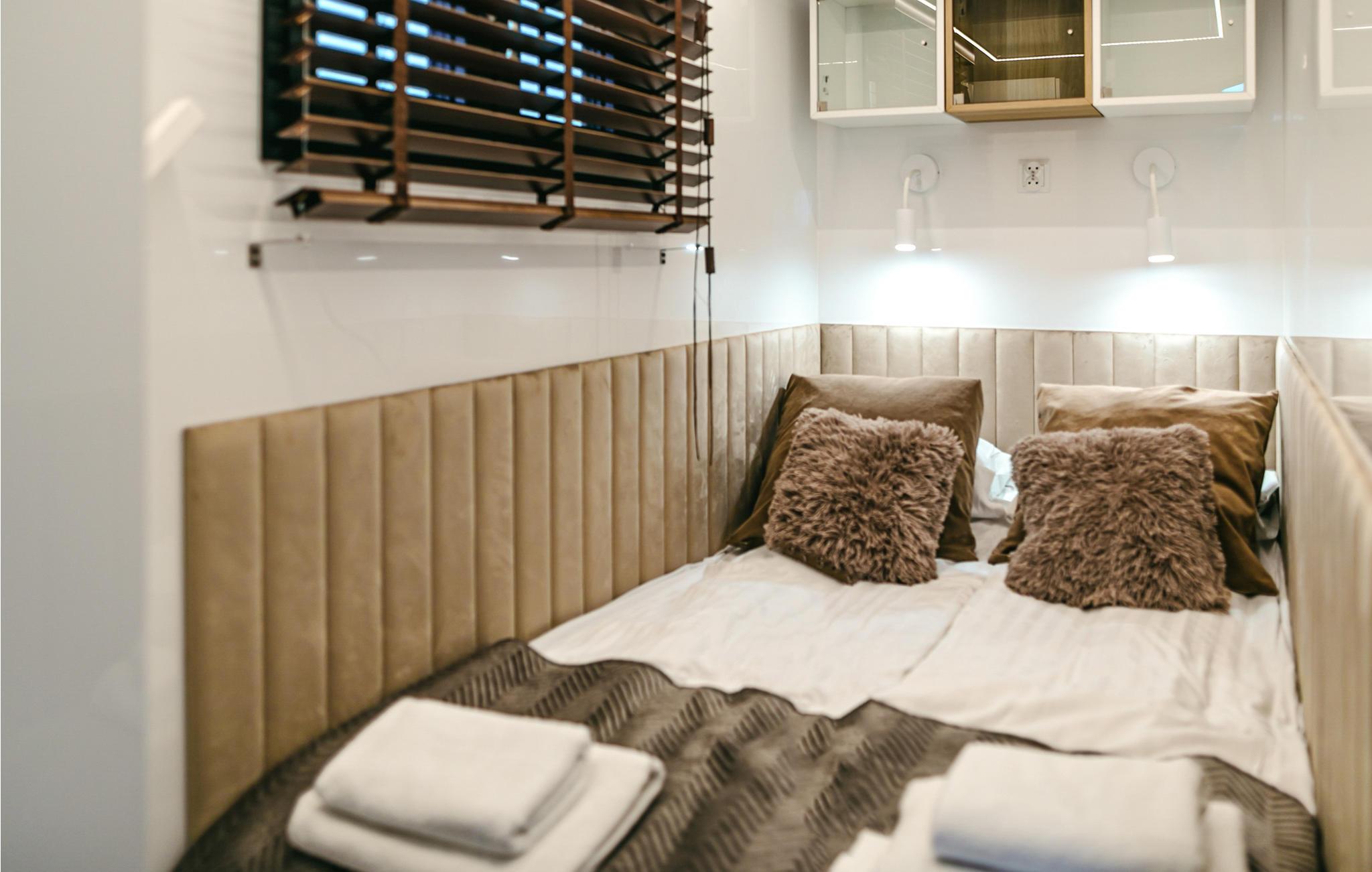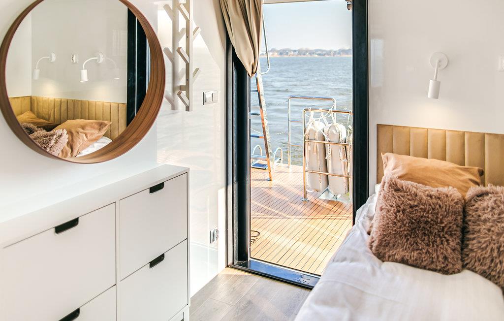 Denne husbåd har plads til maksimalt seks personer: Der er to sovekabiner med dobbeltseng og en ekstra sovesofa 130 x 200 i opholdsområdet.