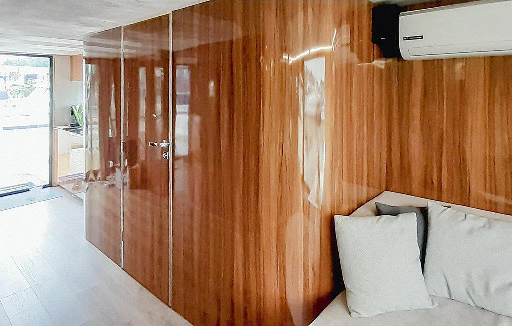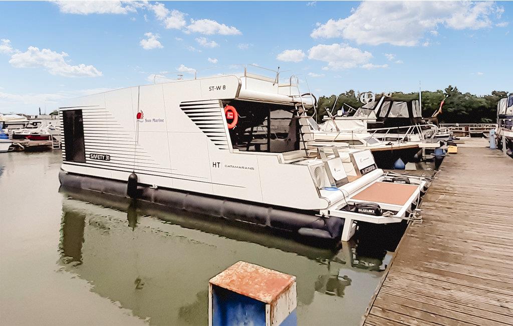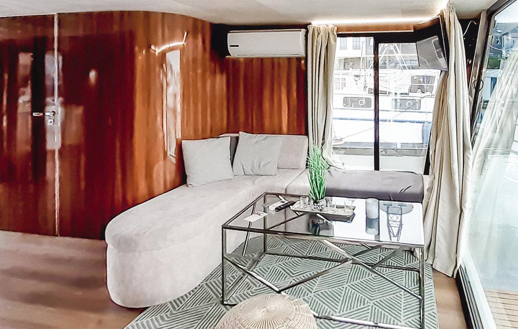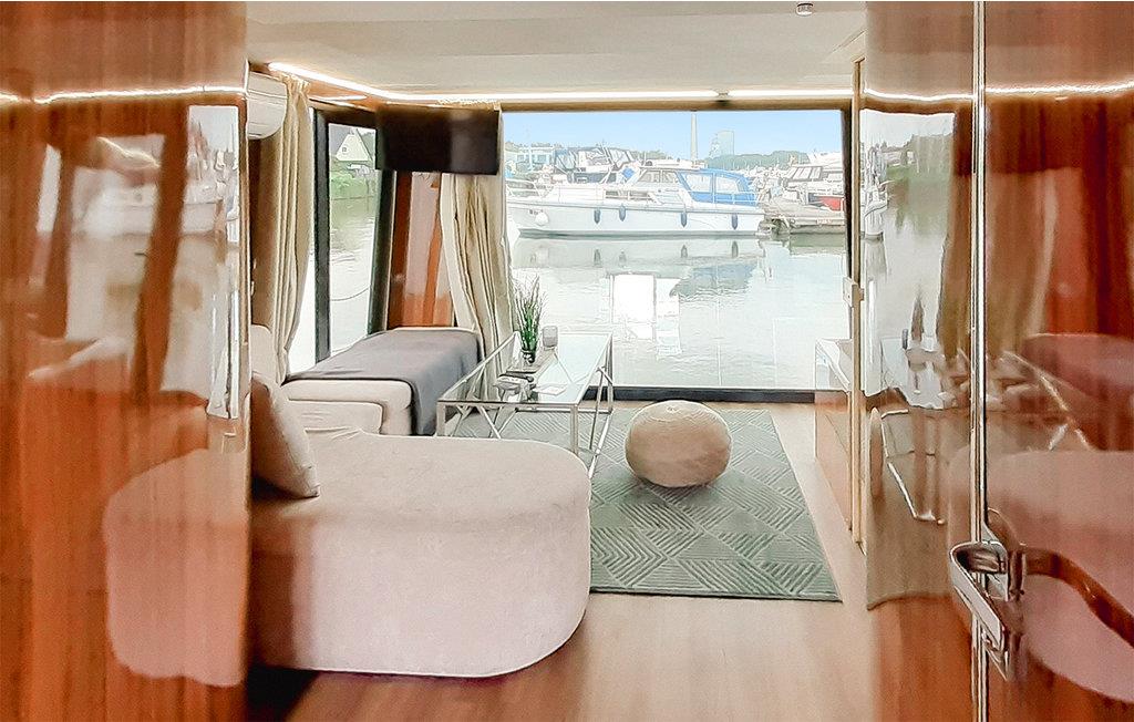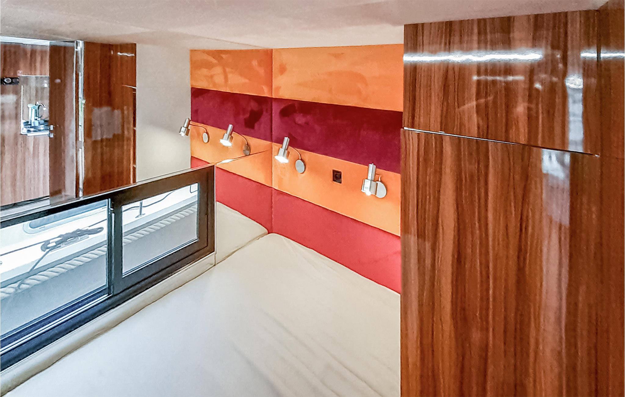 Husbåden kan rumme op til 5 personer: der er to sovekabiner med dobbeltseng og en ekstra hjørnesofa i opholdsområdet. På denne luksus husbåd finder I en sauna samt et lille spabad.