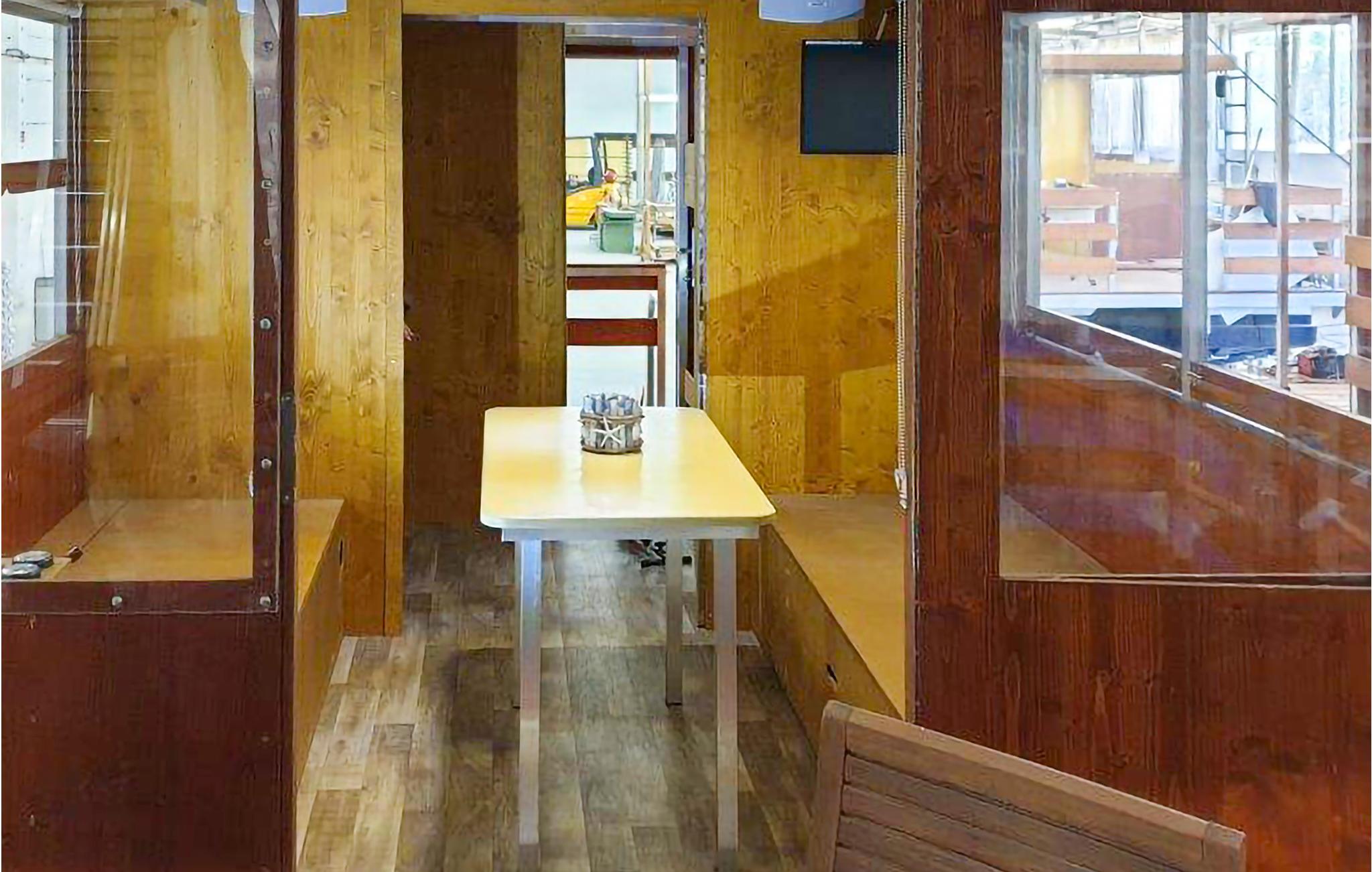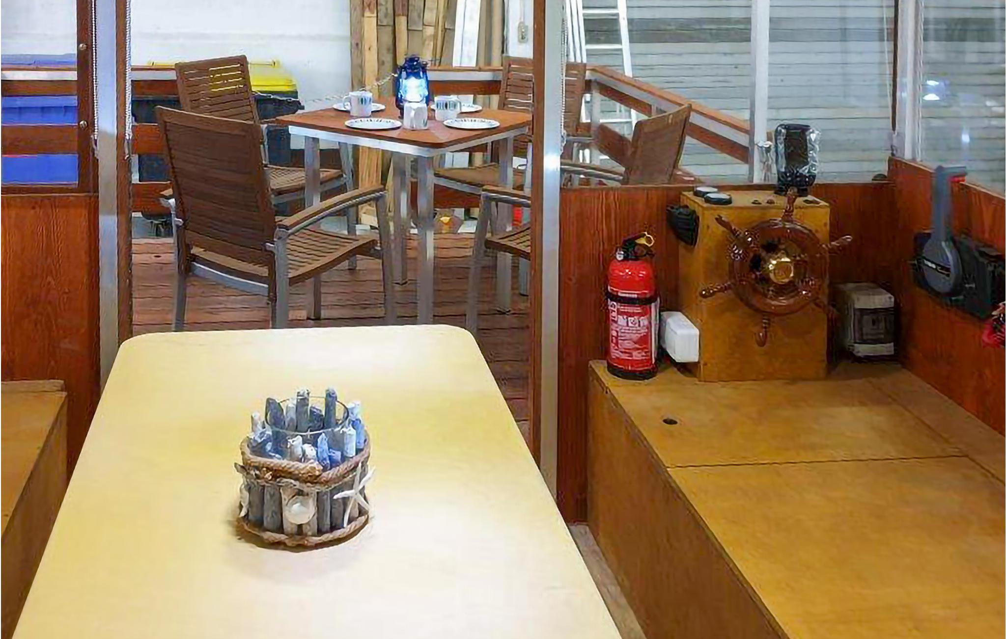 Der er adgang til båden via den åbne terrasse på forstavnen, derefter videre ind i opholdsområdet, hvor I også styrer båden. Her findes 2 sovepladser, den ene en udtræksseng og med et tv på væggen. I har mulighed for WiFi ved forespørgsel og tilgængelighed. Videre ind i båden kommer det lille, åbne køkken hvor etagesengen befinder sig bag en skillevæg overfor køkkenet. Hertil kommer et lille, separat toilet med håndvask samt en bruser med v/k vand. På terrassen på forstavnen kan I nyde kaffen i havemøblerne og på agterstavnen findes to små områder til afslapning. Et tilstrækkeligt antal redningsveste og fendere findes om bord, og er naturligvis ligesom båden kontrolleret omhyggeligt før afgang.