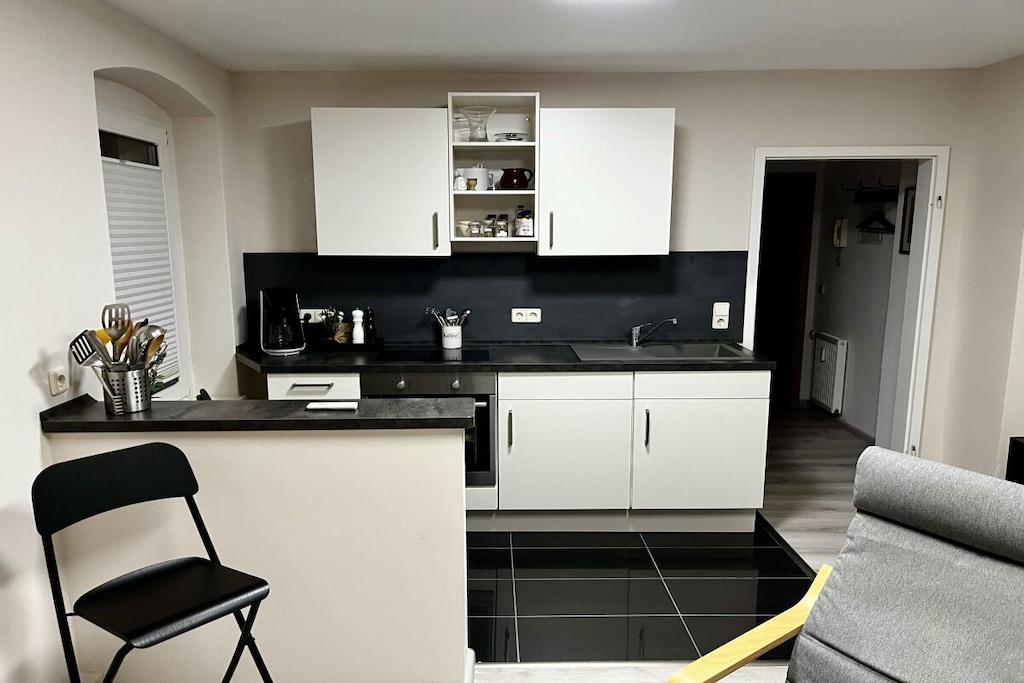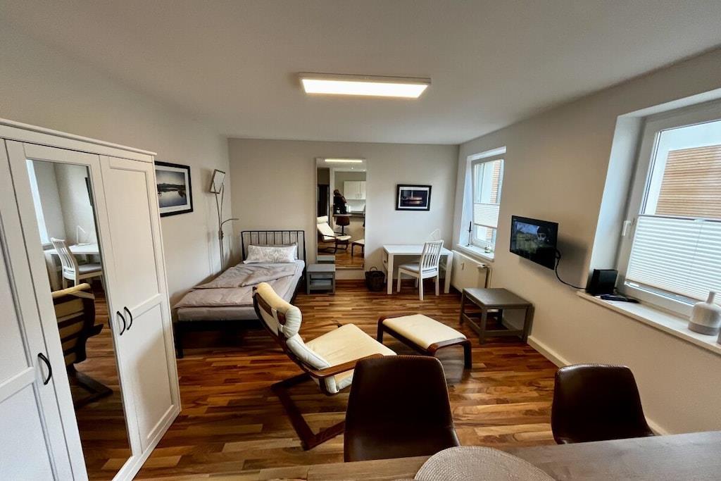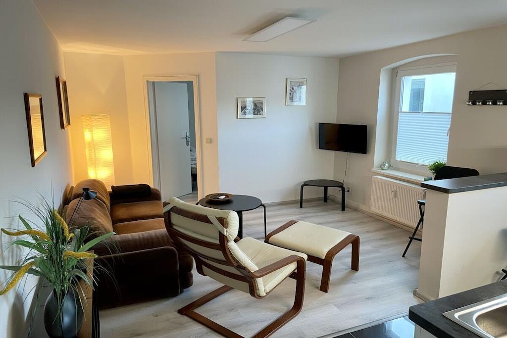 Two beautiful, quiet holiday apartments located in a separate building, each one in the courtyard. The first apartment is on the ground floor of a two-family house in the courtyard and, despite its proximity to the city center, is very quiet. It has 36 m² of living space and has been completely refurbished and extensively renovated. A spacious bathroom with a shower completes the interior. This is a one-room apartment with an integrated fitted kitchen. The second apartment is located directly above the first apartment on the first floor. Despite its proximity to the city center, it is also very quiet. It has 43 m² of living space and has been completely modernized and refurbished. A spacious bathroom with a shower completes the interior. This is a two-room apartment with an integrated fitted kitchen. 1-room apartment on the ground floor = for one person 2-room apartment on the first floor = for two people