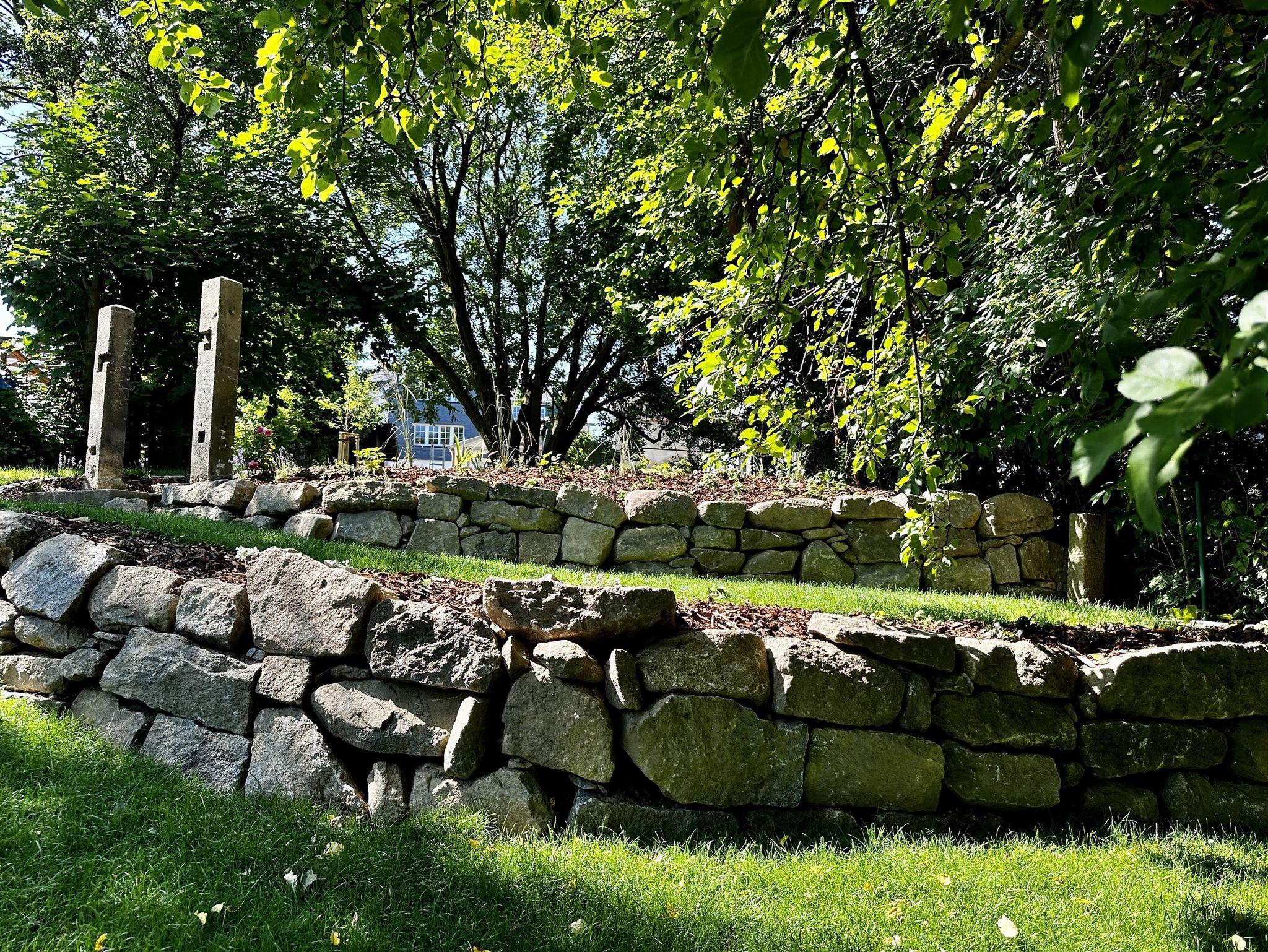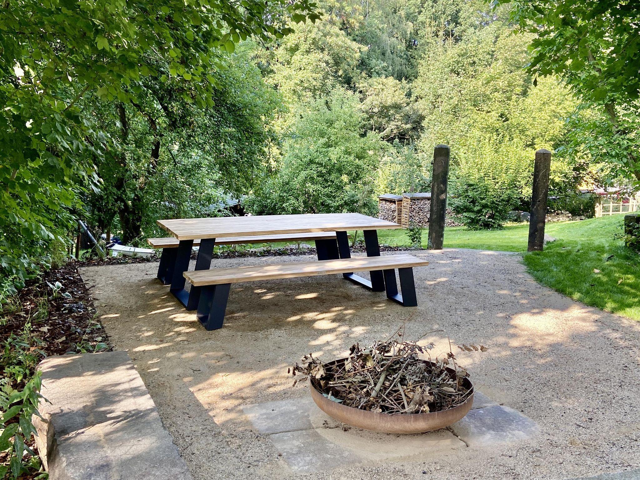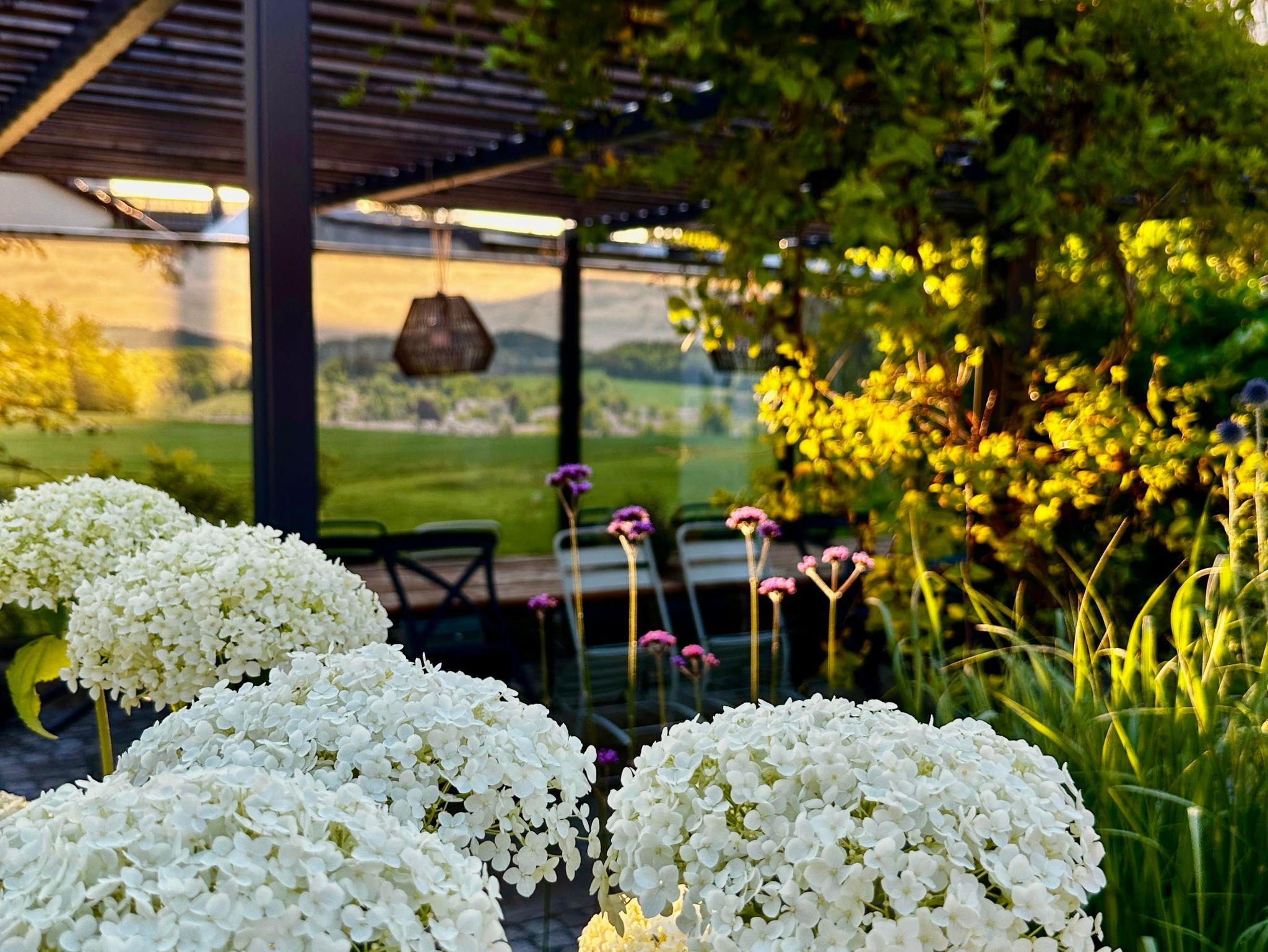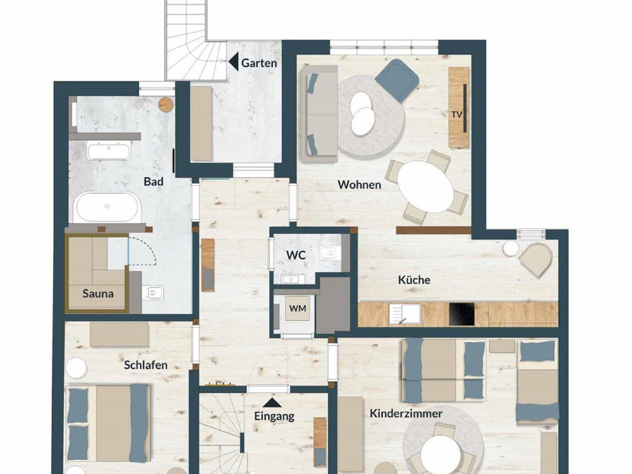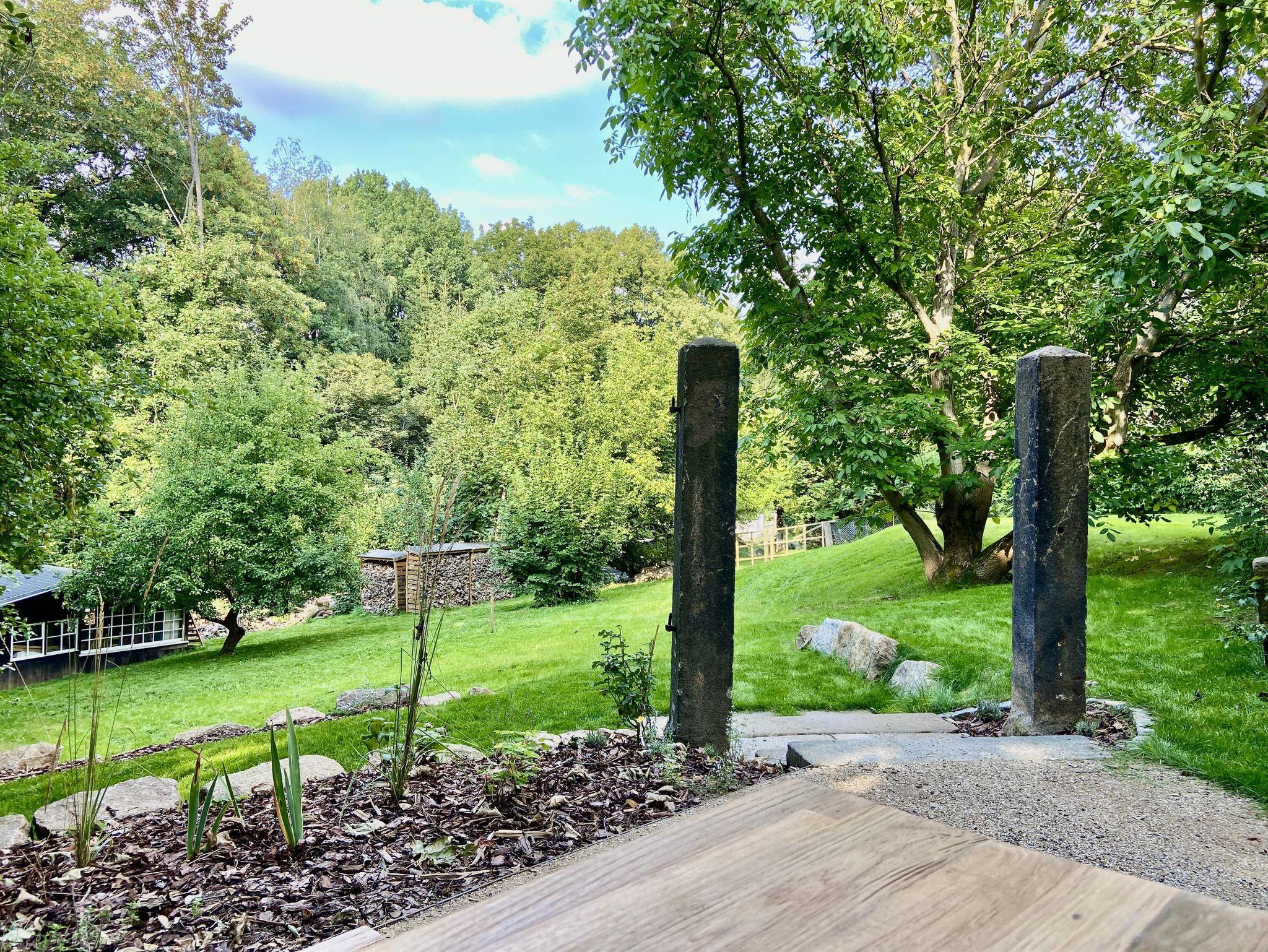Ein großzügiges Wellnessbad mit Dusche, Badewanne und privater Sauna sorgt für Entschleunigung vom Alltag. Von der kleinen Loggia aus führt die Außentreppe direkt in den weitläufigen Garten mit idyllischen Sitzbereichen und Rückzugsmöglichkeiten unter alten Obstbäumen.