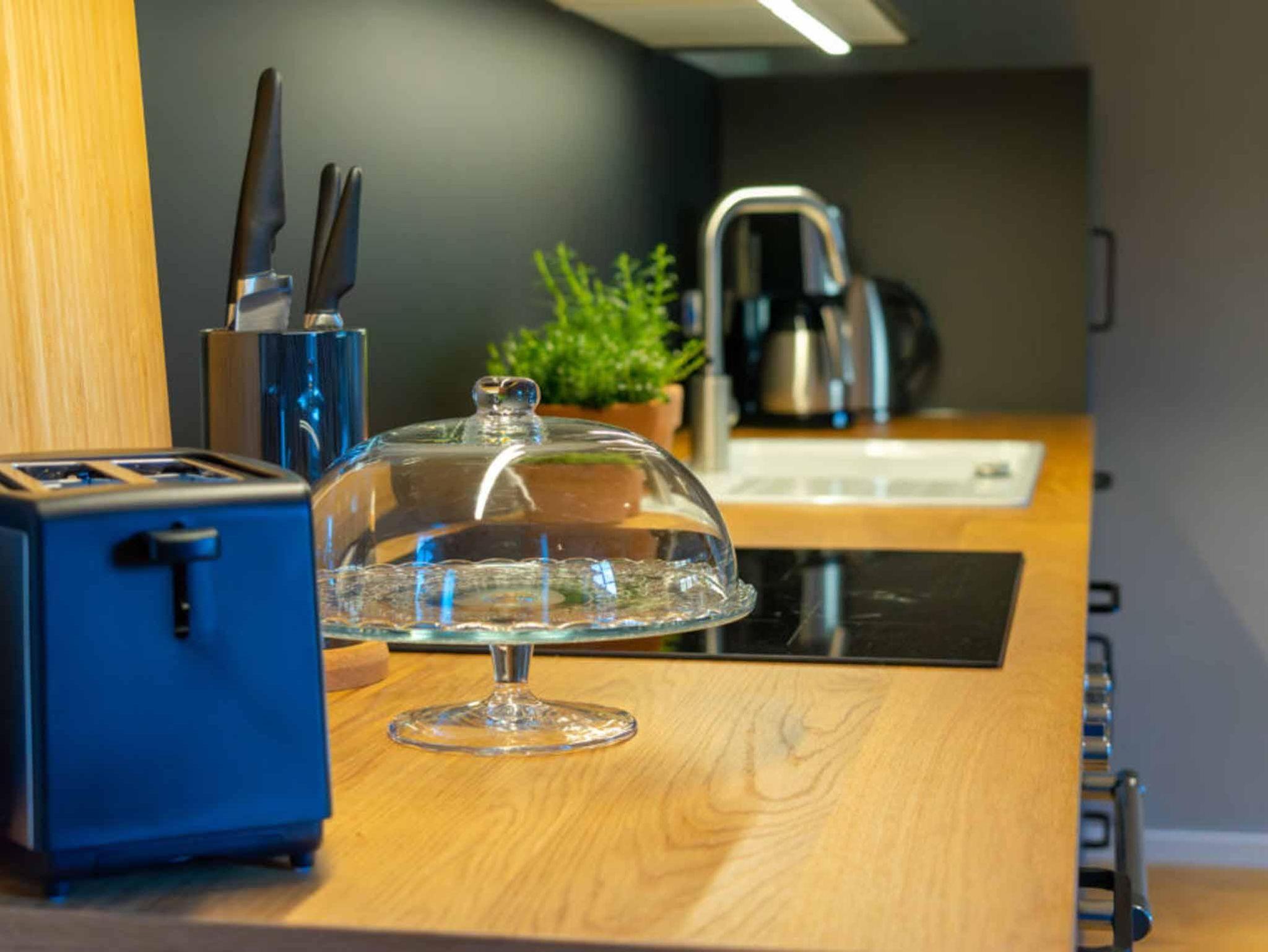 Küche: Kühlschrank mit Gefrierfach, Geschirrspüler, Cerankochfeld (Induktion), Backofen, Mikrowelle, Toaster, Kaffeemaschine, Wasserkocher