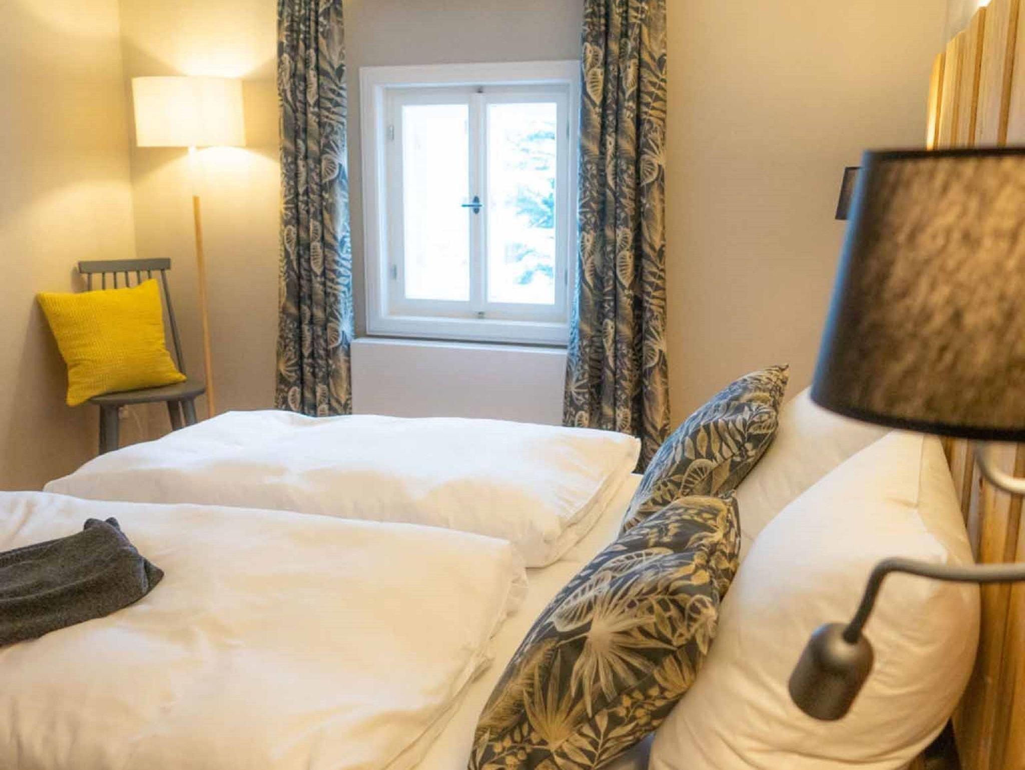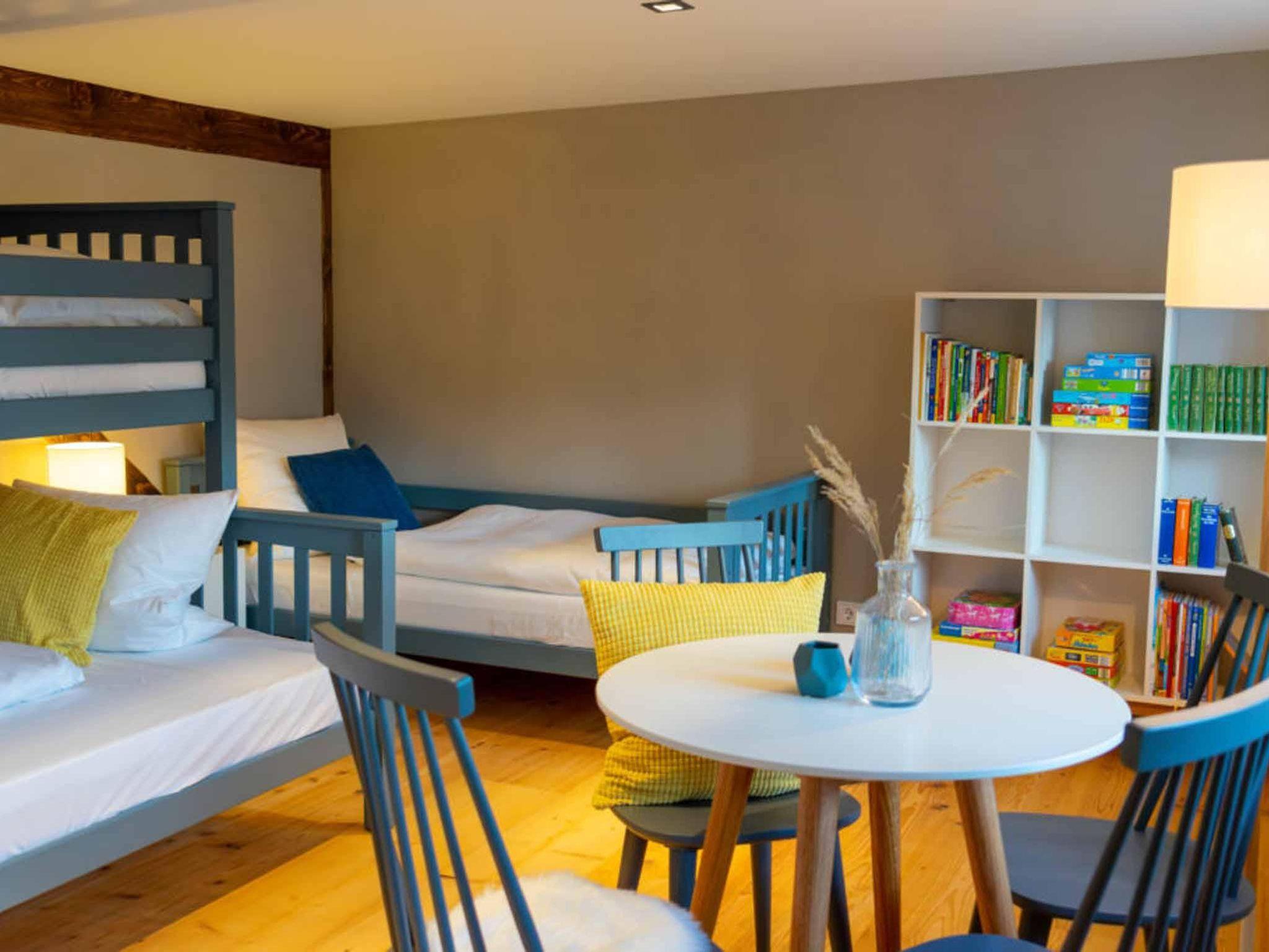 Das Familienapartment. Ein stilvoll-gemütliches Elternschlafzimmer und ein richtig großes Kinderzimmer mit drei Betten. Dazu noch Platz für bis zu zwei Kleinkinder im Babybett. Zusammenkommen im offenen Wohn- und Essbereich mit moderner Küche.