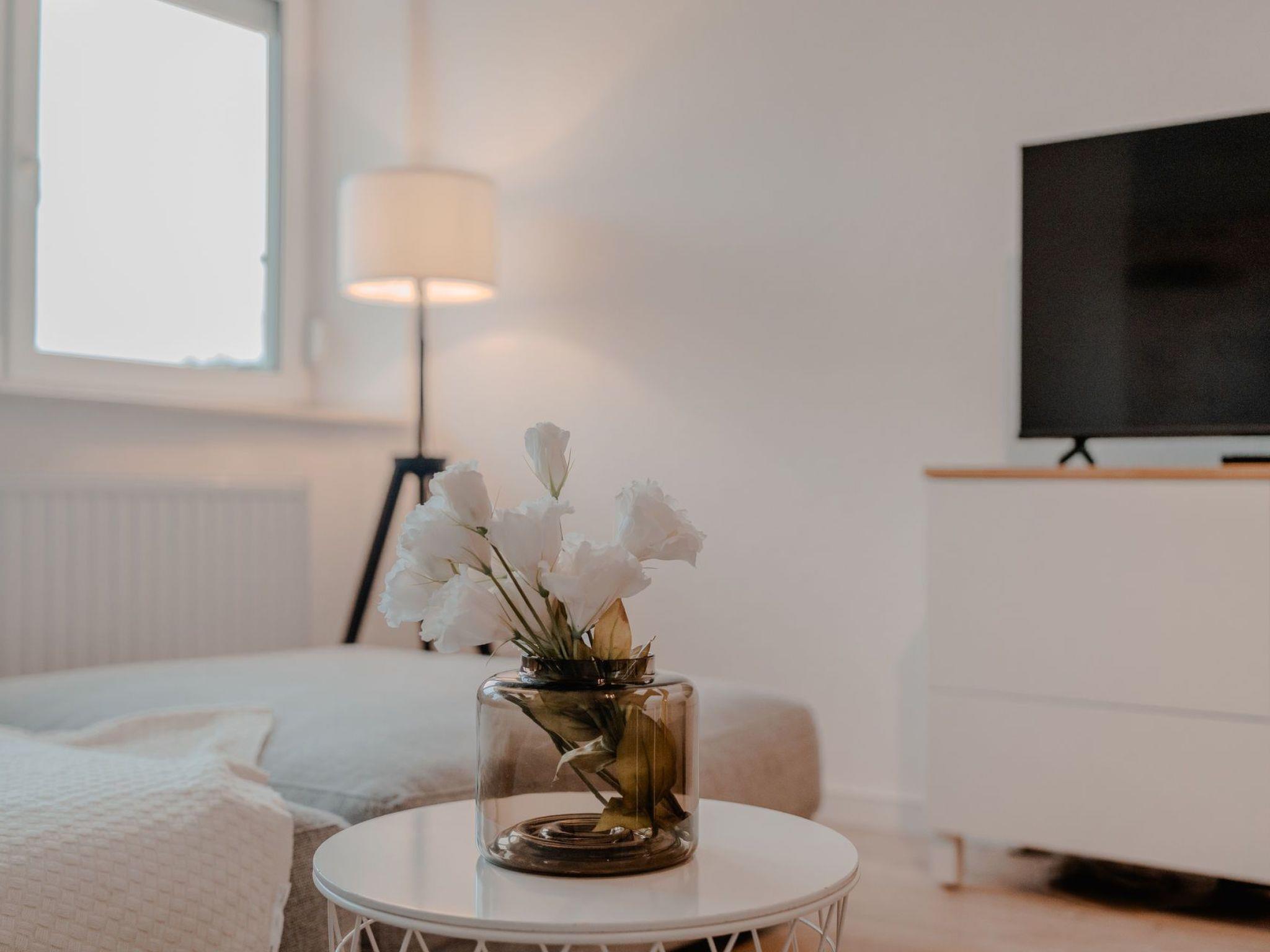With its functional furnishings, the interior of the flat ensures that you will want for nothing. The flat has two separate beds, offering flexible sleeping arrangements for you and your companion. A large, cosy sofa area invites you to relax, ideal for winding down at the end of the day. Entertainment is also provided: thanks to Netflix, Disney+ and fast internet, you can enjoy your favourite series or films at any time. There is also a comfortable workspace if you need to work during your stay.