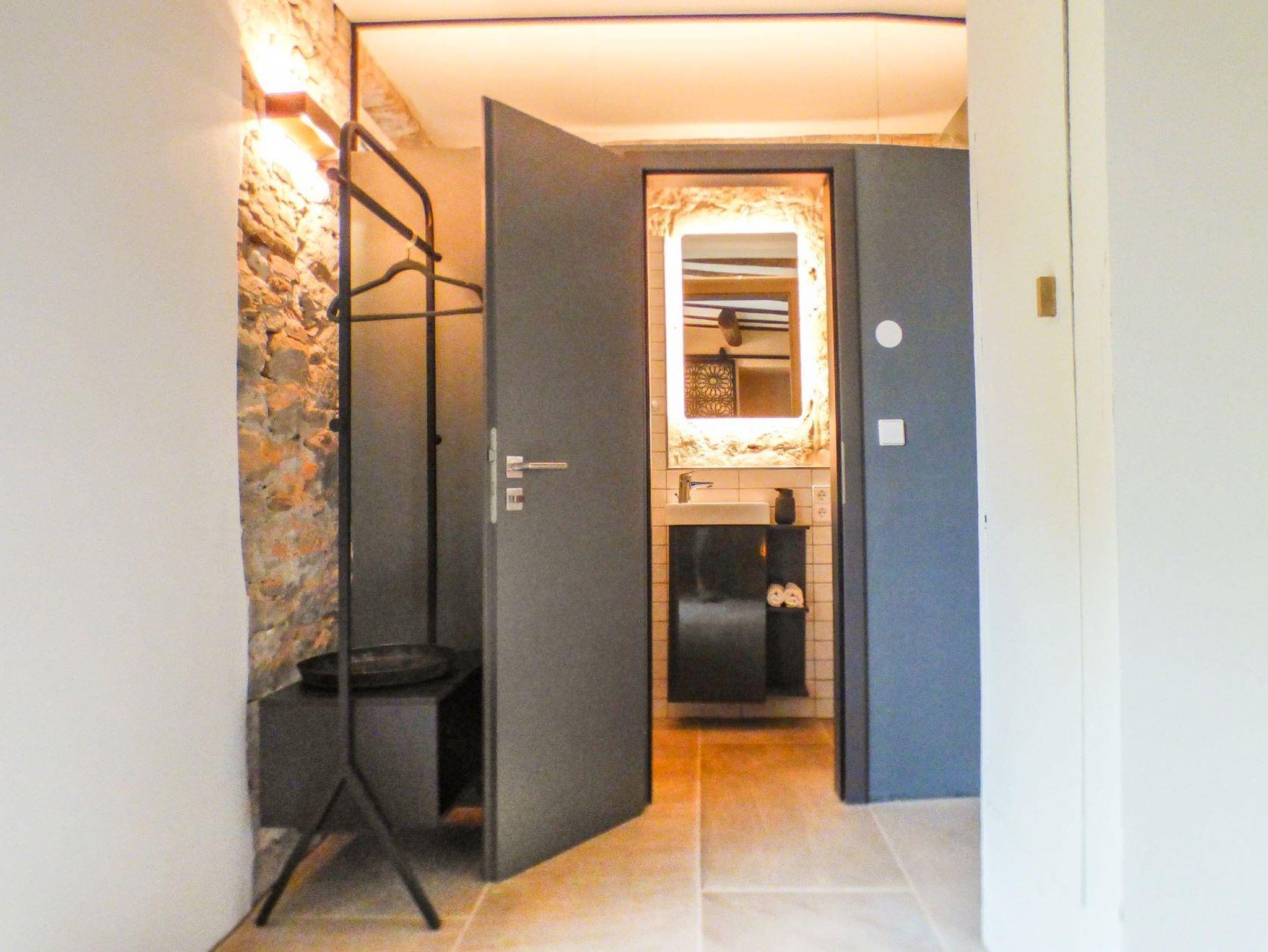 Im August 2022 ist nach aufwendigen Renovierungsarbeiten unsere 4. Ferienwohnung, unser Weinrefugium, fertig geworden. Die Ferienwohnung ist mit rund 70 m² unsere größte Unterkunft. Sie liegt im Erdgeschoss. Das großzügige und ausgefallene Schlafzimmer mit einem 2 auf 2 m großen Himmelbett aus Indien befindet sich in einem wunderschönen Gewölbe mit großer Rundbogentür und drei Nischenfenstern.Das Wohn- und Esszimmer ist geschmackvoll eingerichtet, ein ausziehbares Sofa ergänzt die Ausstattung. Funktional gestaltet sind die kleine kompakte Miniküchenzeile mit Kühlschrank, Geschirrspüler und 2 Kochplatten, als auch die Badzelle. Dem ursprünglichen Planung entsprechend wäre die Wohnung ein moderner Seminarraum geworden. Das Bad ist daher mit einem entsprechend kleinen Handwaschbecken ausgestattet. Mit Dusche und WC zusammen ist diese Ferienwohnung neben Goldberg ein zweites Raumwunder. Schmankerl am Rande: nach oben hin verglast lässt die Badzelle den Blick auf den wunderschönen Sandstein zu.