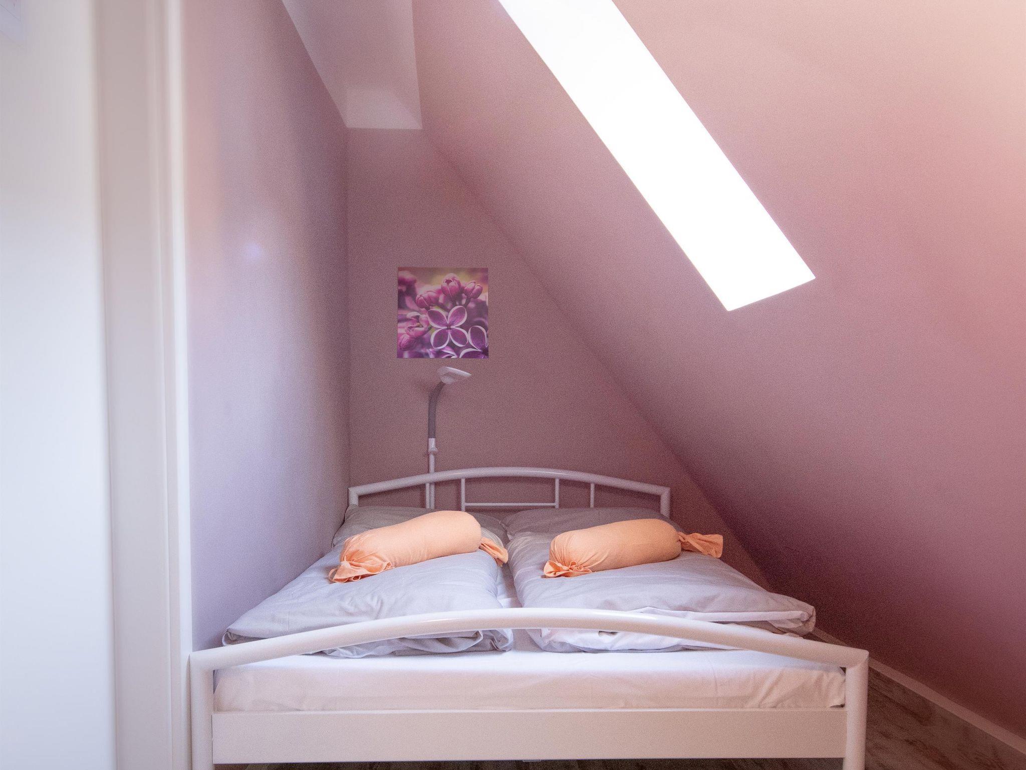 Unser kleines Doppelzimmer mit Dachschräge im zweiten Obergeschoss verfügt über ein eigenes Badezimmer sowie Klimaanlage, einen Tisch mit zwei Stühlen, eine Kleiderständergardarobe und einem Fernseher.