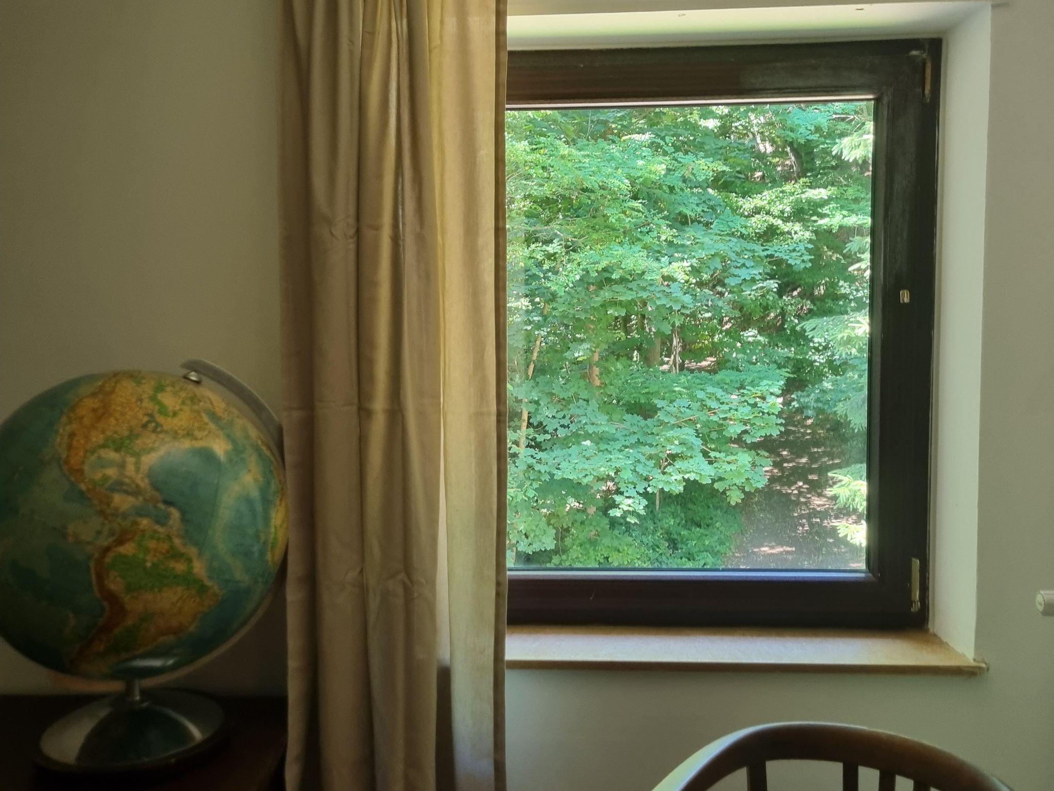 • 1 Schlafzimmer mit Doppelbett (1,80 m Breite) und Schreibtisch mit Blick ins Grüne