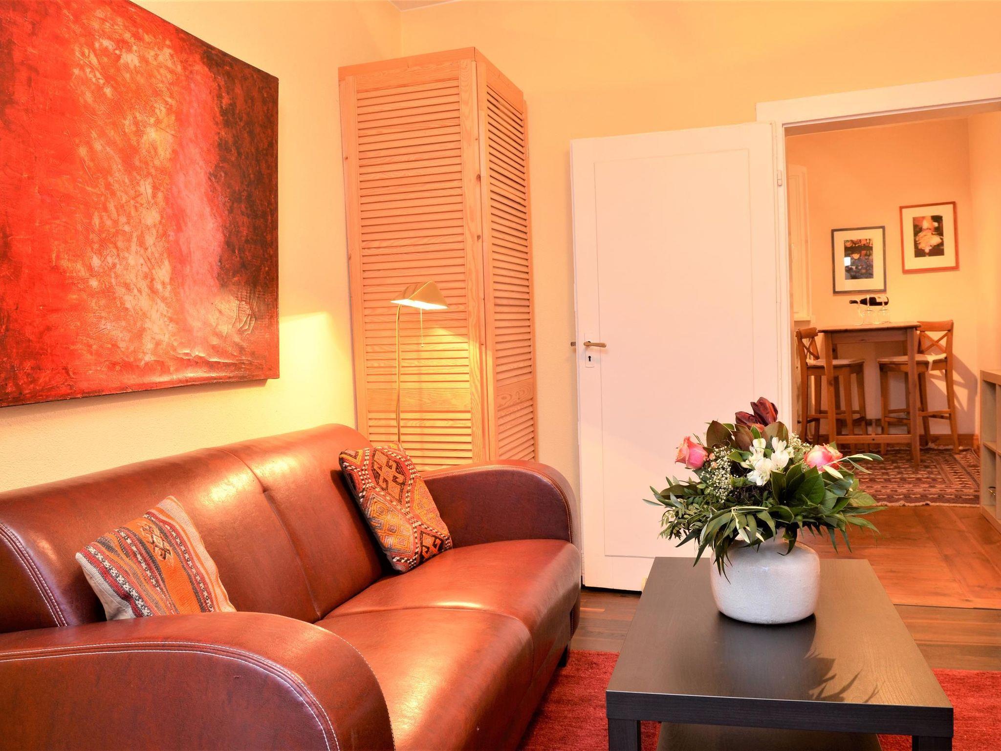 Die Ferienwohnung Kastanienbusch im Obergeschoss ist über eine steile, alte aber gut erhaltene Holztreppe erreichbar. Der ausgewählte dunkle Parkettboden und die leicht abstrakten Gemälde sorgen für eine dezente moderen Atmosphäre, die den Charme des alten Gebäudes akzentuiert ergänzt. An warmen Sommertagen bietet der Balkon ausreichend Platz für gemütliche Abende mit Blick über die typisch pfälzische Rebenlandschaft.