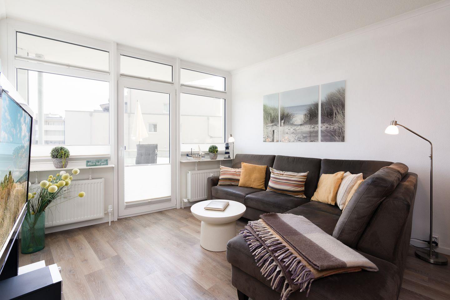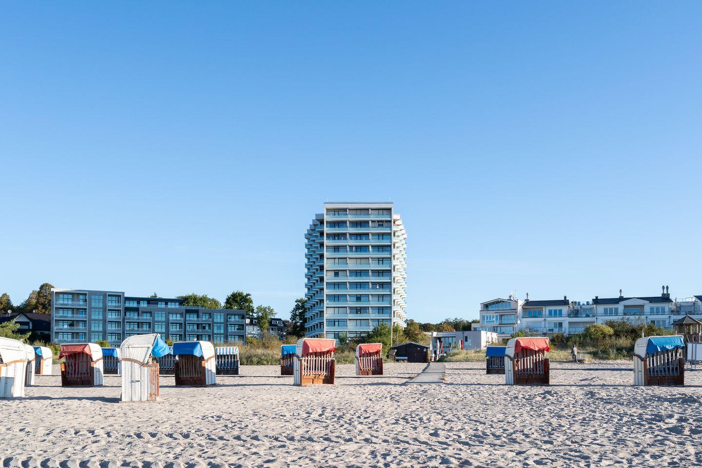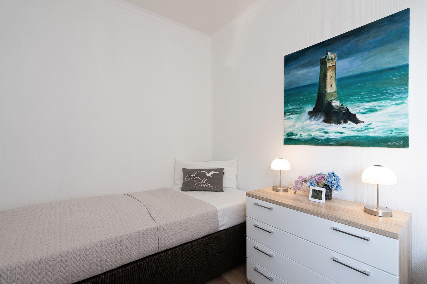 Das separate Schlafzimmer ist mit zwei komfortablen Boxspringbetten (je 90 cm x 200 cm) ausgestattet – ideal für erholsamen Schlaf. Auf dem Balkon mit Tisch und vier Stühlen genießen Sie bei einer Tasse Kaffee den Teilblick auf die Ostsee und lassen die Seele baumeln.