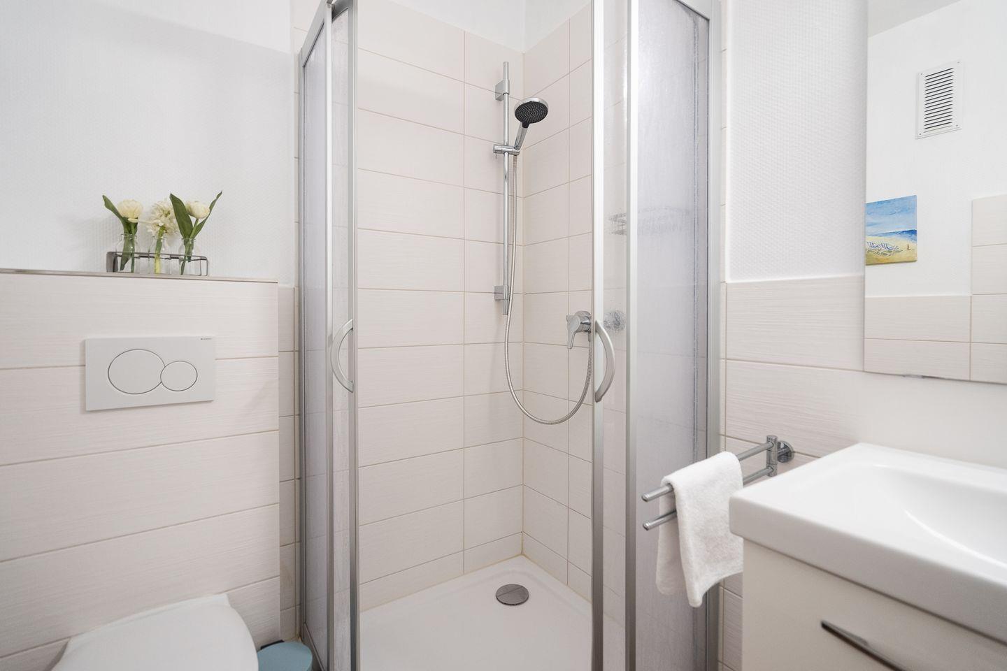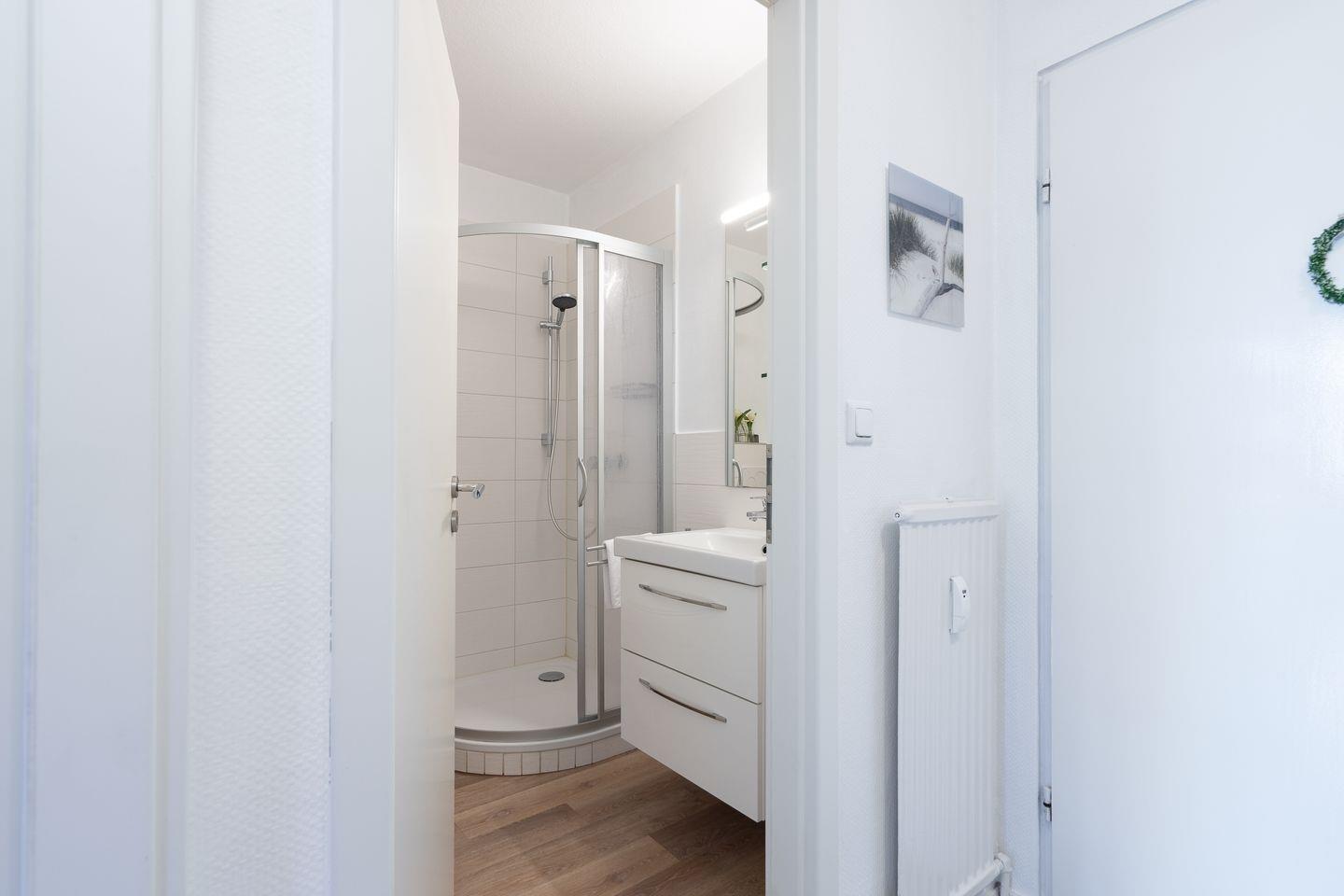 Im modernen Duschbad finden Sie alles, was Sie brauchen: Spiegel, Waschbeckenschrank und Föhn. Im Flur sorgt ein großer Spiegelschrank für ausreichend Stauraum für Kleidung, Schuhe und mehr.