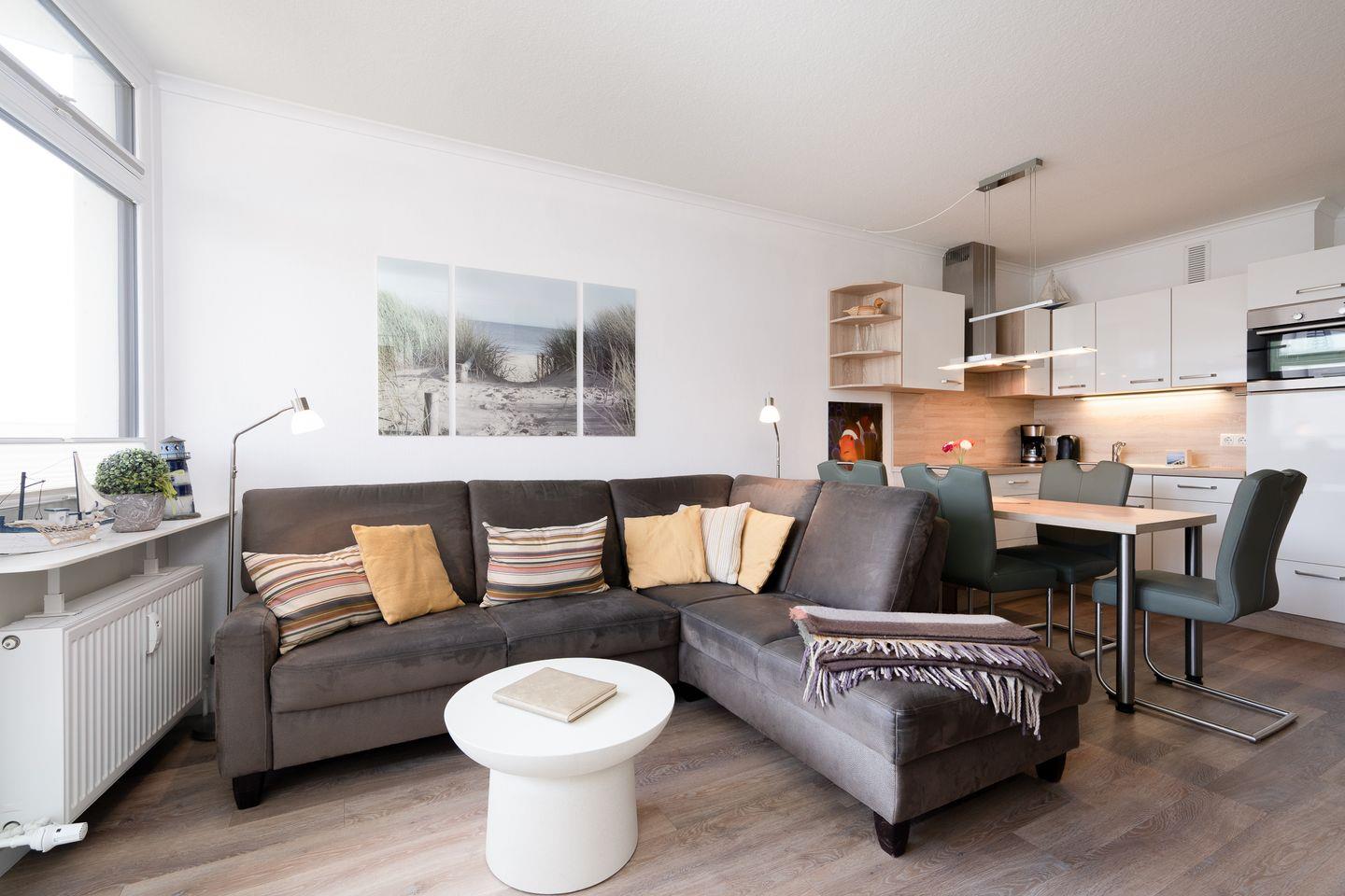 Im Wohnzimmer erwartet Sie eine stilvolle Einbauküche, die keine Wünsche offenlässt: Geschirrspüler, Backofen mit Pizzafunktion, 4-Zonen-Ceranfeld, Kühlschrank mit Gefrierfach, Dunstabzugshaube, Kaffeemaschine, Wasserkocher, Eierkocher, Toaster – und natürlich ausreichend Geschirr, Besteck und Kochutensilien. Der gemütliche Essplatz lädt zu gemeinsamen Mahlzeiten ein.