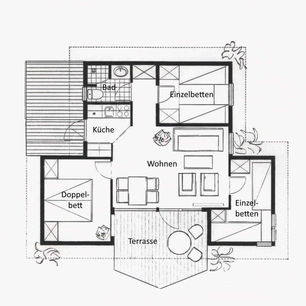 Von der Eingangsterrasse kommen Sie über die voll bestückte Küche in den großen und lichtdurchfluteten Wohnraum mit Essbereich und gemütlichem Ecksofa samt SAT-TV. Die schöne Südterrasse mit Sitzgelegenheiten lädt zum entspannten Verweilen in der Natur ein. Die 55 m² Wohnfläche mit einem Schlafzimmer mit Doppelbett und zwei weiteren Schlafzimmern mit je zwei Einzelbetten bieten Platz für sechs Personen und zusätzlich für bis zu zwei Kleinkinder bis 2 Jahren. Aus dem Wohnraum mit großer Fensterfront kommen Sie über einen kleinen Flur in das Bad mit Waschplatz, Dusche und WC. Zudem gehören zwei Pkw-Stellplätze selbstverständlich zu jedem großen Ferienhaus und Sie können den Internetzugang per WLAN kostenfrei nutzen.