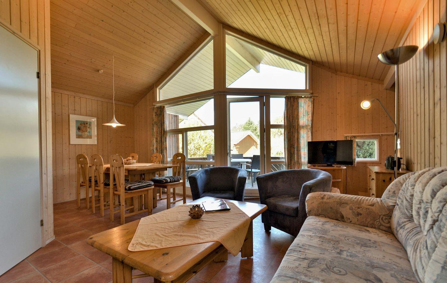 Unser dänisches Ferienhaus Typ D im Ferienpark AM WALDRAND befindet sich freistehend in unserer pflanzenreichen Parkanlage und hat gegenüber unseren anderen Ferienhäusern zwei Besonderheiten. Einerseits ist im Wohnraum ein Alkoven, also ein kleines Doppelbett in einer Nische, und andererseits hat das Ferienhaus Typ D die größte teilüberdachte Holzterrasse.