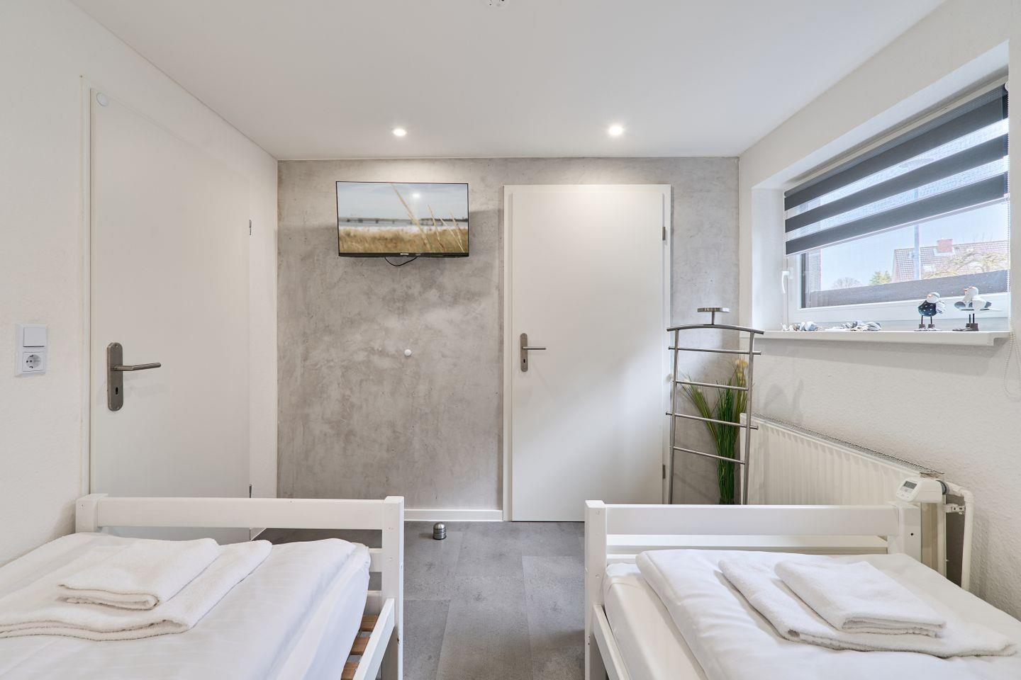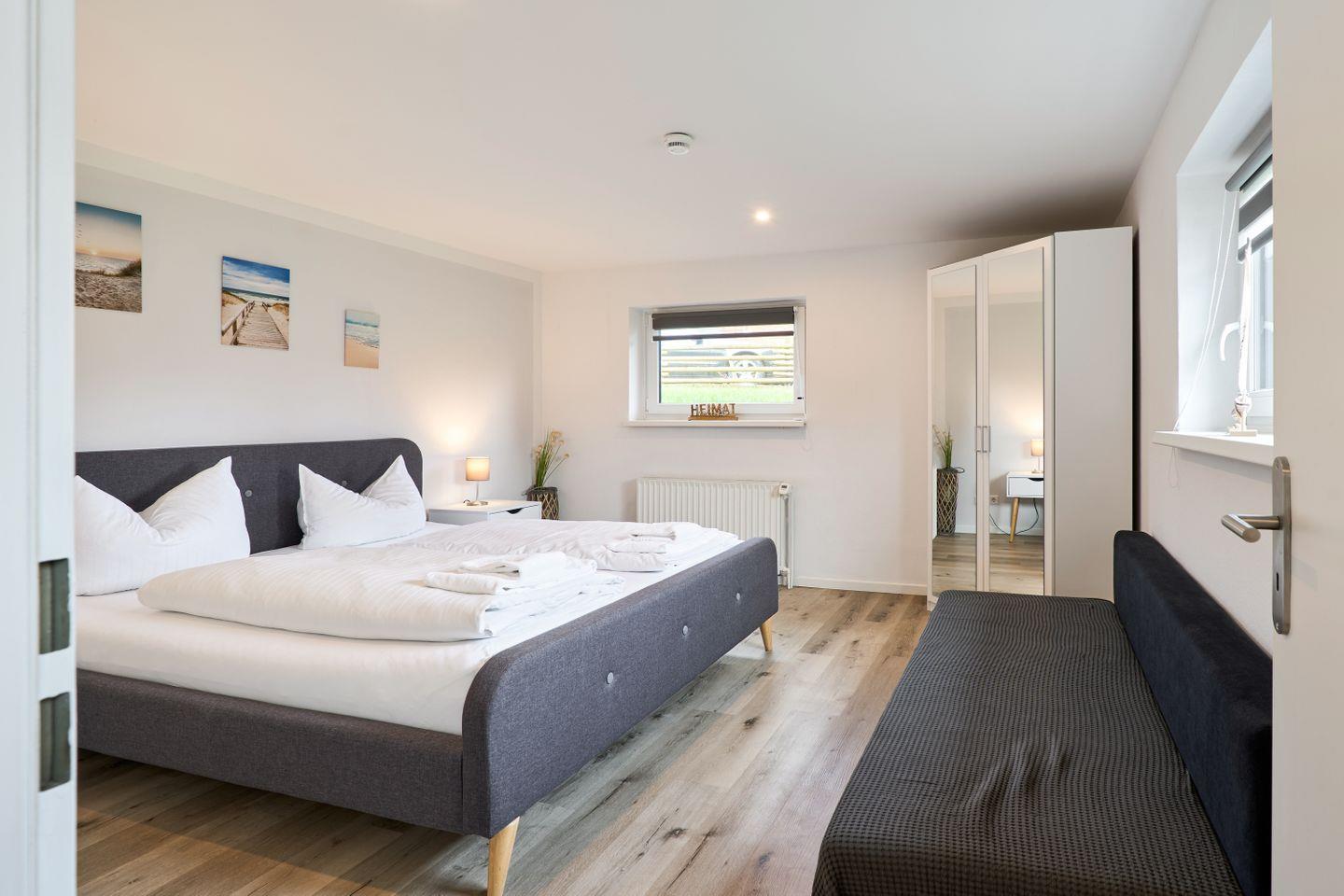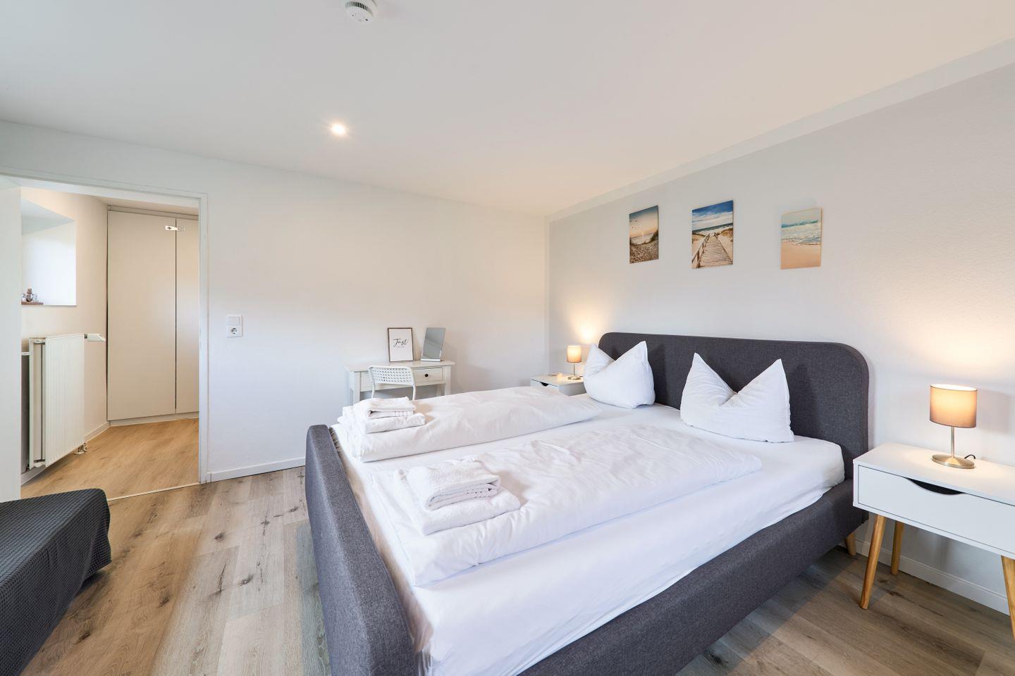 Die Ferienwohnung verfügt über zwei gemütliche Schlafzimmer, die mit komfortablen Betten und genügend Stauraum ausgestattet sind, sodass Sie erholsame Nächte genießen können. Das moderne Badezimmer bietet eine luxuriöse Regendusche, die für einen perfekten Start in den Tag sorgt.