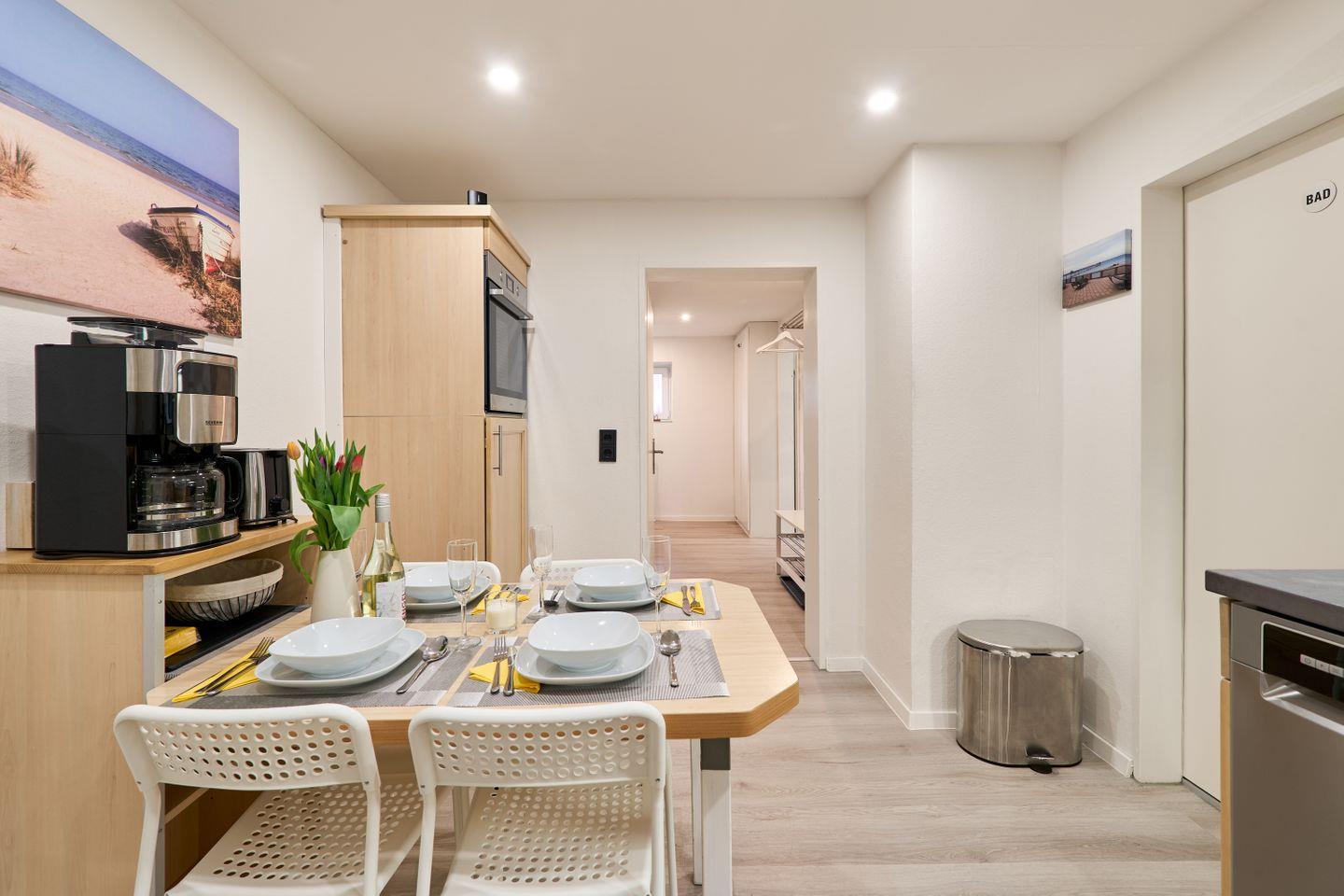 Der großzügige Wohnbereich lädt zum Entspannen ein. Hier finden Sie eine bequeme Sitzecke und einen Flachbildfernseher. Die voll ausgestattete, moderne Küche bietet alles, was Sie zum Kochen benötigen, einschließlich Herd, Kühlschrank und Kaffeemaschine. Ein Essbereich ist ebenfalls vorhanden.