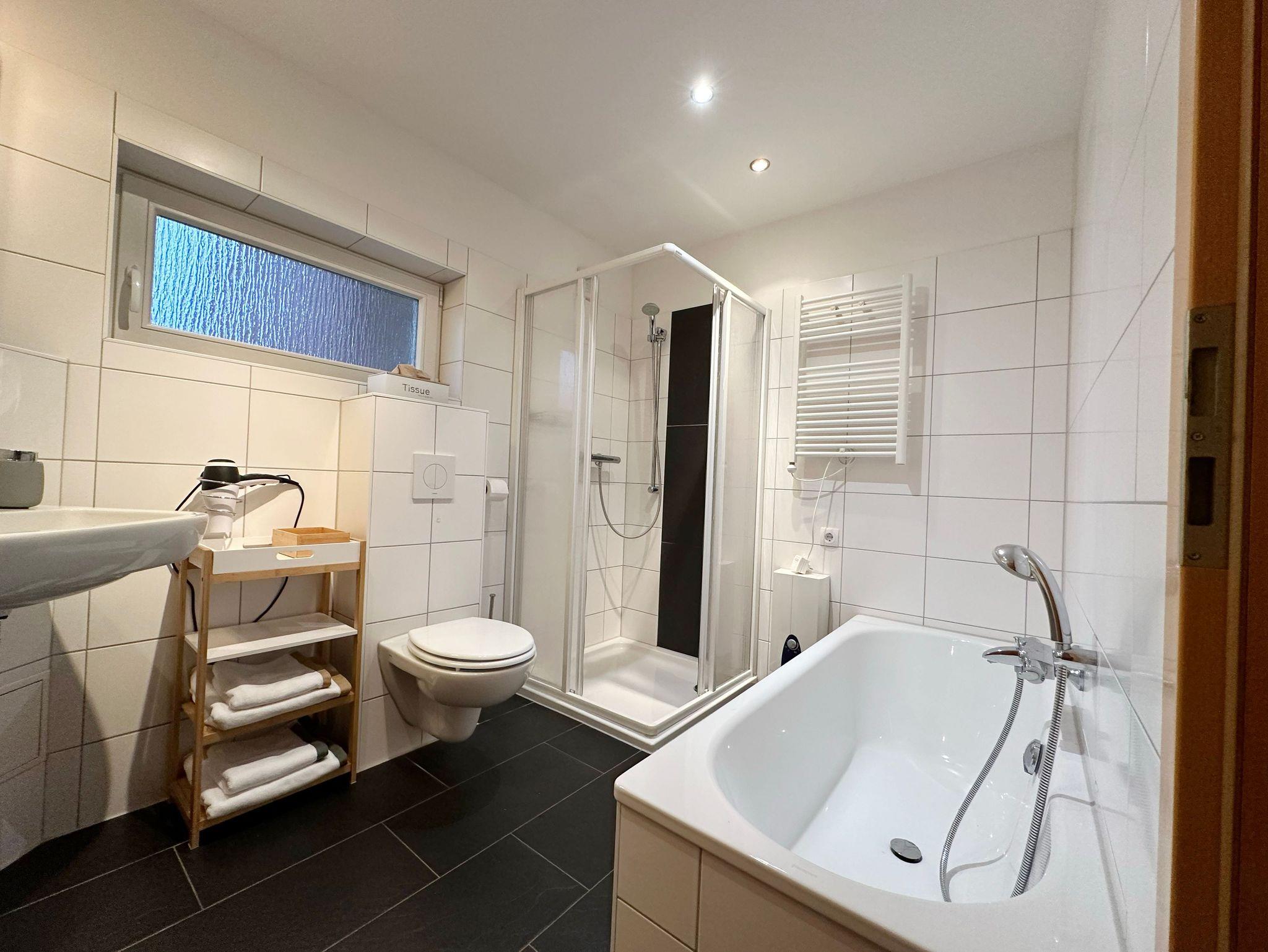 Das komfortabel ausgestattete Badezimmer verfügt über eine großzügige Dusche und separater Badewanne und ist ausgestattet mit Handtücher - Haarfön - Kosmetiktücher