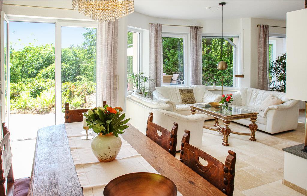 Dette hus, beliggende på en skovklædt grund, tilbyder en virkelig exceptionel ferieoplevelse. Det stilfuldt møblerede hjem kan prale af store vinduer, der oversvømmer interiøret med naturligt lys, diskrete farver og smukke træmøbler. Uanset om I tilbereder lækre måltider i det moderne køkken, læser i vinterhaven eller blot nyder den hyggelige varme ved pejsen, vil I hurtigt genoplade jeres batterier her.