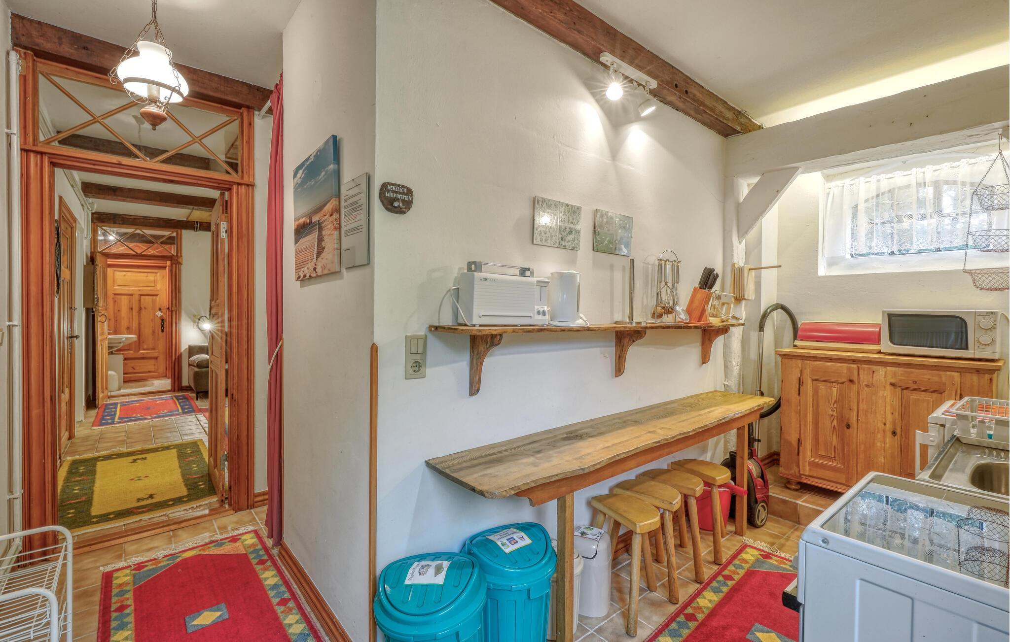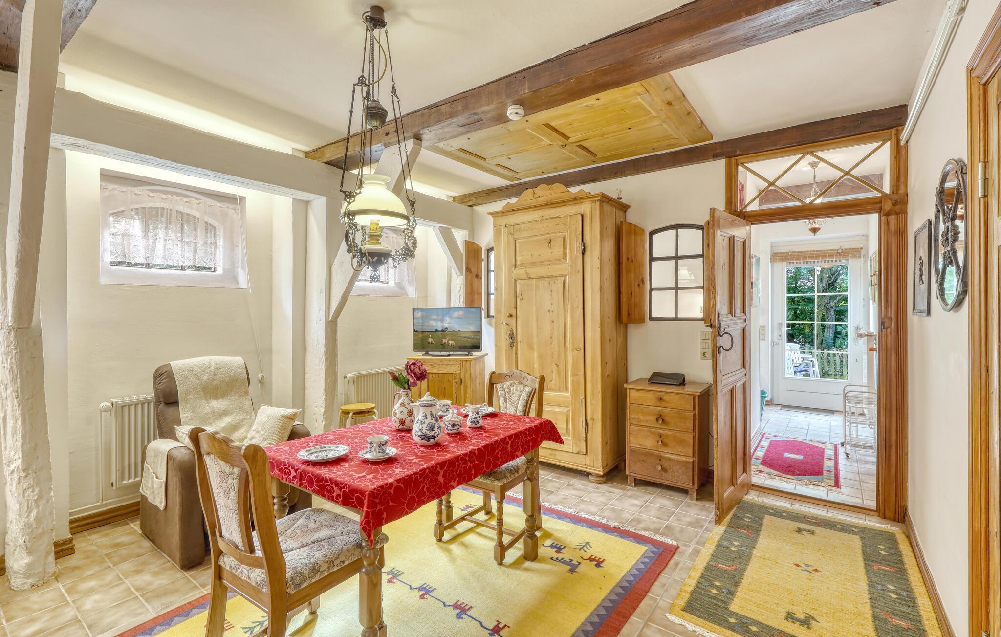 Nyd en afslappende ferie for to i denne hyggelige lejlighed i stueetagen, der kombinerer landlig ro med en traditionel atmosfære. Træd ind i den lyse lejlighed og føl jer straks hjemme. Læn jer tilbage i den store stue med komfortable siddepladser, hyggelige møbler og en charmerende blanding af traditionelle træelementer og varme farver. Brug det lille, veludstyrede køkken til at tilberede jeres egne måltider og nyd jeres måltider lige ved spisebordet.