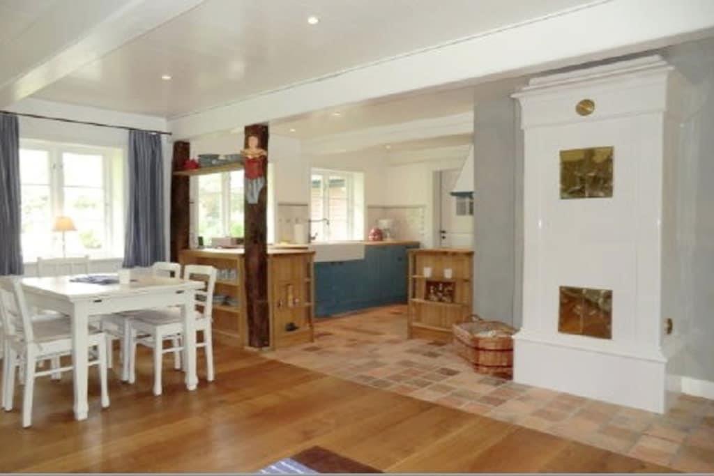 Stueetage: (soveværelse(, dobbeltseng)) På 1. etage: (soveværelse(, dobbeltseng, Fjernsyn)) , , Køkken(kogeplade, komfur, ovn, køleskab), stue / spisestue(, , tekøkken, Fjernsyn, spisebord, kakkelovn, DVD-afspiller), svalegang soveværelse(), badeværelse(, toilet, bruser, håndvask), badeværelse(, toilet, badekar, bruser, håndvask), Internetadgang, tørretumbler, vaskemaskine, varme, terrasse(Strand, havemøbler), have(sauna), parkering, strygebræt, strygejern, tørreskab, telefon