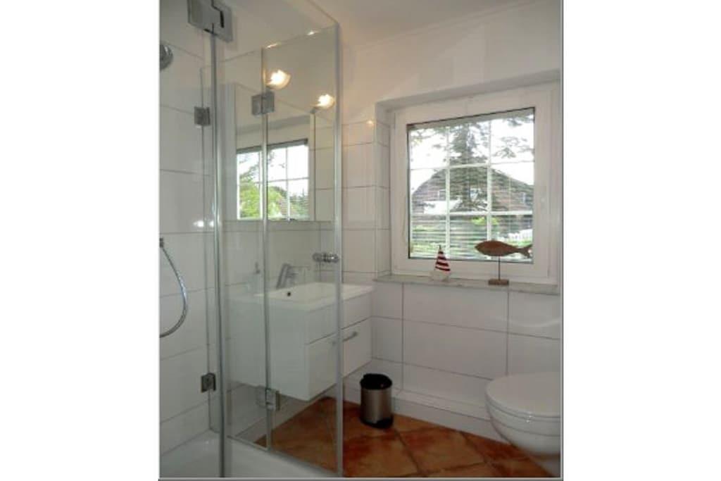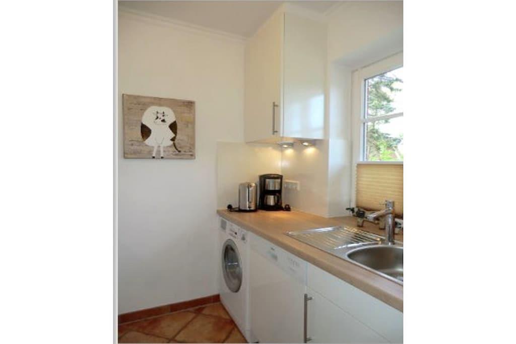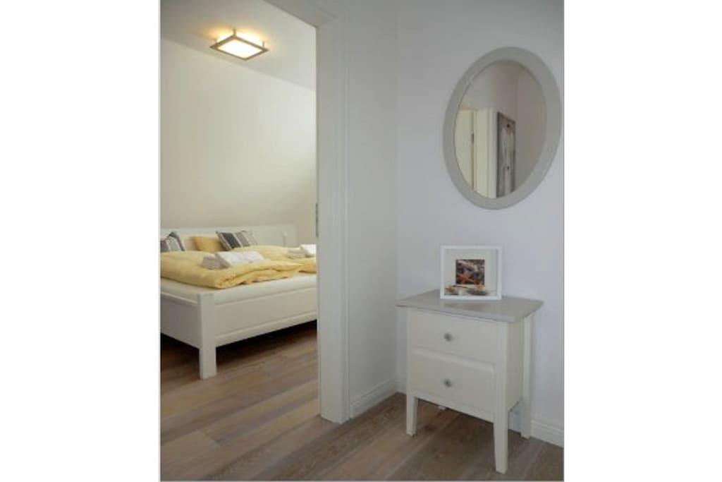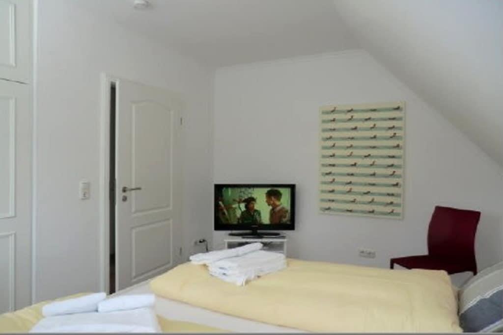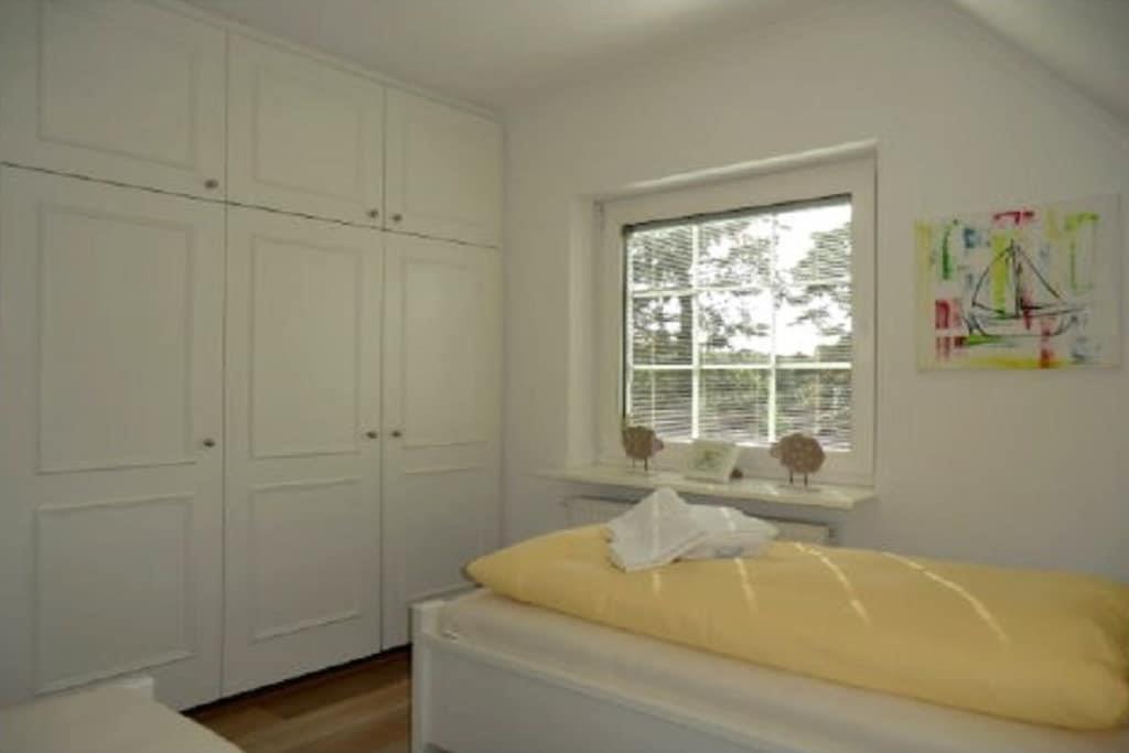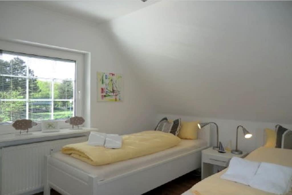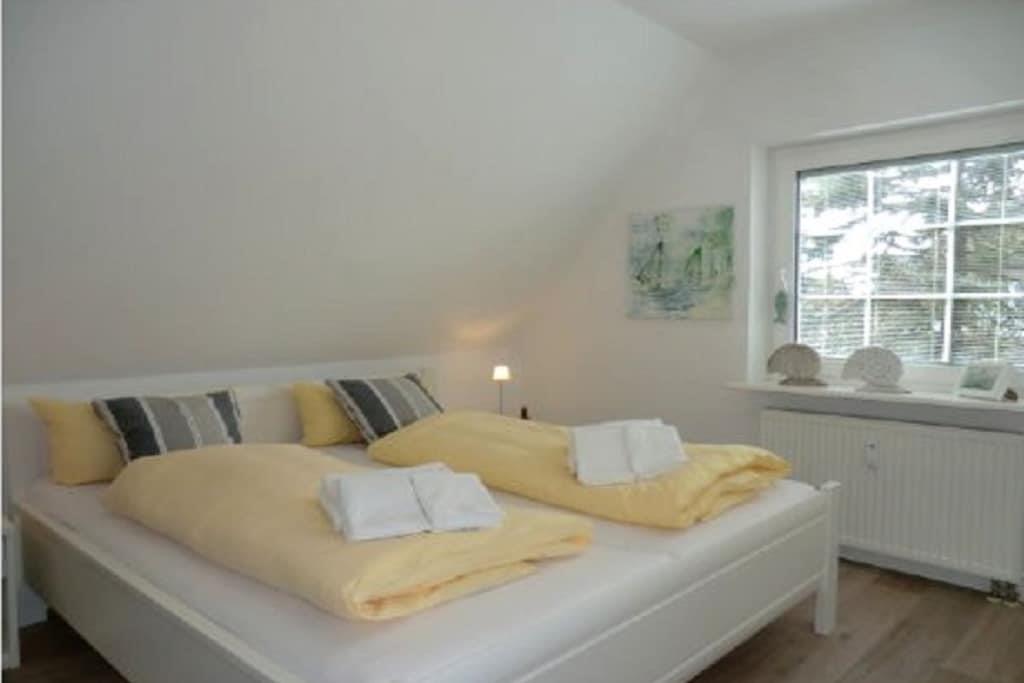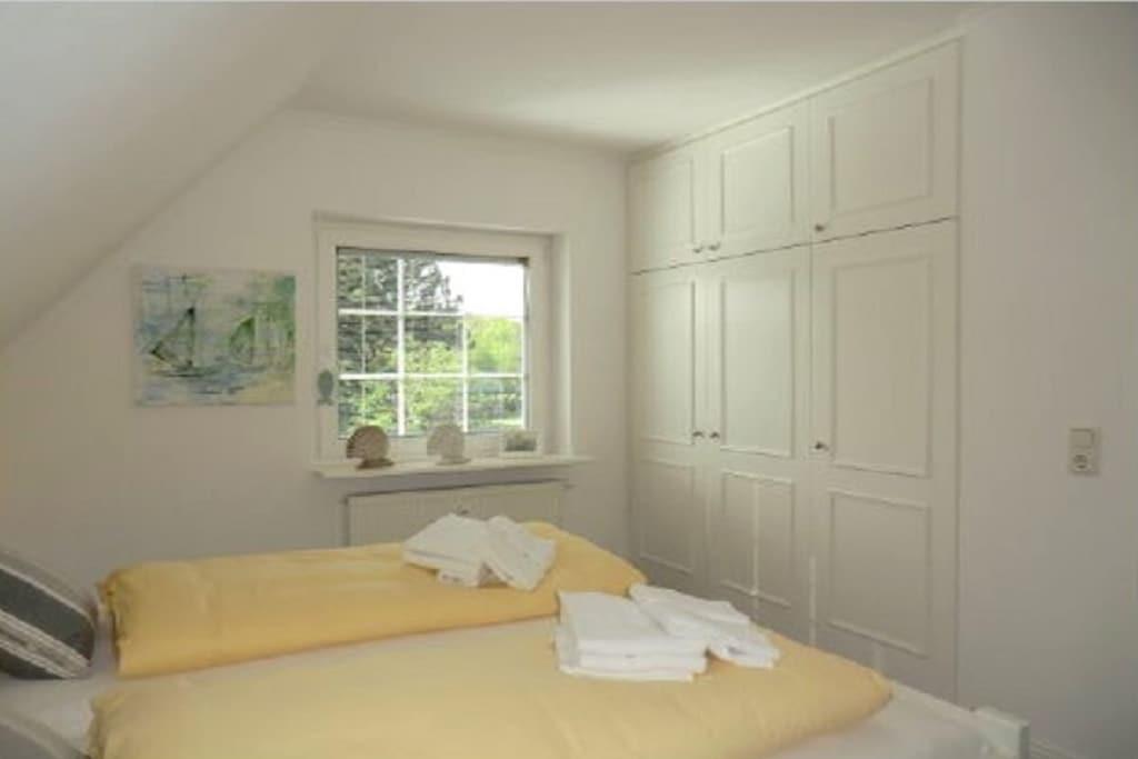 Beliggende usædvanligt tæt mellem Nieblum og Wyk ligger dette eksklusive rækkehus med stråtag på en rummelig grund i en rolig blind vej. En golfbane, der betragtes som en af de smukkeste i Tyskland, ligger i umiddelbar nærhed. Planering: Stueetage: Entré med trappe til øverste etage, køkken, badeværelse/toilet med vindue, stue/spisestue med fladskærms-tv og adgang til den solrige sydvendte terrasse. Øverste etage: Soveværelse med dobbeltseng og et andet fladskærms-tv, soveværelse med to enkeltsenge.