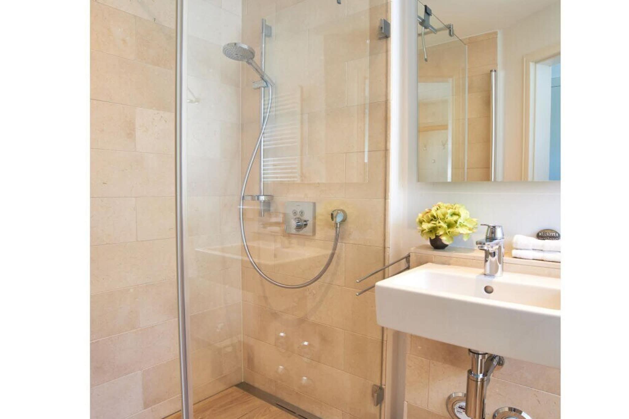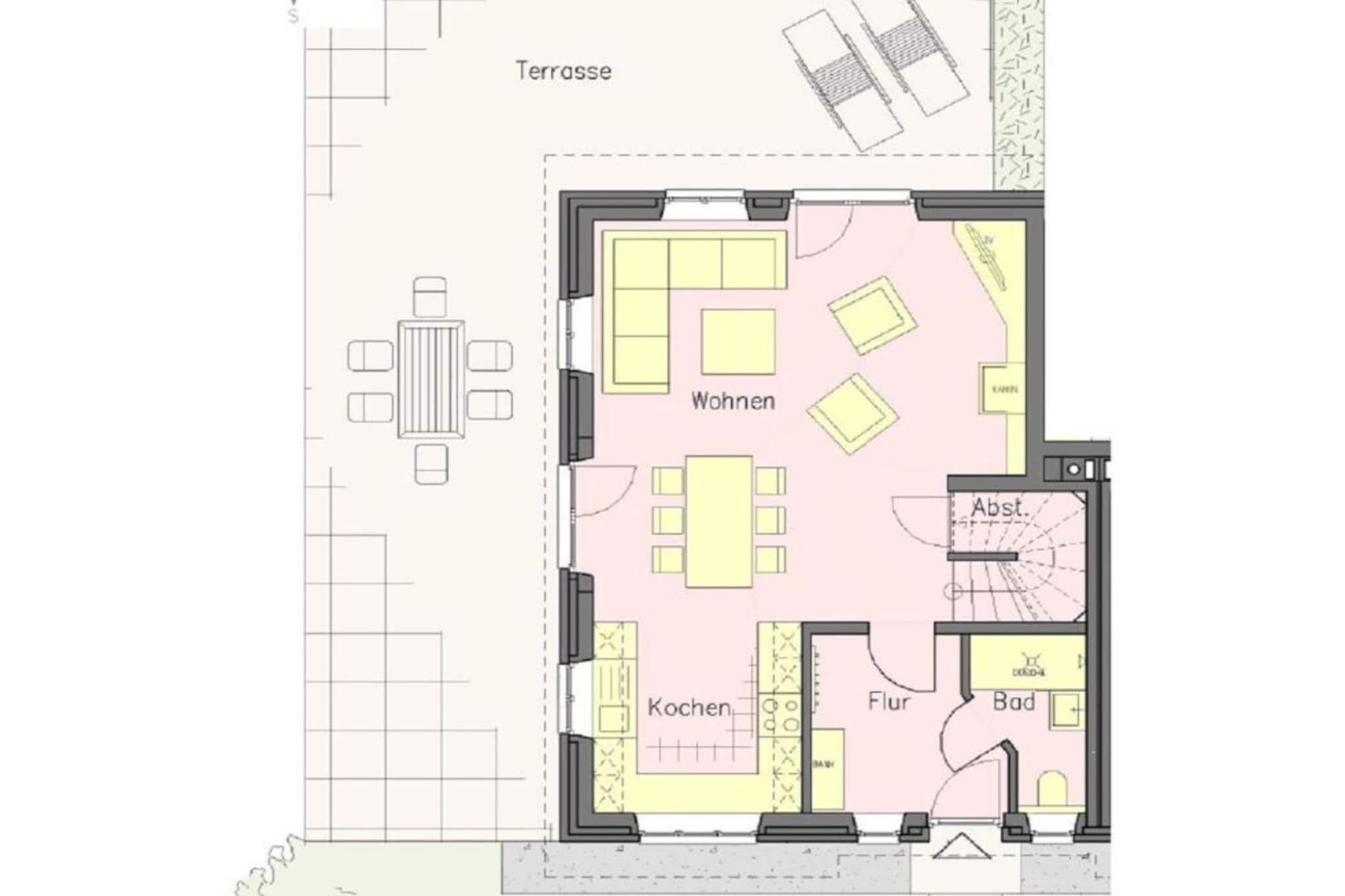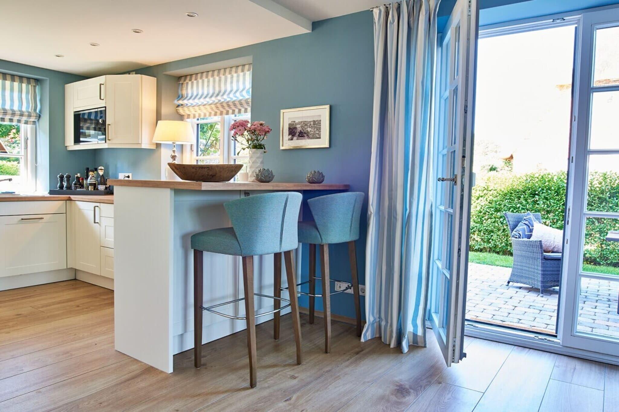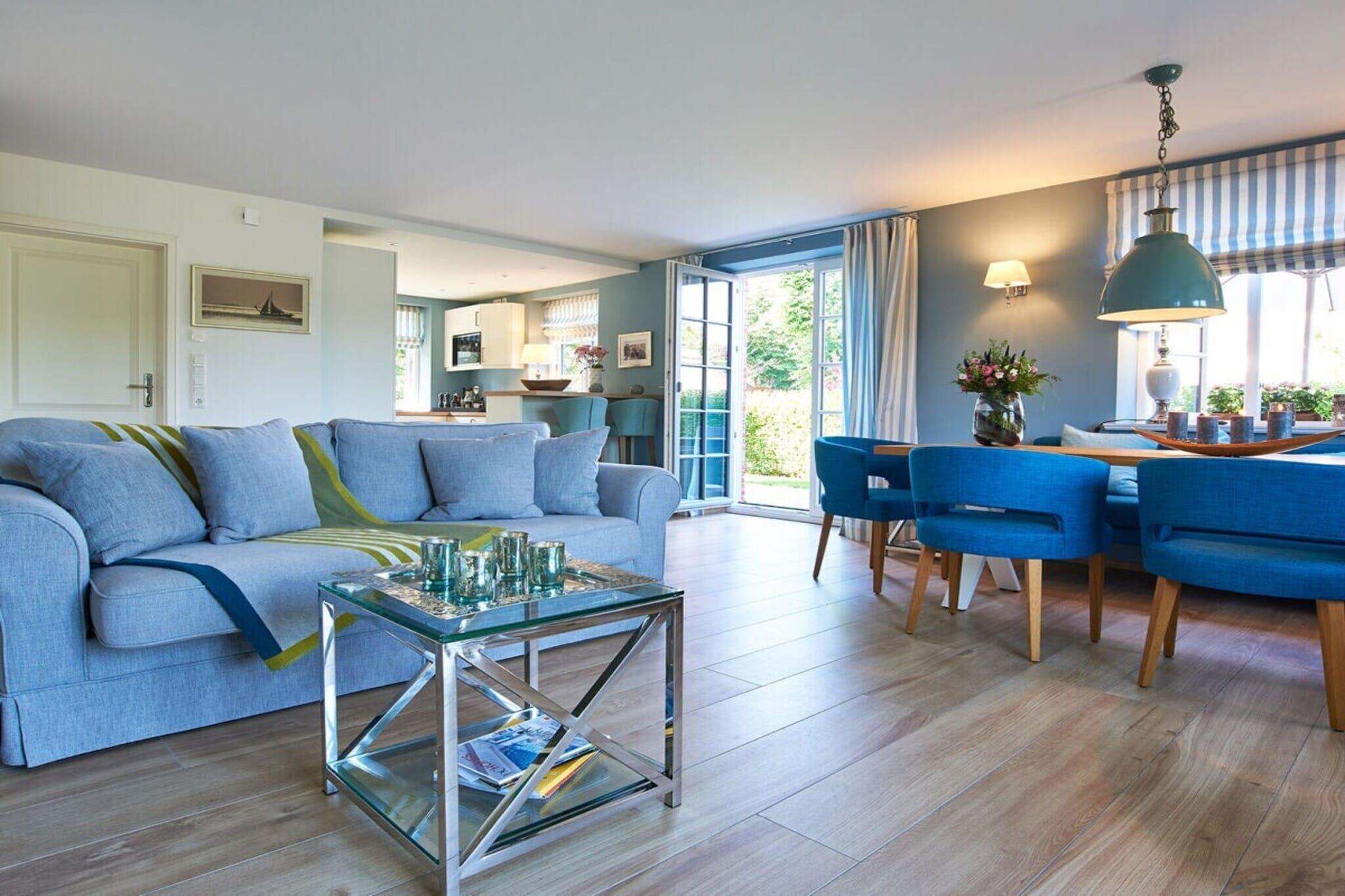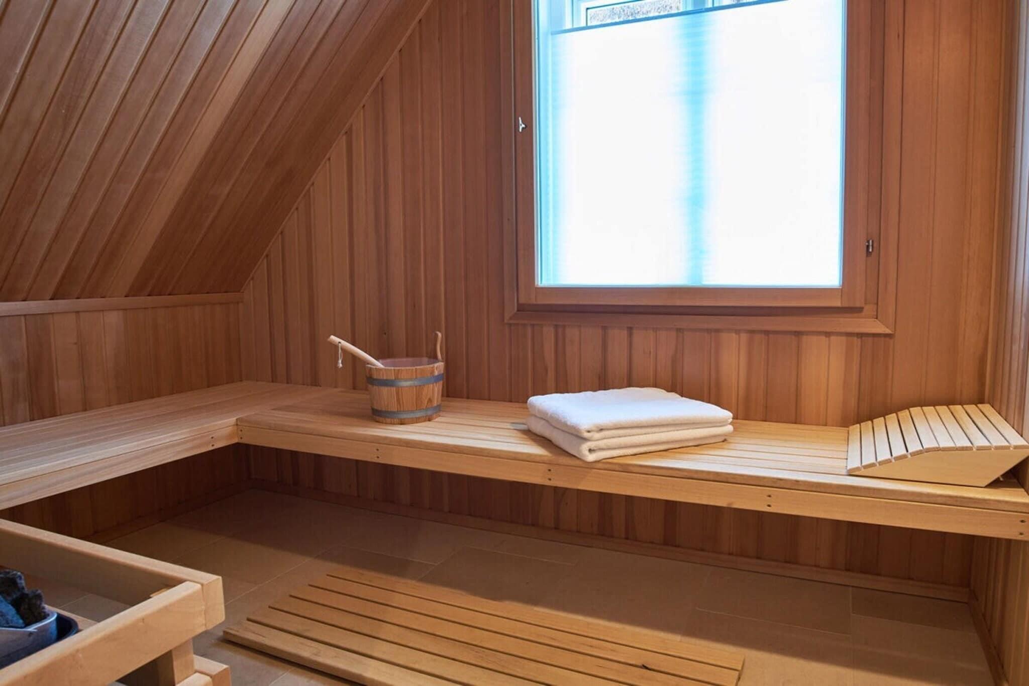 Gennem gangen – forbi brusebadet/toilettet – kommer man ind i den rummelige stue og spisestue, som er fyldt med naturligt lys takket være gulv-til-loft-vinduer og uhindret udsigt. Herfra har man også adgang til den solrige terrasse med en strandstol og sit eget private haveområde. Bagved ligger en hestemark, der sikrer en fredelig ferie med udsigt over de omkringliggende grønne områder. Sofaen og tv'et inviterer til afslapning. Den smukt designede pejs sørger for behagelig og hyggelig varme om vinteren. Hjørnebænken i spiseområdet har komfortabel plads til seks personer. Spiseområdet er let tilgængeligt fra det nye, moderne køkken (med induktionskogeplade). Ovenpå finder man to soveværelser, begge med indbyggede skabe og et tv. Soveværelset har en stor dobbeltseng; det andet soveværelse har to enkeltsenge. Begge soveværelser kan mørklægges for en god nats søvn. Saunaen og det lyse og indbydende badeværelse med en rummelig bruser giver hele familien mulighed for at starte dagen frisk. Et separat, andet brusebad i saunaområdet giver mulighed for samtidig brusning.