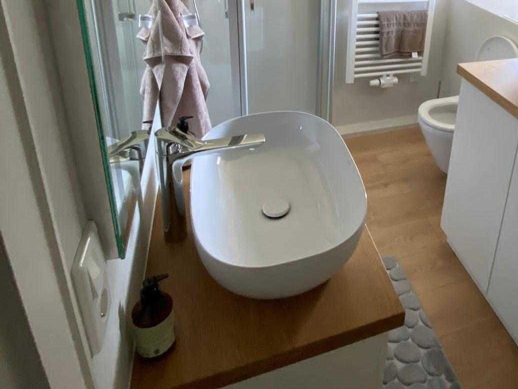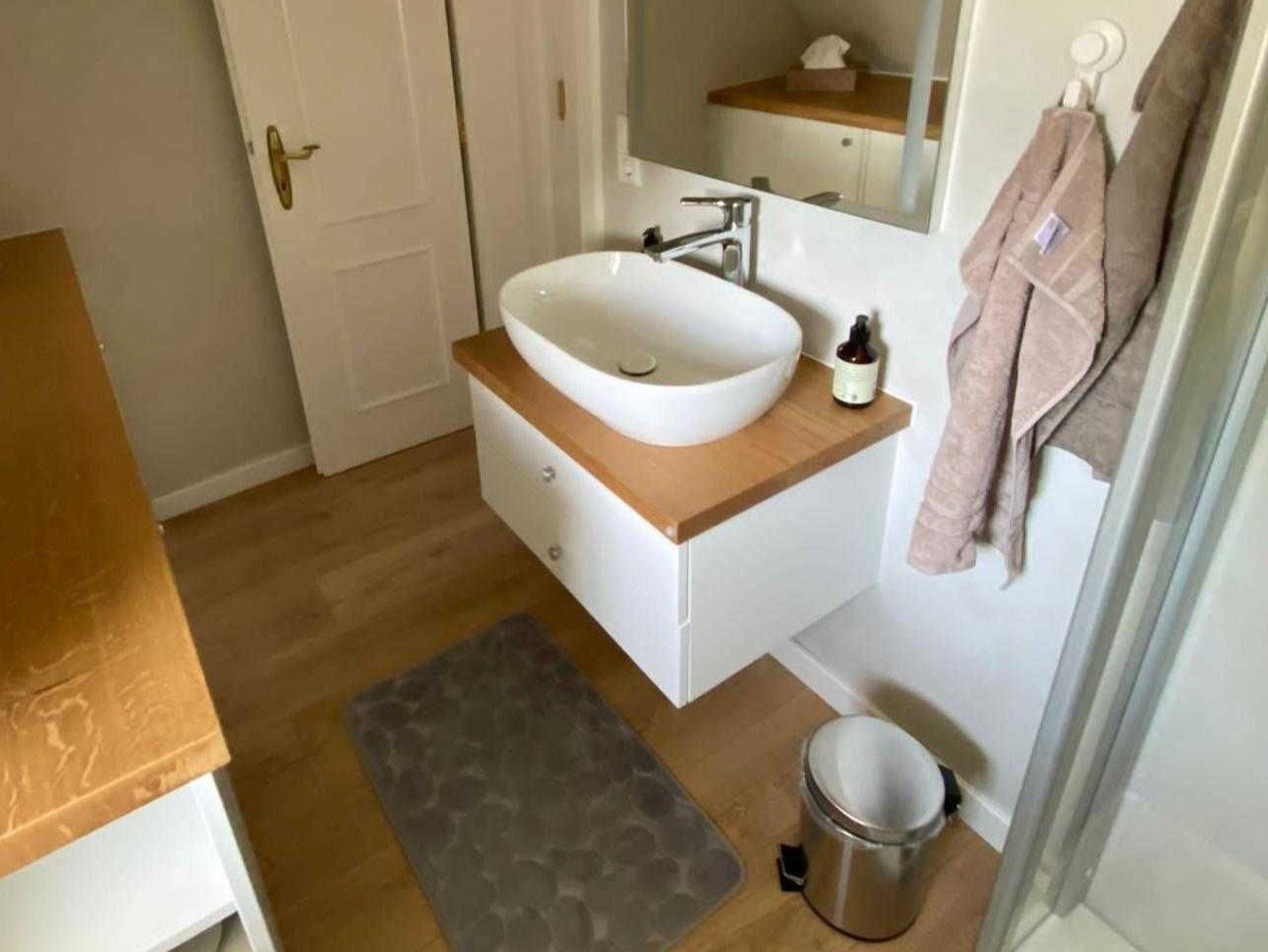 Sanitär: bodenebene Dusche, Föhn, Handtuchheizkörper, Schminkspiegel.