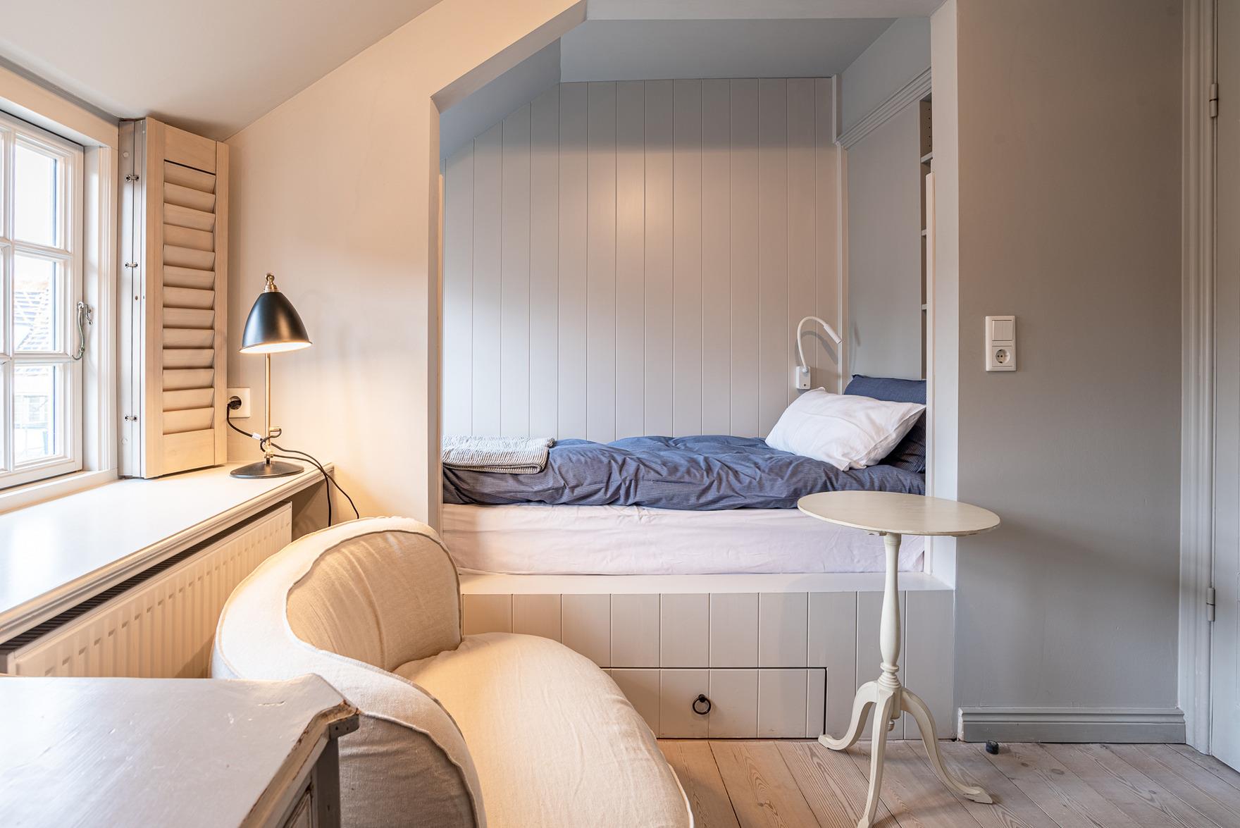 Die kleinere SÖNNES STUUV mit 60 qm wird durch den alten Haupteingang des Hauses betreten. Dem großzügigen Eingangsbereich schließt sich das mit bequemen Sitzmöbeln ausgestattete Wohnzimmer an. In der vollausgestatteten Küche bietet sich der Küchentisch zum ausgiebigen Speisen, Zeitung lesen, langen Gesprächen an. Das Schlafzimmer ist mit einem großen äußerst bequemen Bett und viel Stauraum ausgestattet. Daran anschließend befindet sich das geräumige, moderne Bad, von dem aus sich eine Blickachse durch die gesamte Wohnung, durch das Fenster über Hunderte von Metern in die Allee vor dem Haus eröffnet. Zum Speisen und Verweilen lädt auch eine Sitzecke vor dem Haus ein.