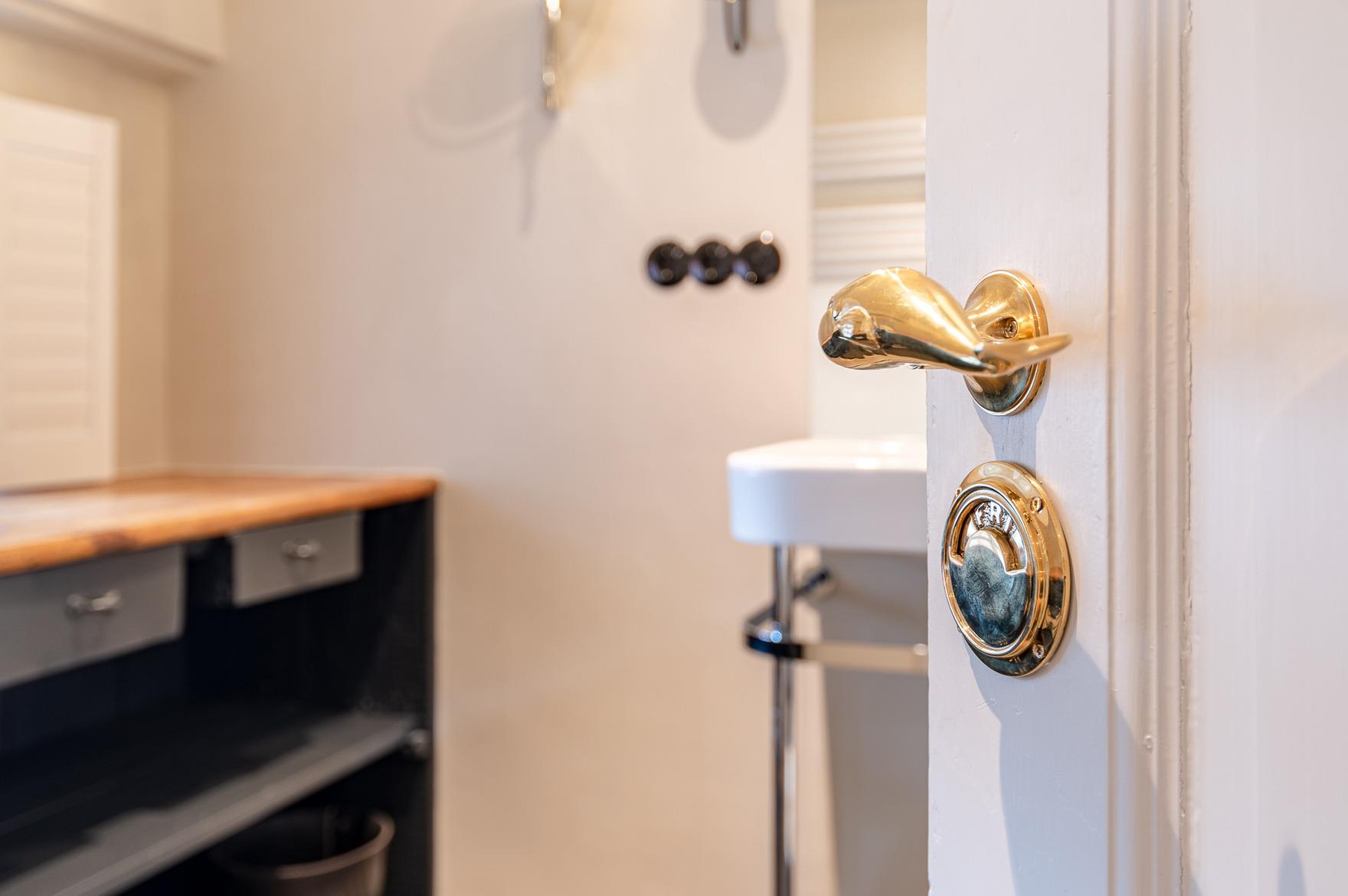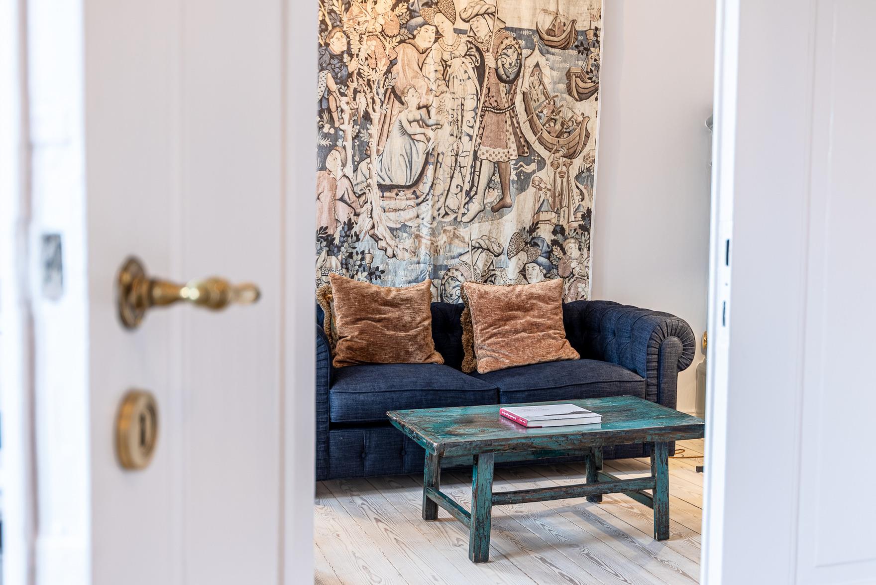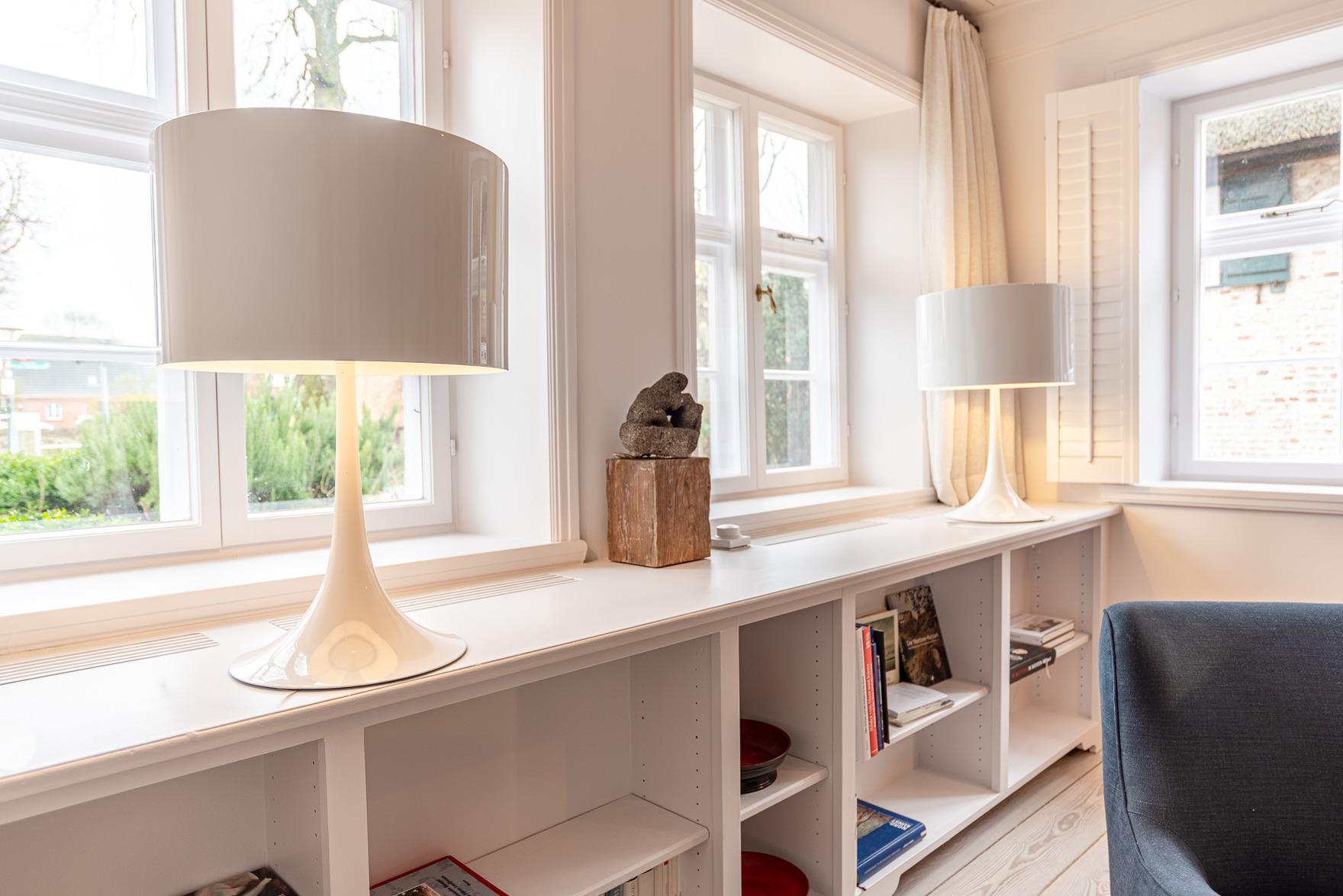 Die kleinere Sönnes Stuuv mit 60qm wird durch den alten Haupteingang des Hauses betreten. Dem großzügigen Eingangsbereich schließt sich das mit bequemen Sitzmöbeln ausgestattete Wohnzimmer an. In der vollausgestatteten Küche bietet sich der Küchentisch zum ausgiebigen Speisen, Zeitung lesen, langen Gesprächen an. Das Schlafzimmer ist mit einem großen äußerst bequemen Bett und viel Stauraum ausgestattet. Daran anschließend befindet sich das geräumige, moderne Bad, von dem aus sich eine Blickachse durch die gesamte Wohnung , durch das Fenster über Hunderte von Metern in die Allee vor dem Haus eröffnet. Hervorzuheben ist auch hier die stilsichere Ausstattung sowie wiederum Gemälde des Nieblumer Malers Fritz Chors (1884 - 1962). Zum Verweilen lädt auch eine Sitzecke vor dem Haus ein.