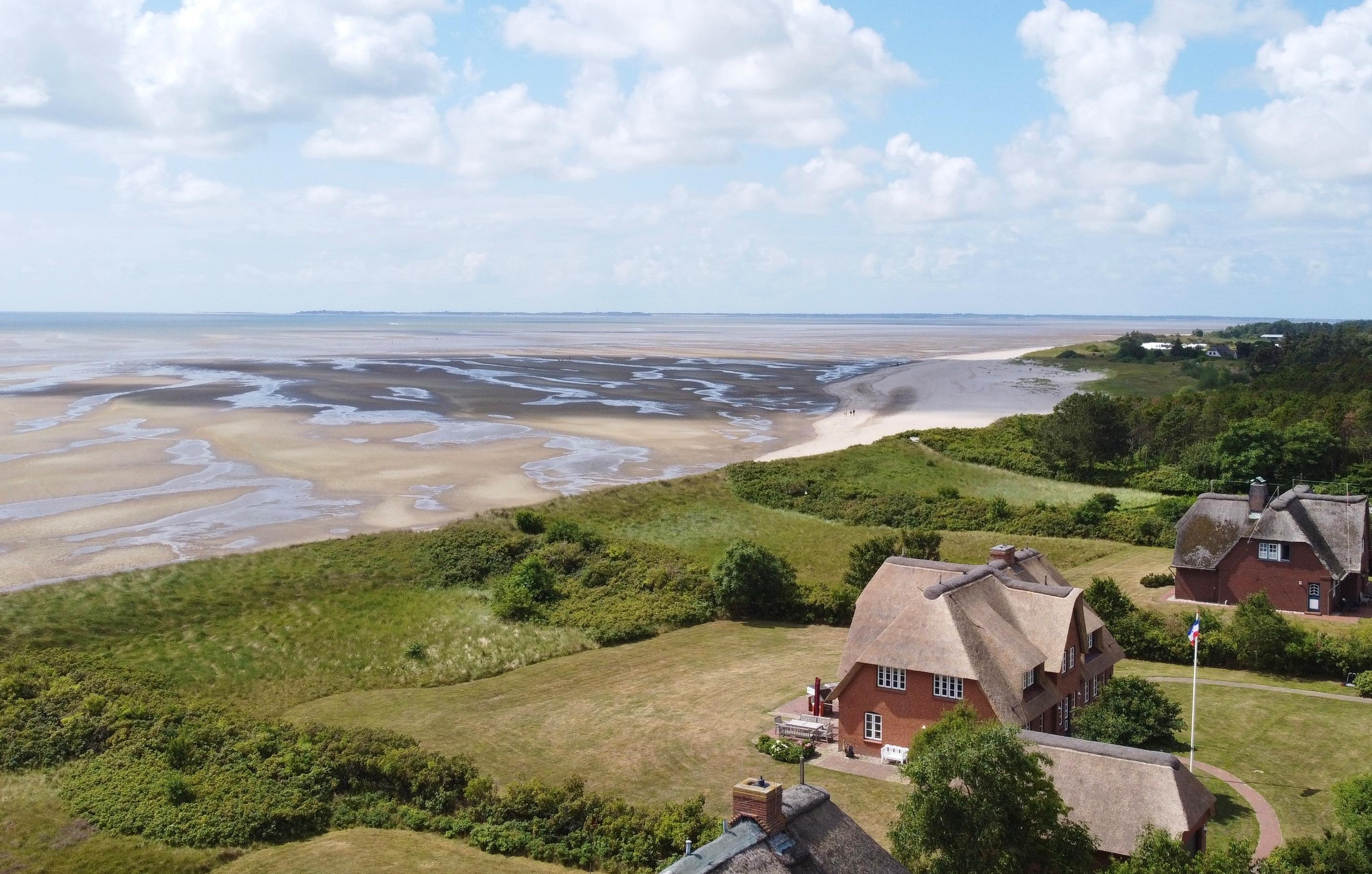 Wohnen Sie in der ersten Reihe am Meer – direkt an der Düne in Bredland. Bredland gehört zu den besten Lagen auf Föhr und gehört zu Nieblum. Kleine „Warften“ prägen das Bild, und die Nordsee ist quasi „vor der Tür“. Das exklusive Reetdachhaus wurde 1992 erbaut und bietet aus dem Obergeschoss einen atemberaubenden Meerblick auf die Nordsee und die Halligen.