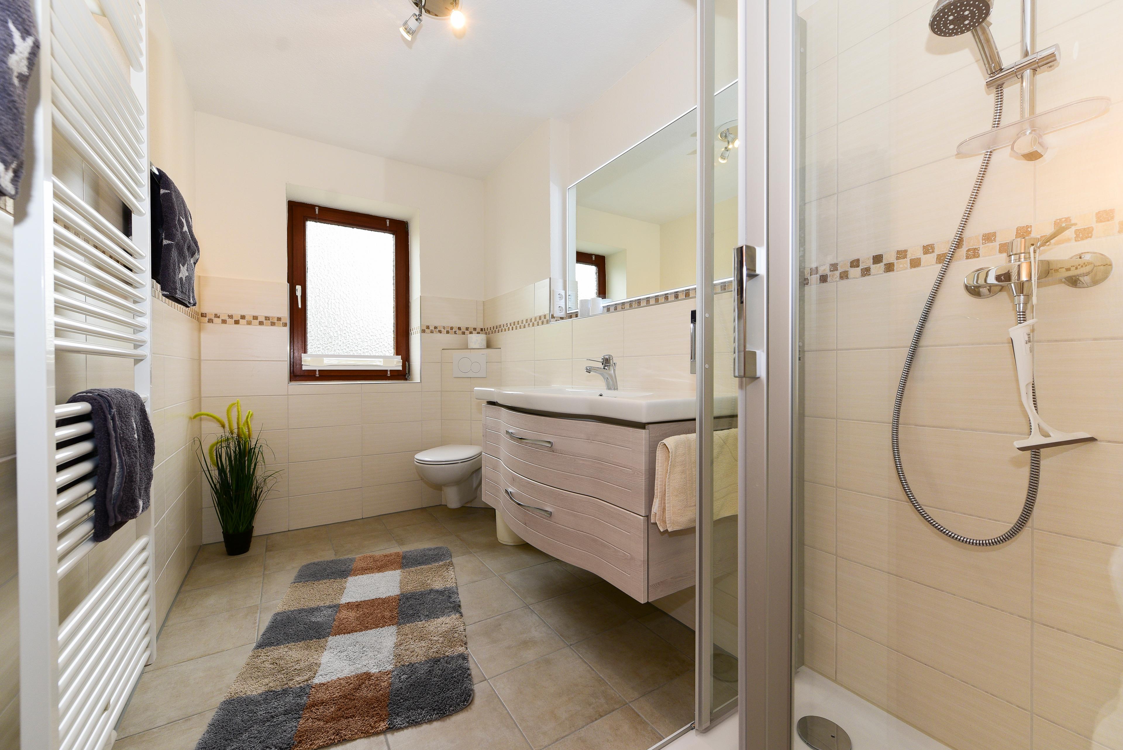 Das Duschbad ist in warmen Tönen gefliest und verfügt über ein Außenfenster, das für Licht und frische Luft sorgt.