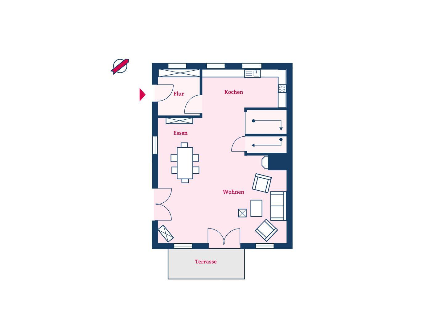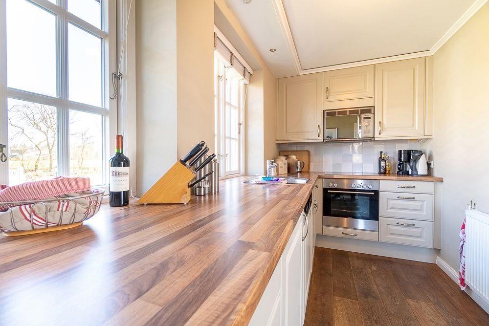 Im Erdgeschoss befindet sich das großzügige, lichtdurchflutete Wohn- und Esszimmer mit offener Küche. Von hier aus gelangen Sie direkt auf die eigene Terrasse mit Strandkorb und in den Garten. Der Original Mylin-Kachelofen im Wohnbereich sorgt auch an kühleren Tagen für eine angenehme Atmosphäre.