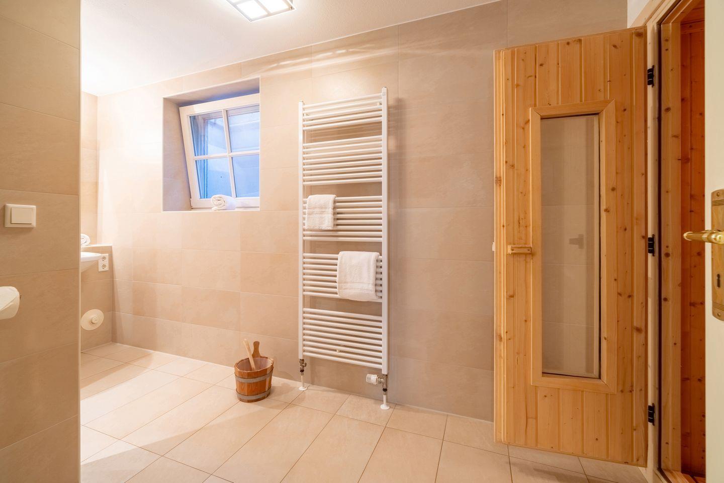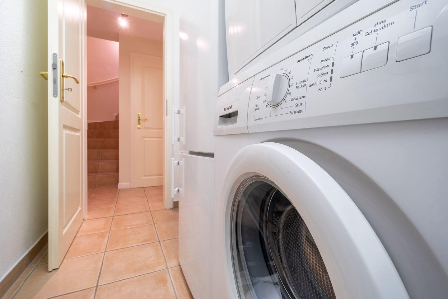 Im Souterrain finden Sie das zweite Duschbad mit einer bodengleiche Regendusche sowie die hauseigene Sauna vor. Zudem befindet sich in dieser Etage ein Hauswirtschaftsraum mit Waschmaschine und Trockner.
