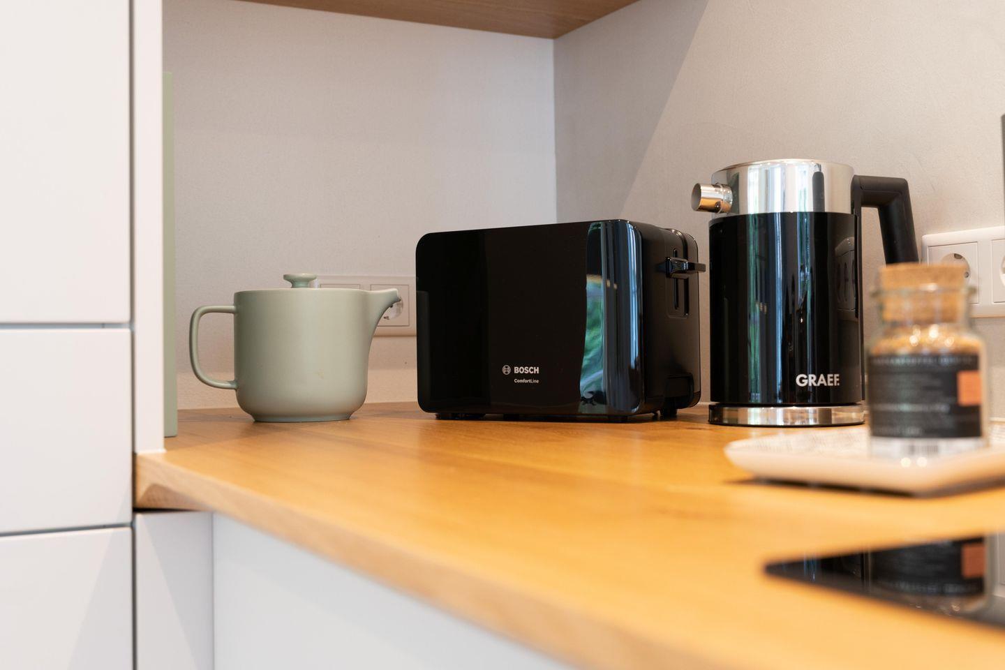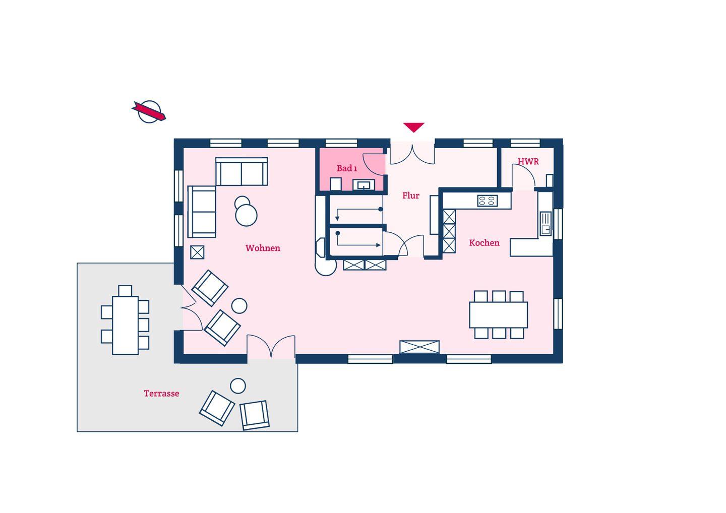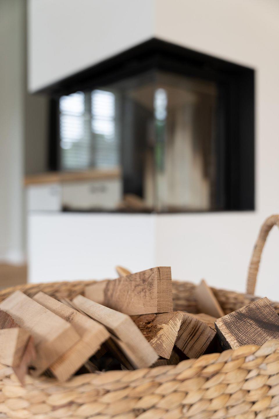 Im Erdgeschoss befinden sich der großzügige Wohn- und Essbereich mit offener Küche sowie ein Gäste-WC. Vom Wohnbereich aus gelangen Sie in den Garten und auf die beiden Terrassen. Der Kamin sorgt auch an kühleren Tagen für eine wohlige Atmosphäre.