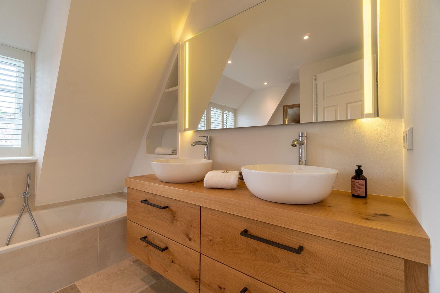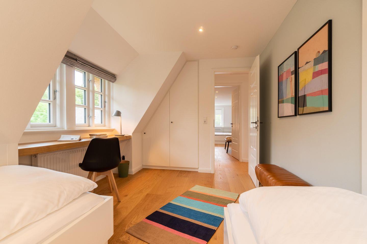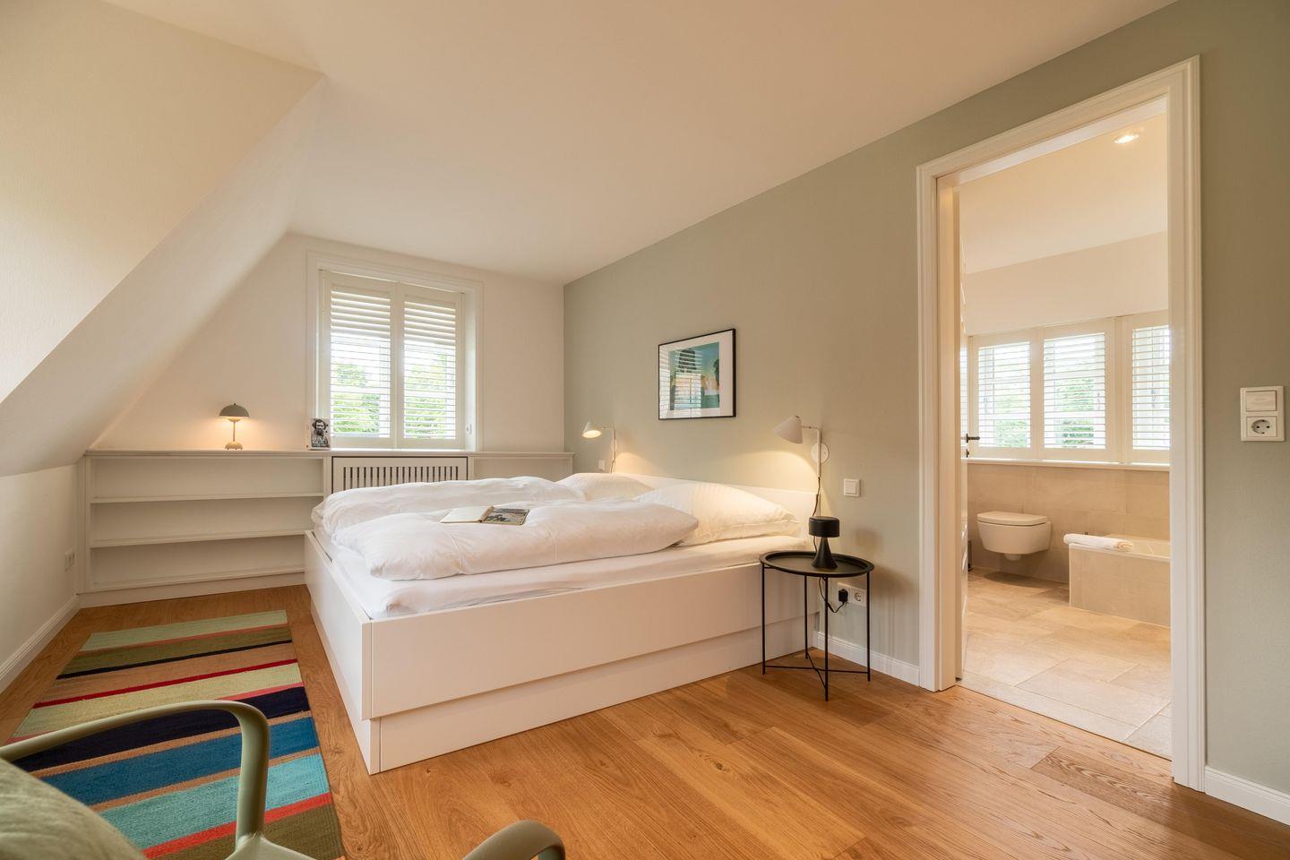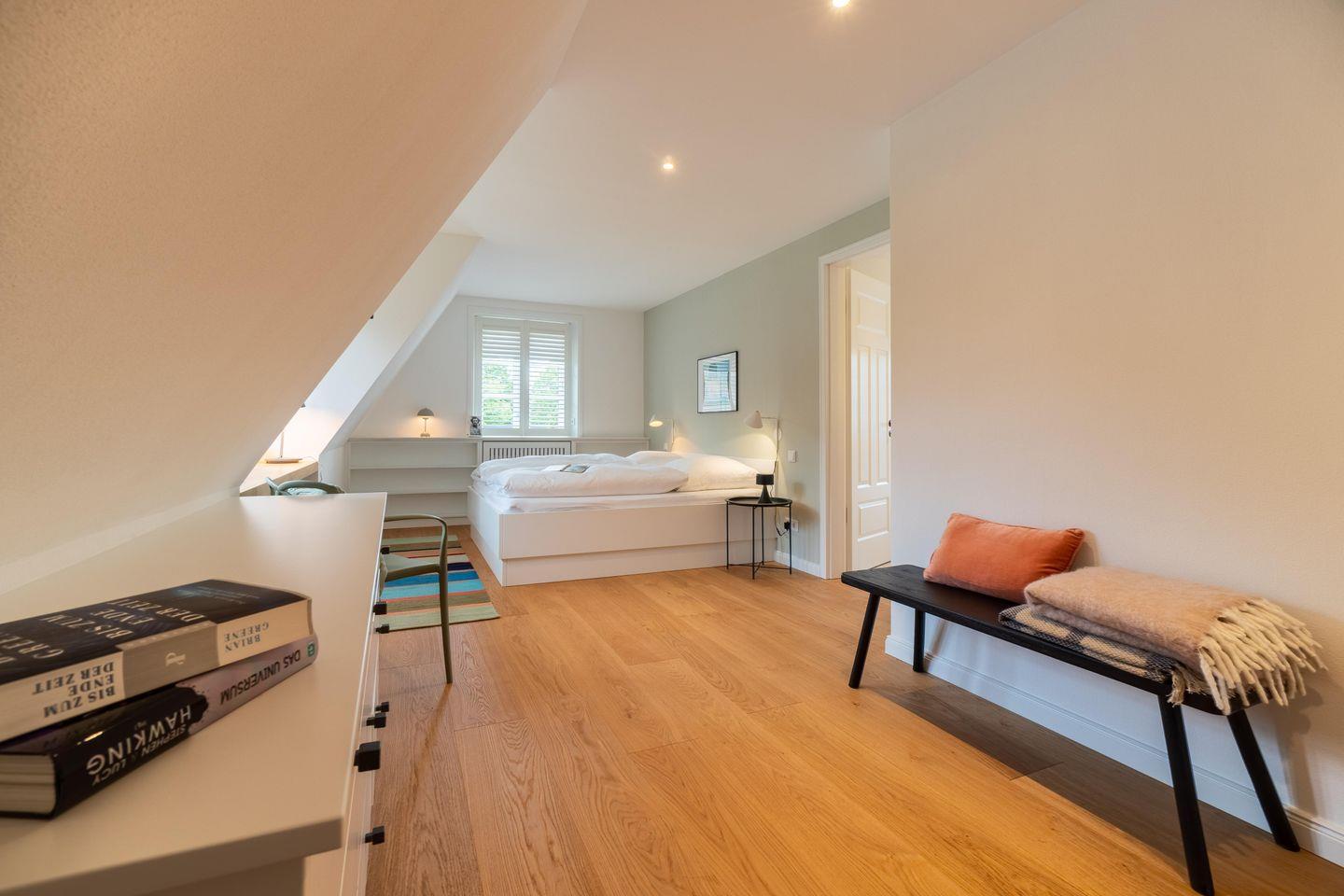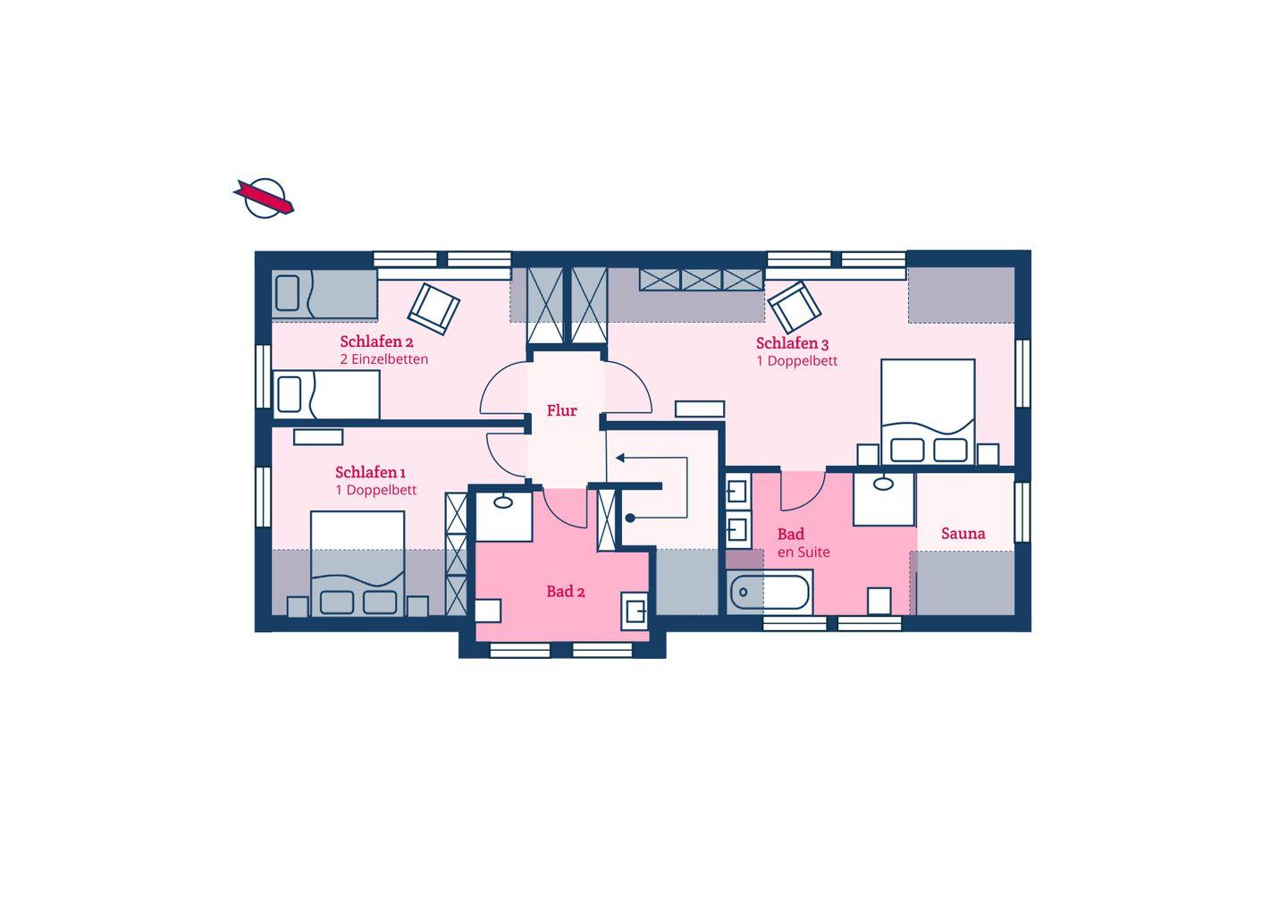 Im Obergeschoss befinden sich die drei Schlafzimmer - zwei mit einem Doppelbett und eines mit zwei Einzelbetten - sowie ein Vollbad mit Sauna und ein Duschbad.