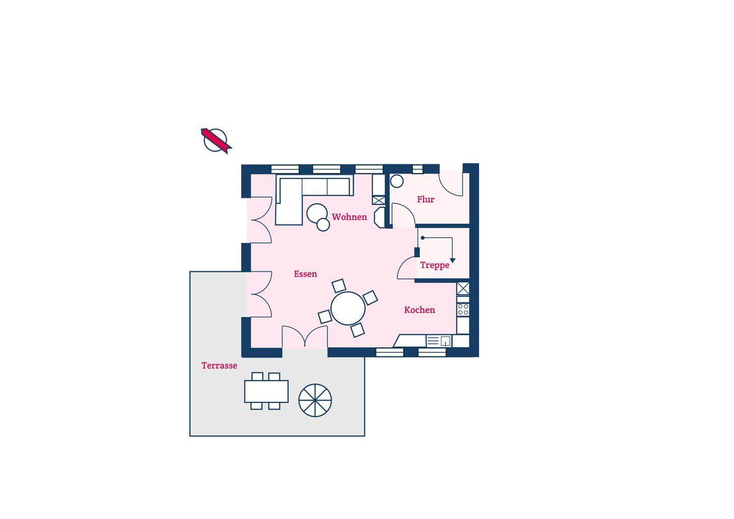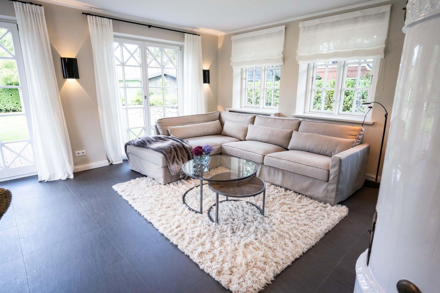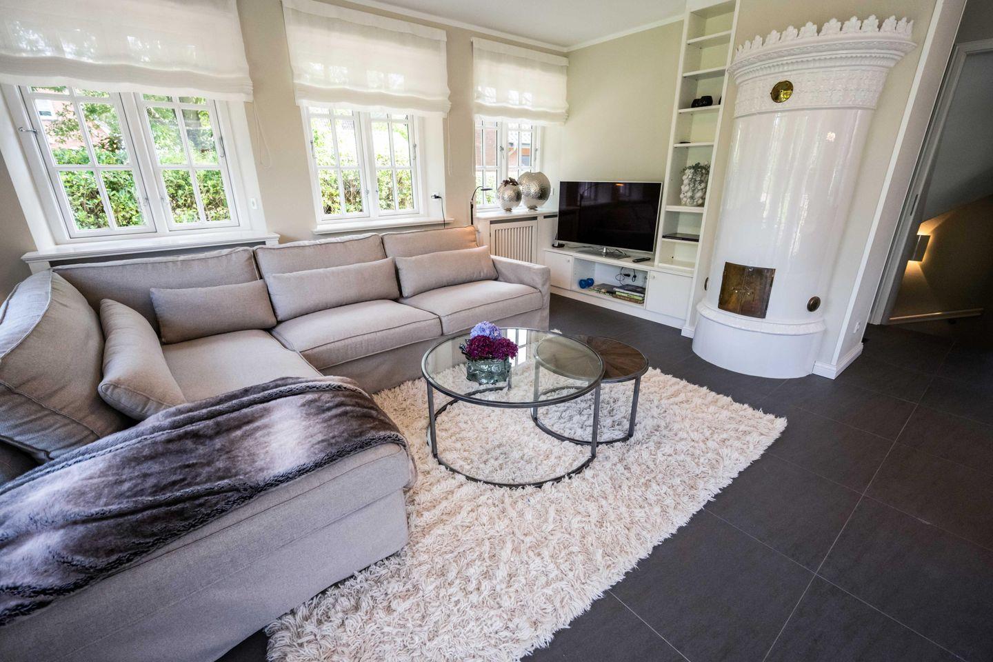 Im Erdgeschoss befindet sich das großzügige Wohn- und Esszimmer mit offener Küche und direktem Zugang zur hauseigenen Terrasse und in den Garten. Der Original Mylin-Kachelofen im Wohnbereich sorgt auch an kühleren Tagen für eine angenehme Atmosphäre.
