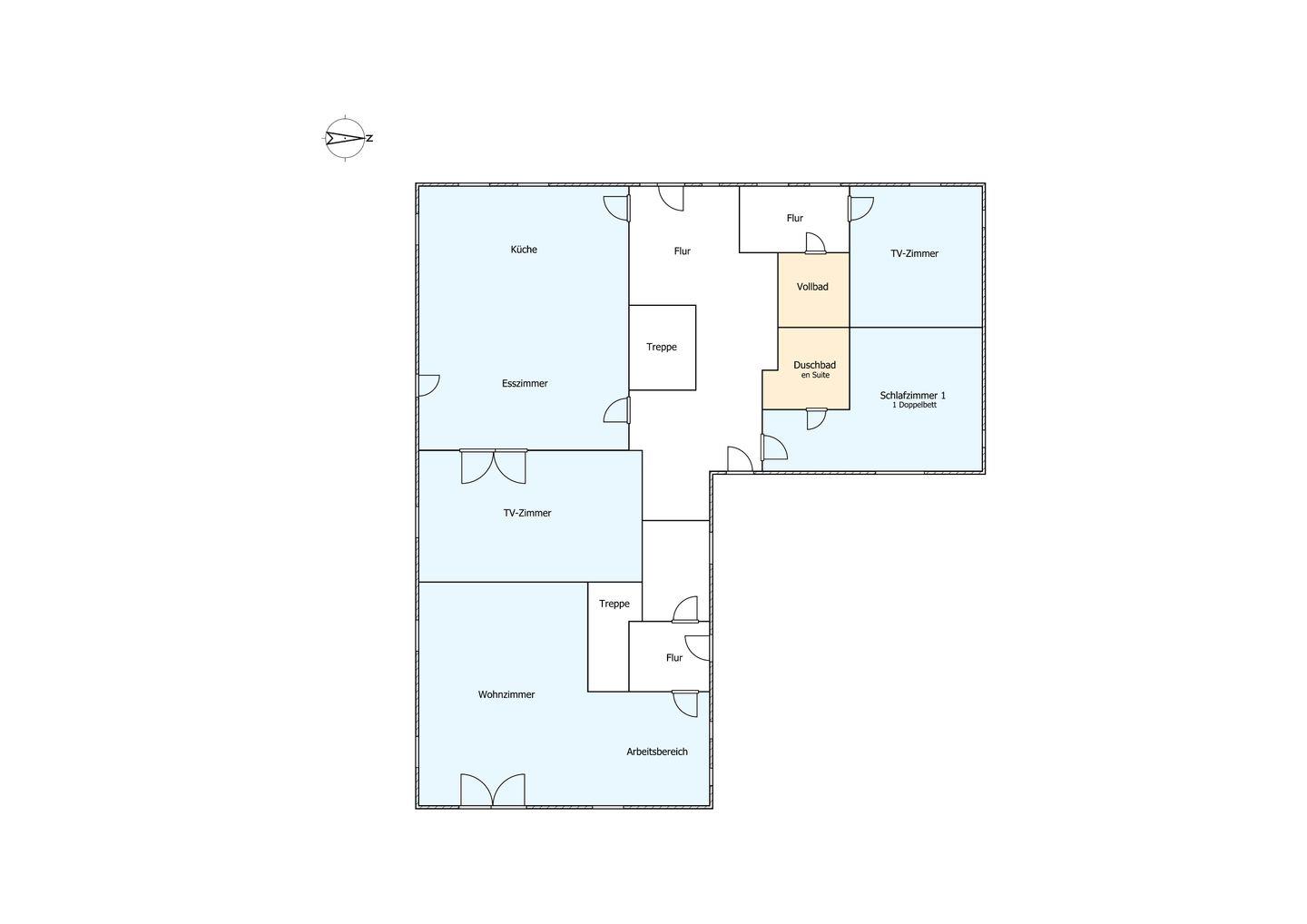 Im Obergeschoss sind die vier weiteren Schlafzimmer - drei mit je einem Doppelbett und eines mit zwei Einzelbetten -, das dritte TV-Zimmer sowie das zweite Vollbad gelegen. Drei der Schlafzimmer verfügen jeweils über ein Duschbad en Suite.