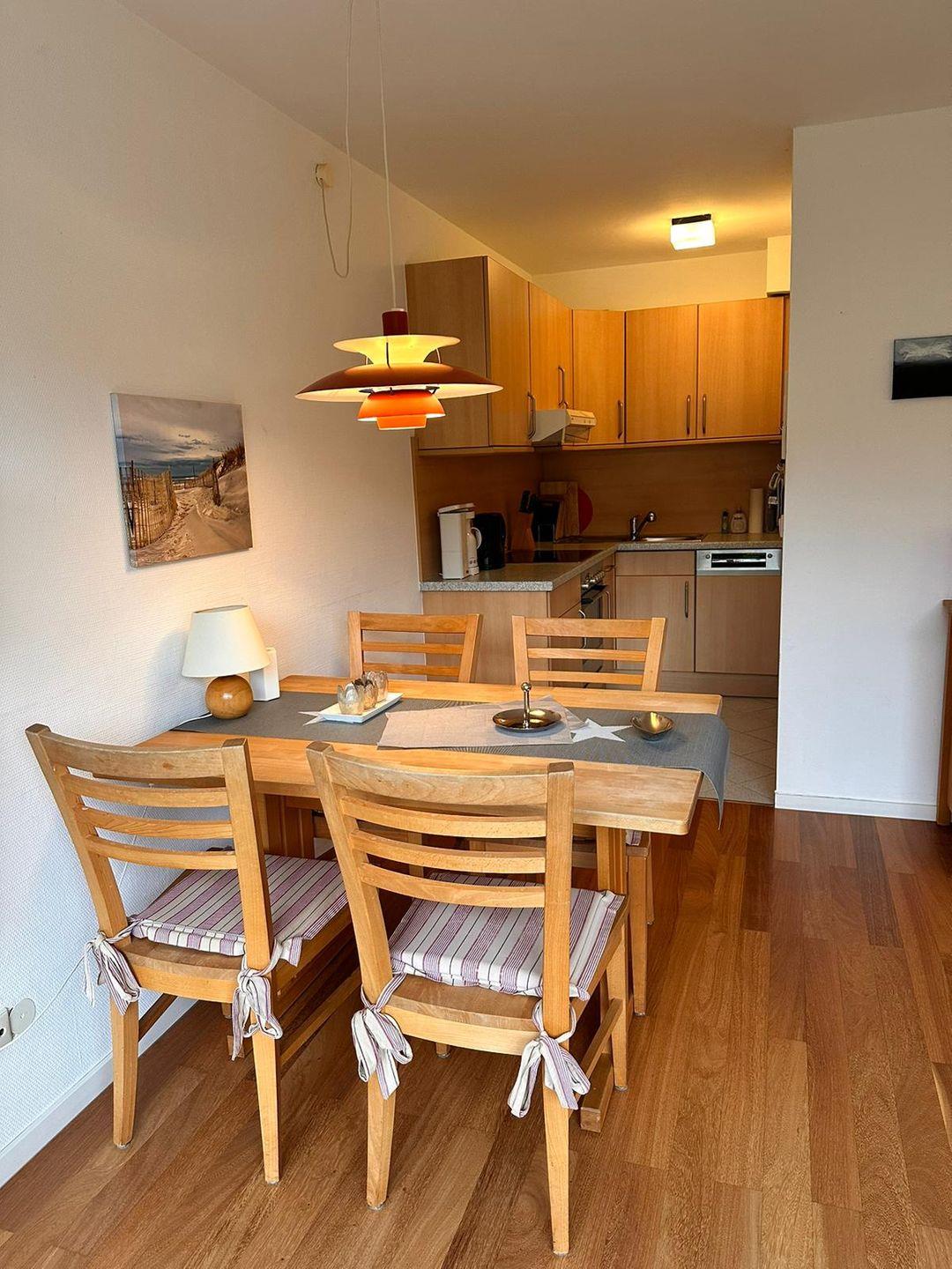 Helle 2-Zimmer-Ferienwohung im Erdgeschoss. Die gemütliche Wohnung verfügt über einen offenen Wohn-Ess-Küchenbereich mit Zugang zur Terrasse, ein separates Schlafzimmer mit Doppelbett (Bettmaße 2*90*200cm) sowie ein modernes Duschbad. Den Sandstrand in Nieblum erreichen Sie in wenigen Gehminuten. Den Sandstrand in Nieblum erreichen Sie in wenigen Gehminuten. Das Haus liegt unweit des Dorfteiches Bi de Meere. Parkplätze für Fahrräder und PKW liegen direkt beim Haus.