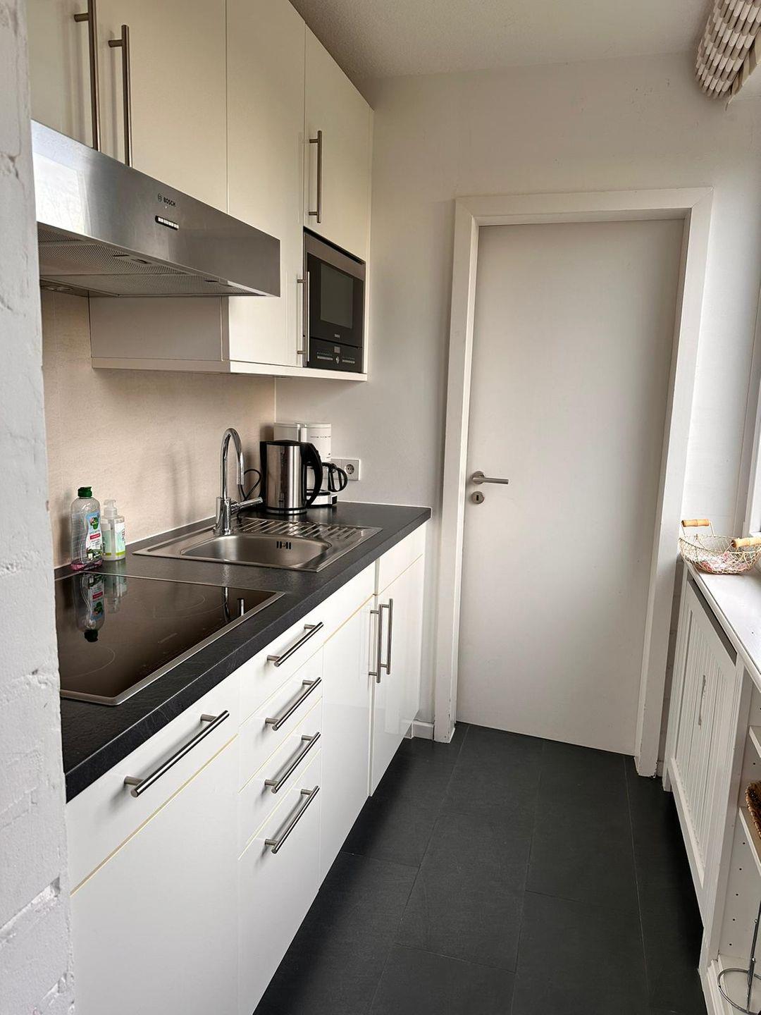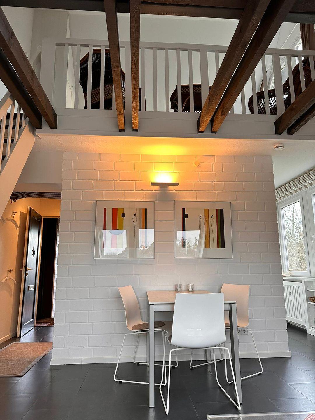 Helle 3-Zimmer-Ferienwohnung im Obergeschoss. Die gemütliche Wohnung verfügt über einen großen Wohn- Essbereich mit Zugang zur kleinen, aber gut ausgestatteten Küche. Das Schlafzimmer mit Doppelbett befindet sich auf der Galerie (Bettmaße 2*90*200cm). Zusätzlich gibt es ein separates Schlafzimmer auf der Hauptebene mit einem sogenannten Tandembett (je 80*190cm). Den Sandstrand in Nieblum erreichen Sie in wenigen Gehminuten.