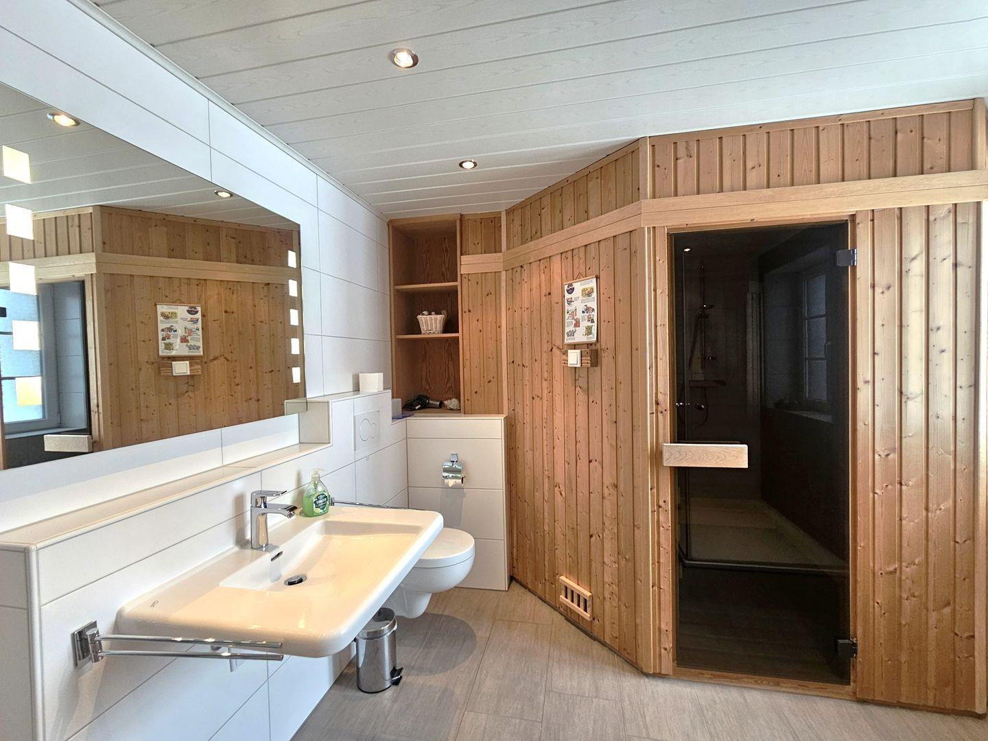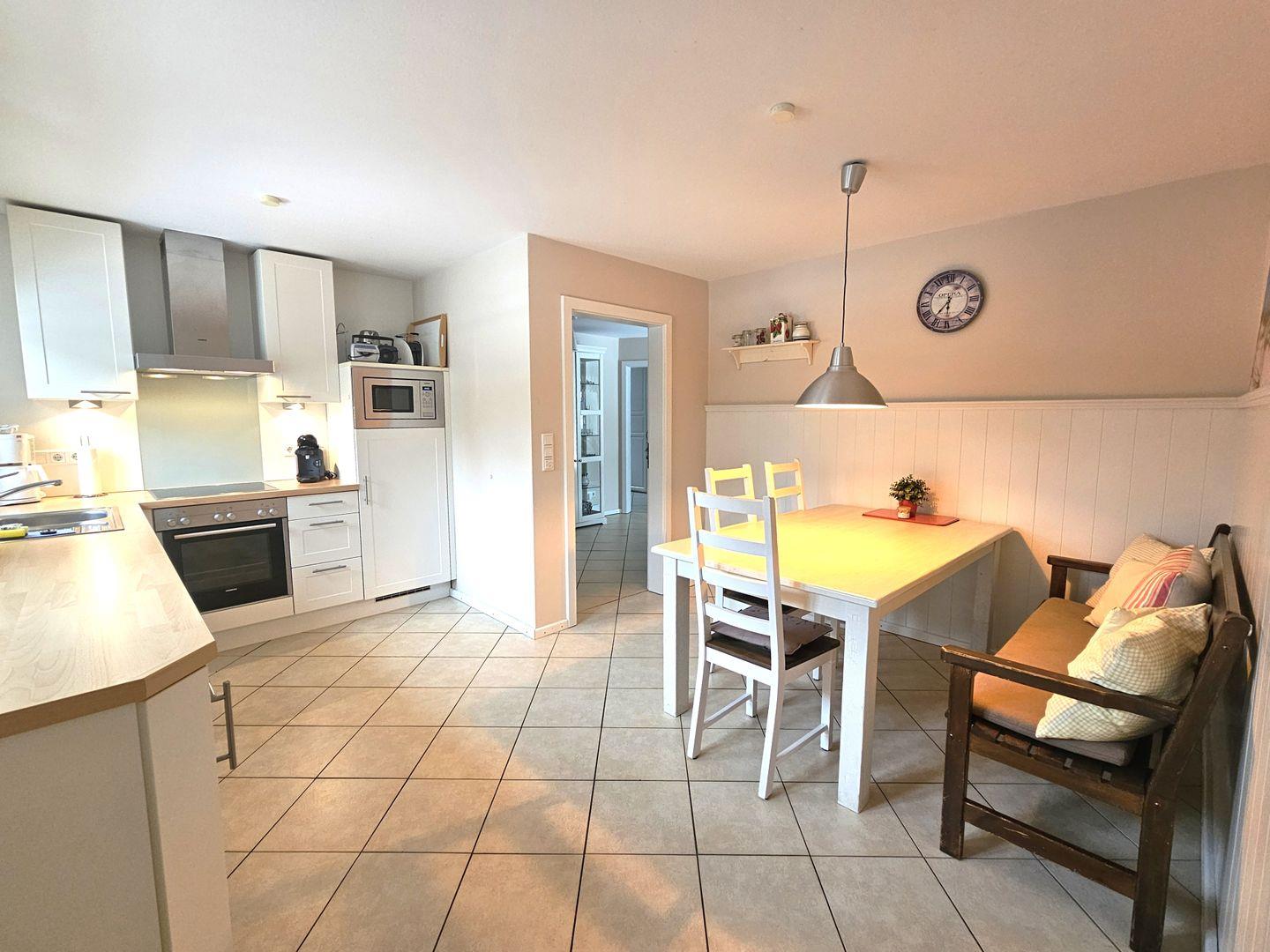 Die geschlossene Küche mit Esstisch ist separat gehalten und umfangreich ausgestattet: 4-Platten-Herd, Backofen, Mikrowelle, Kühlschrank mit Gefrierfach, Spülmaschine, Toaster, Wasserkocher und Kaffeemaschine sowie Geschirr, Besteck und Küchenutensilien. Für längere Aufenthalte stehen Ihnen Waschmaschine und Trockner zur Eigennutzung zur Verfügung; Bügeleisen und Bügelbrett ergänzen die praktische Ausstattung.