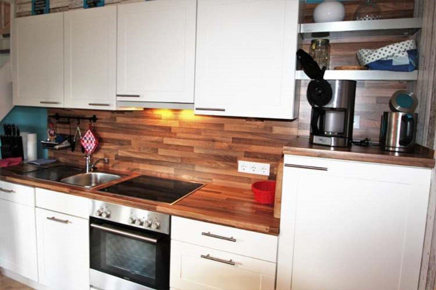 Der Wohnbereich ist mit Laminatboden, Sofa, TV sowie Radio und DVD-Spieler ausgestattet. Direkt angeschlossen befindet sich die offene Küche zum Wohnzimmer, sodass Kochen und Beisammensein angenehm verbunden sind. In der Küche stehen Ihnen ein 4-Platten-Herd mit Backofen, Kühlschrank mit Gefrierfach, Spülmaschine sowie Kaffeemaschine, Wasserkocher, Toaster und Eierkocher zur Verfügung. Geschirr, Besteck und Küchenutensilien sind vorhanden; ein Essbereich mit Esstisch rundet den Wohnraum funktional ab.